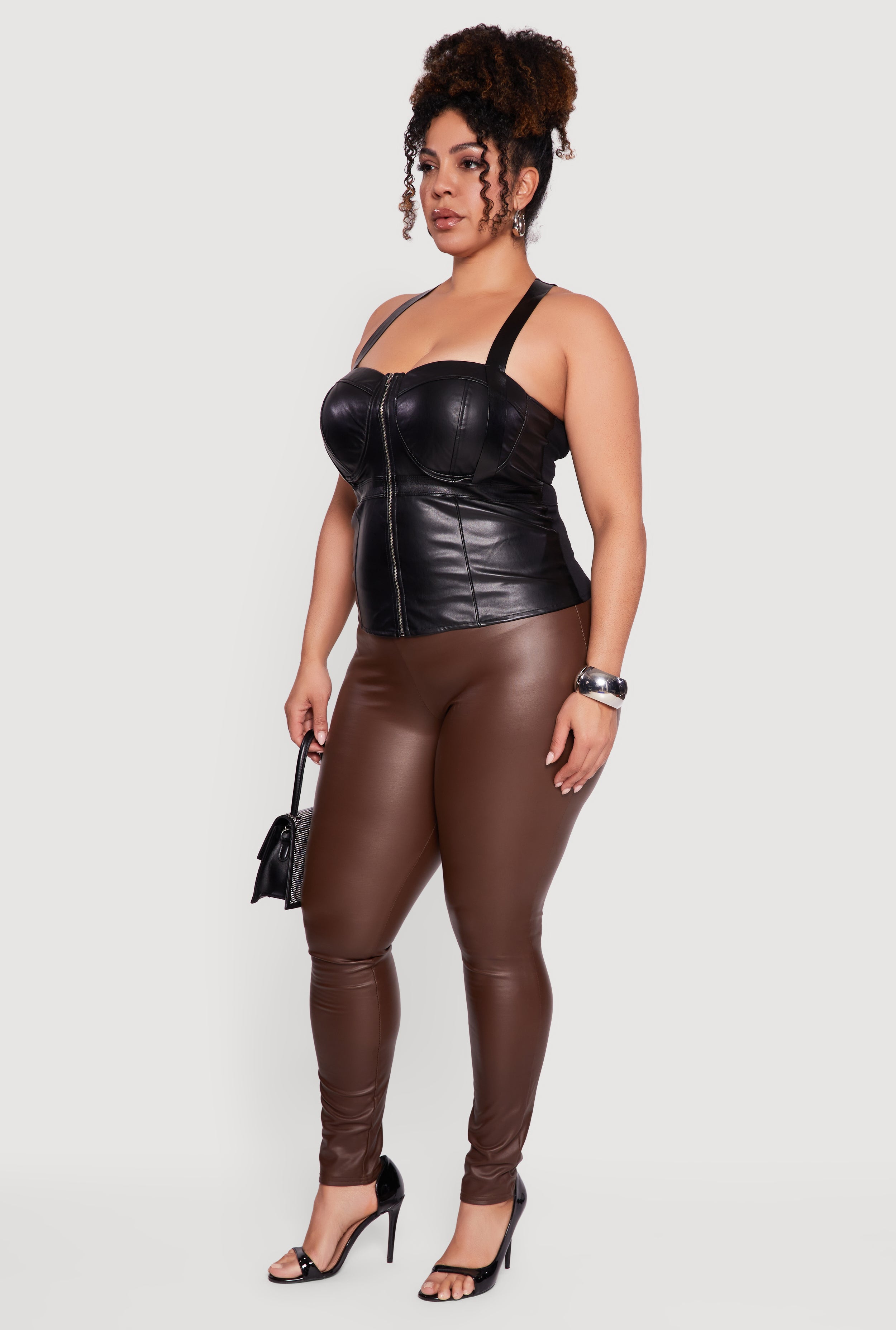 This plus size bustier top features a sweetheart neckline and a classic fit that flatters the silhouette. Crafted from faux leather with a soft fleece lining, it offers a sleek look with practical stretch. The front zipper and padded cups add structure and support for a confident fit.