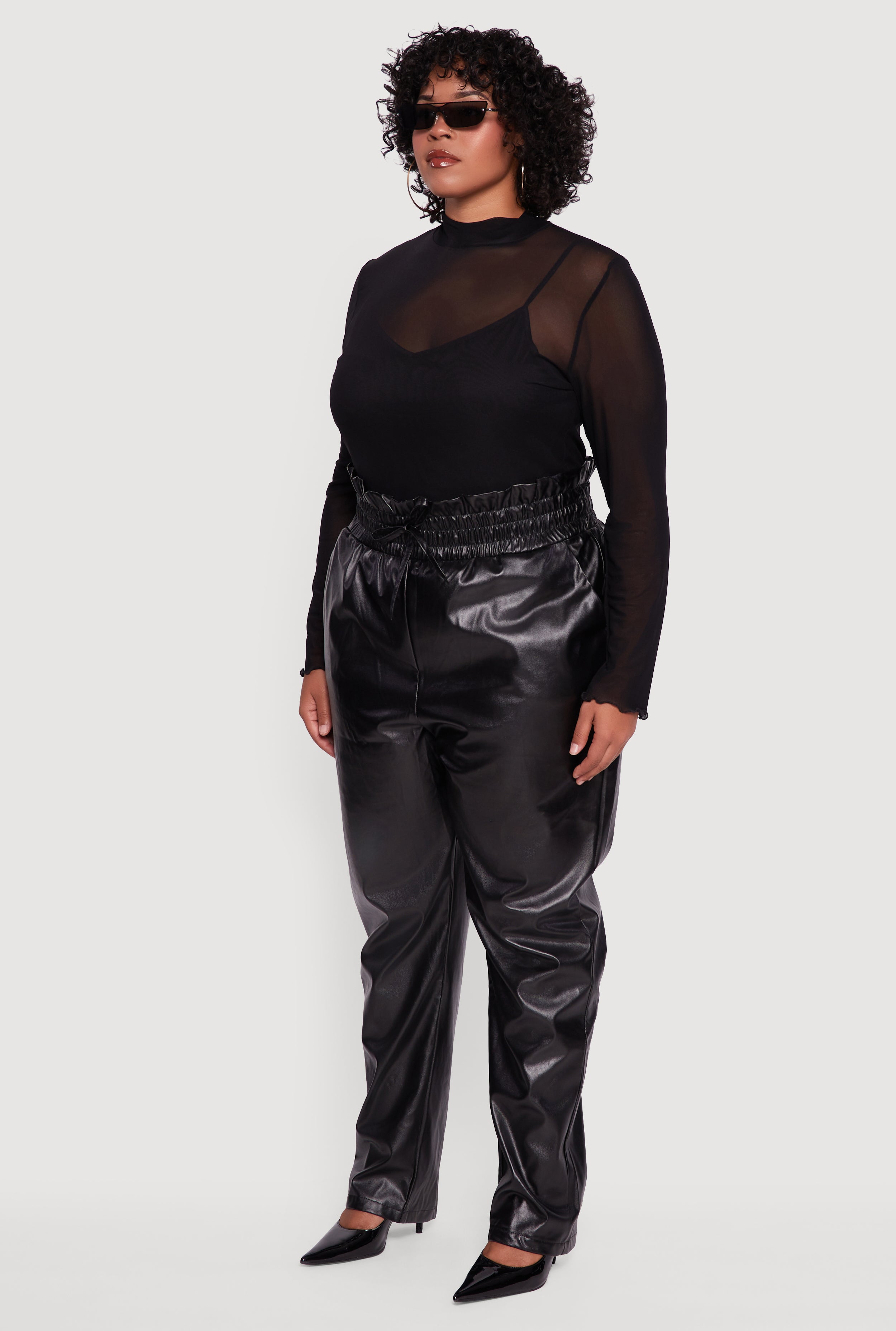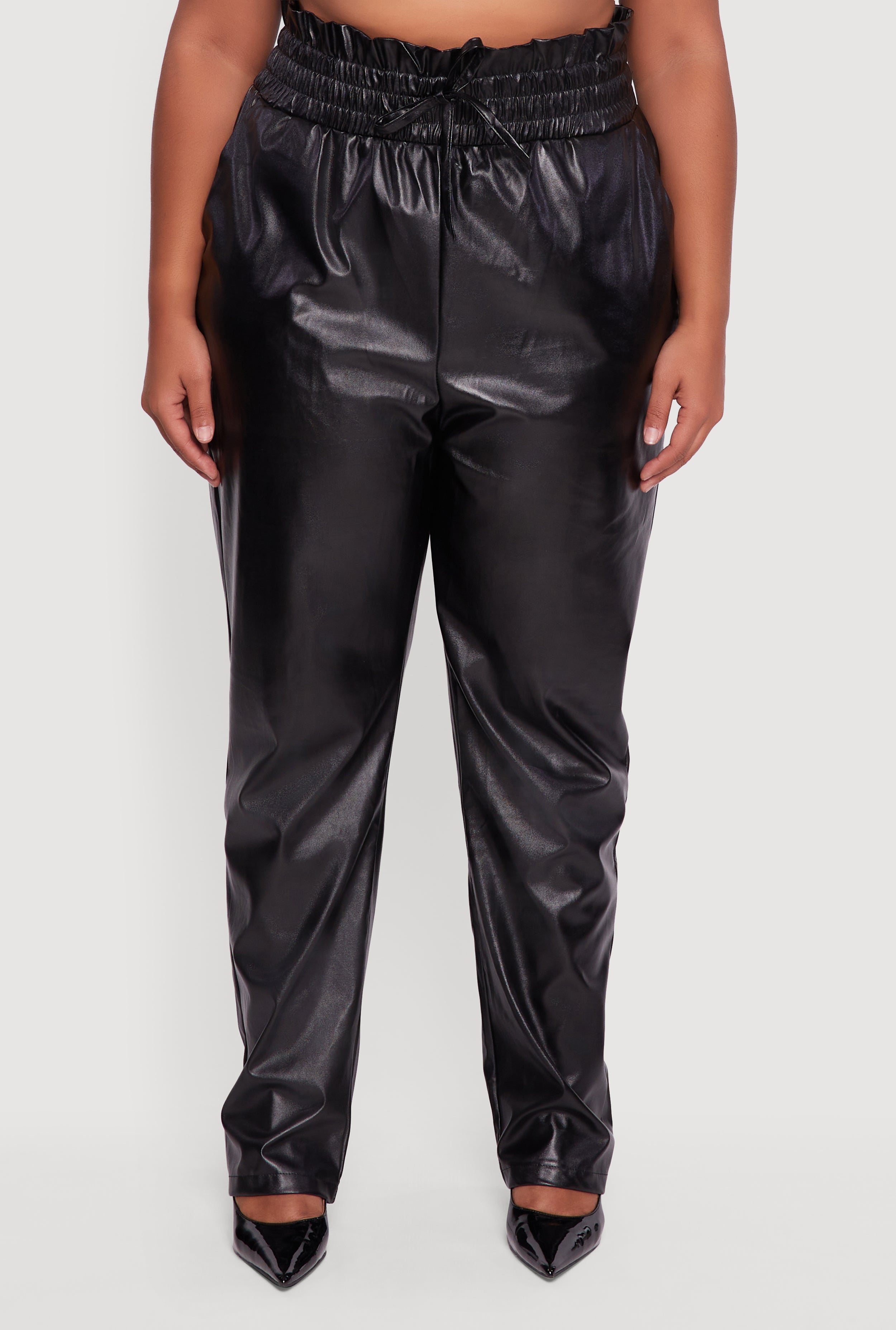 Step up your style game with these Plus Size Faux Leather Paper Bag Waist Pants that bring the perfect mix of edgy and comfy. The sleek faux leather and slim leg cut hug your curves just right, while the trendy paper bag waist adds a touch of flair. Whether you're heading out for a night on the town or a party with friends, these pants pull on easily and keep you looking effortlessly cool. Get ready to turn heads without breaking the bank.