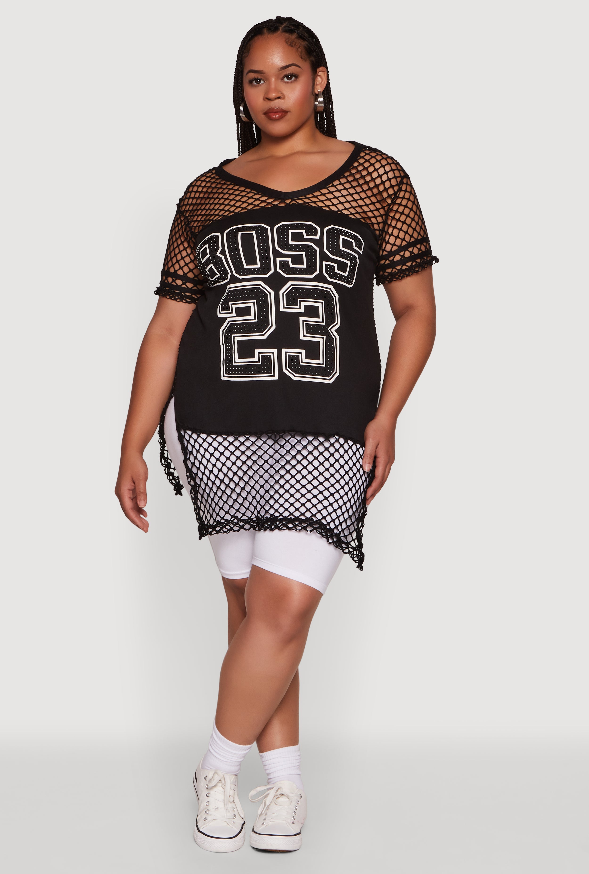 Make a bold statement with the Plus Size Fishnet Boss 23 Rhinestone Graphic Top. Featuring a fierce "Boss 23" graphic and eye-catching rhinestones, this sheer fishnet tee is perfect for turning heads and showing off your confident style. The classic fit and timeless silhouette ensure you look effortlessly chic, while the side slit adds a touch of flair. Whether you're dressing up or keeping it casual, this top is your new go-to for making a statement that’s all about you.