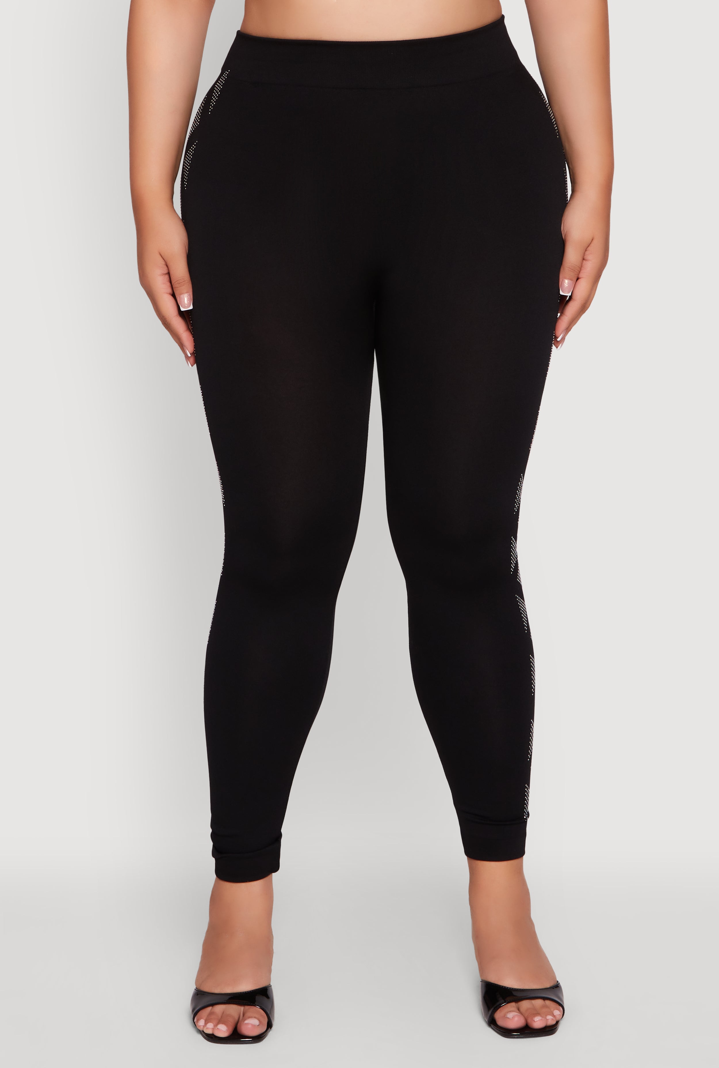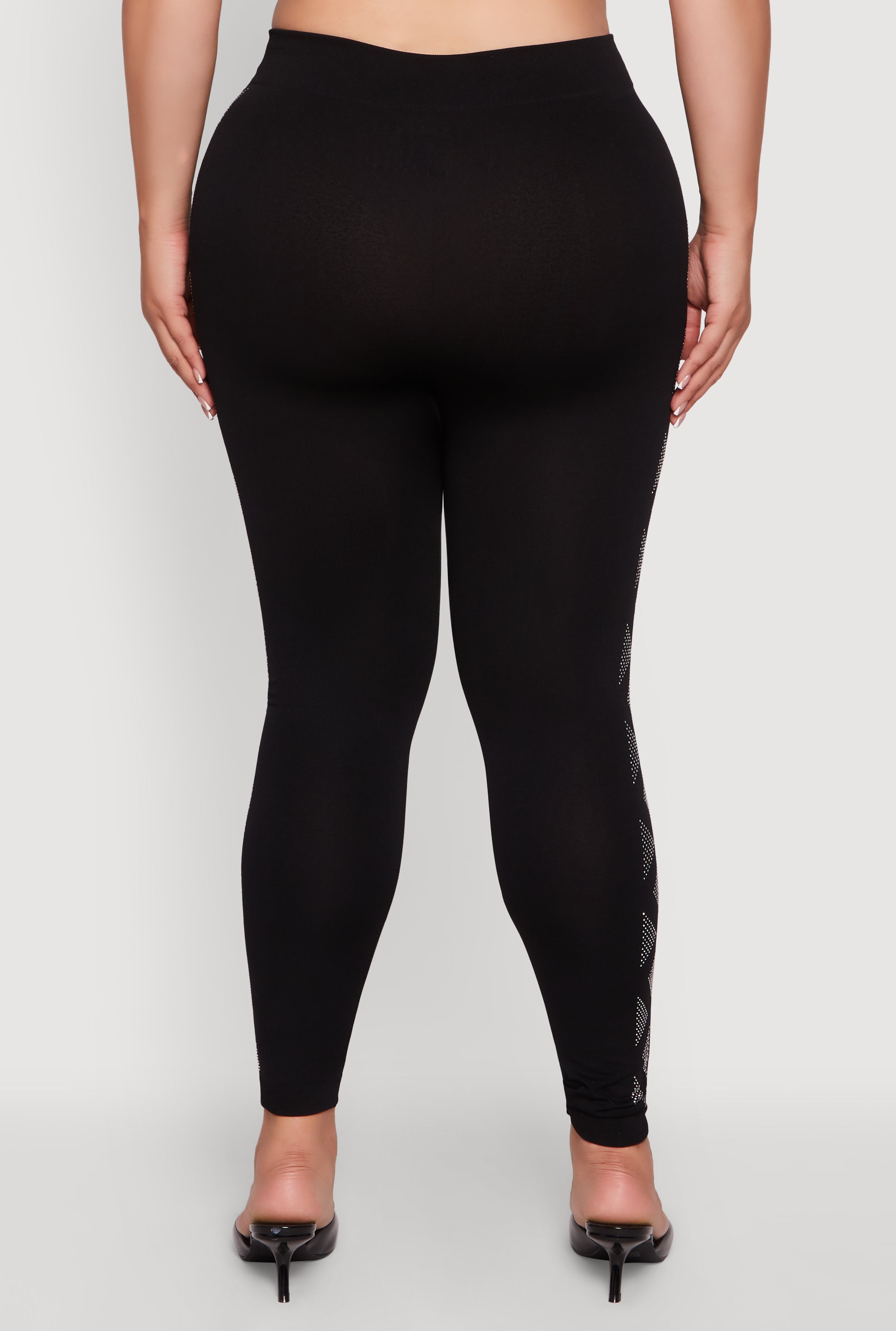 Step into the spotlight with these Plus Size High Waisted Side Rhinestone Patterned Leggings that bring sparkle to your every move. Designed to hug your curves with a sleek, skinny-leg fit, these leggings are perfect for turning heads on a night out or adding a glam touch to your casual look. The high waist offers flattering support while the soft fleece lining keeps you cozy and confident. Ready to shine? These leggings make every party your runway.