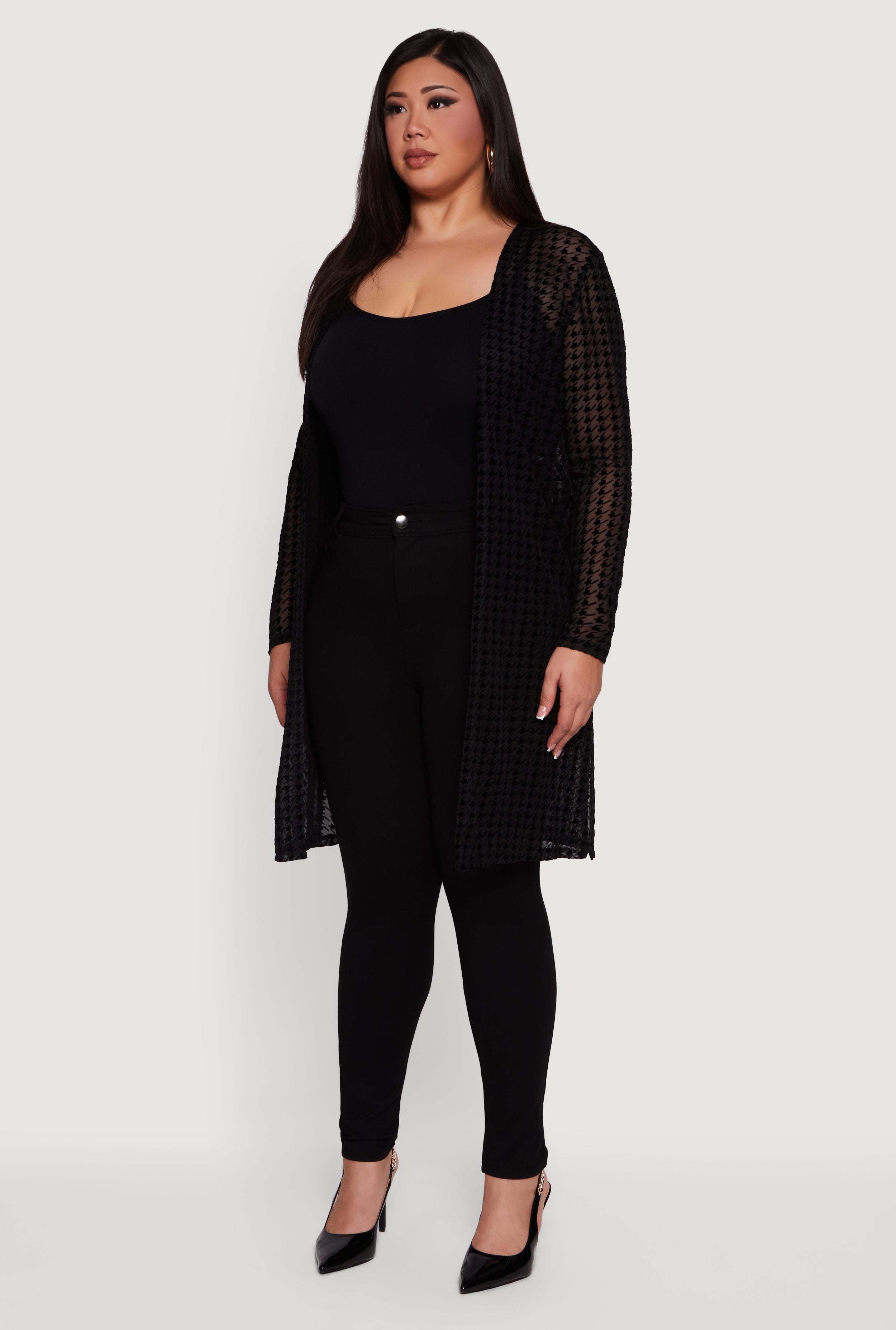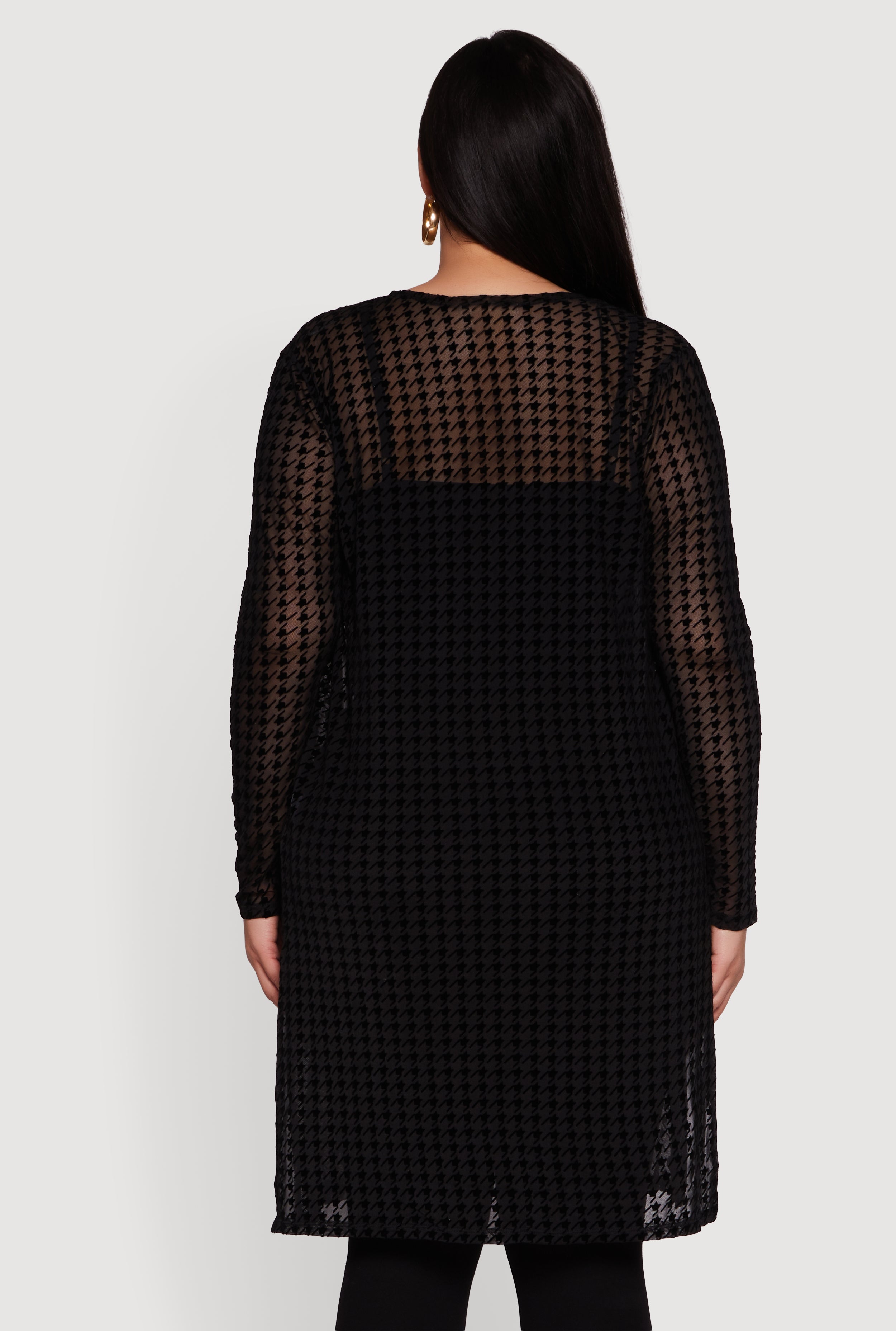 Step up your style game with this Plus Size Houndstooth Velvet Burnout Mesh Duster. Featuring a chic houndstooth pattern and a lightweight mesh fabric with velvet burnout details, this duster is designed for a relaxed fit that flows effortlessly over your favorite outfits. Perfect for a night out or casual layering, it offers long sleeves and side slits for easy movement without sacrificing style. Collarless and versatile, it adds a touch of edgy elegance to any look.