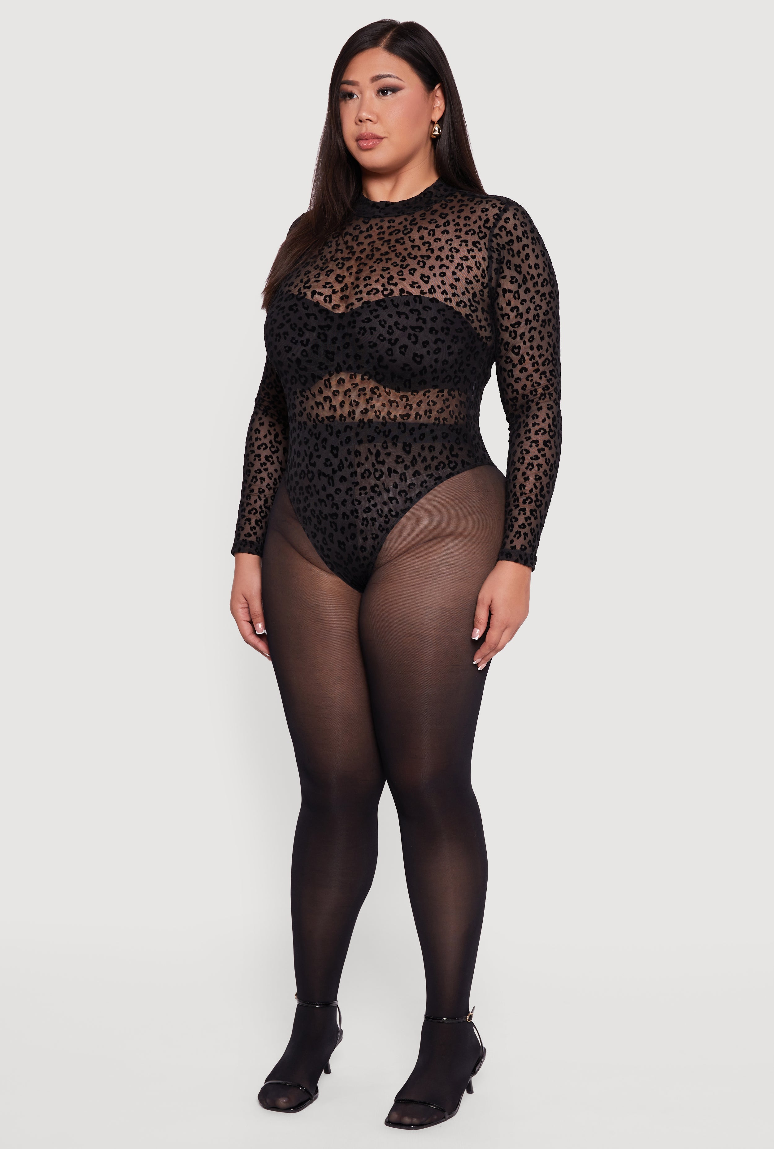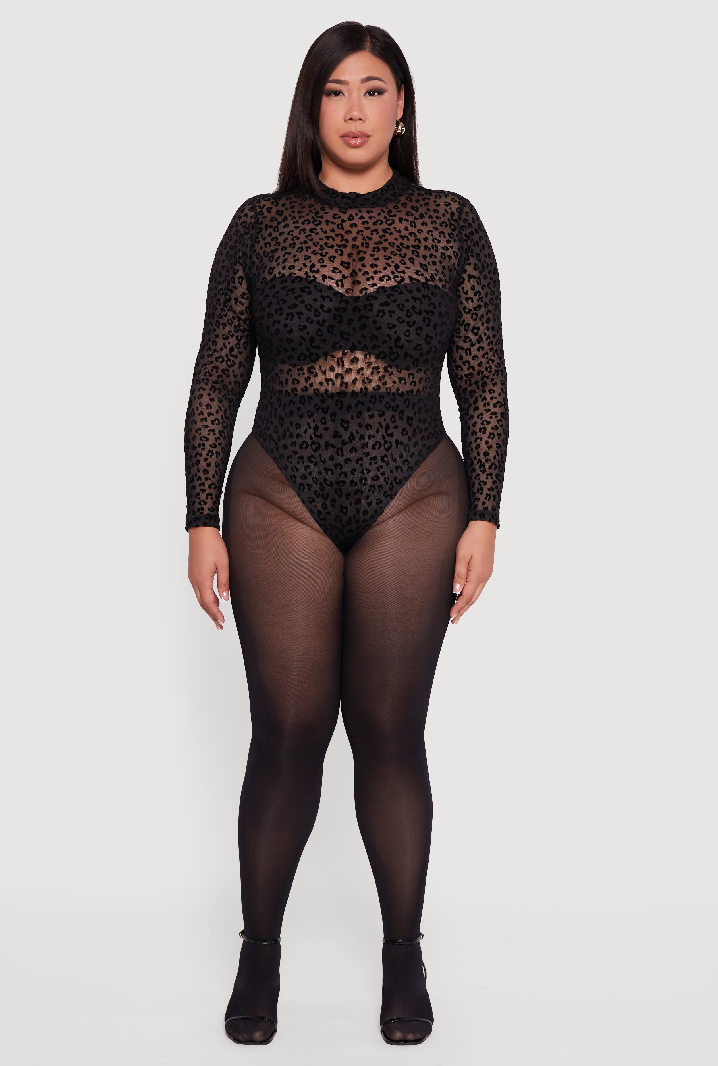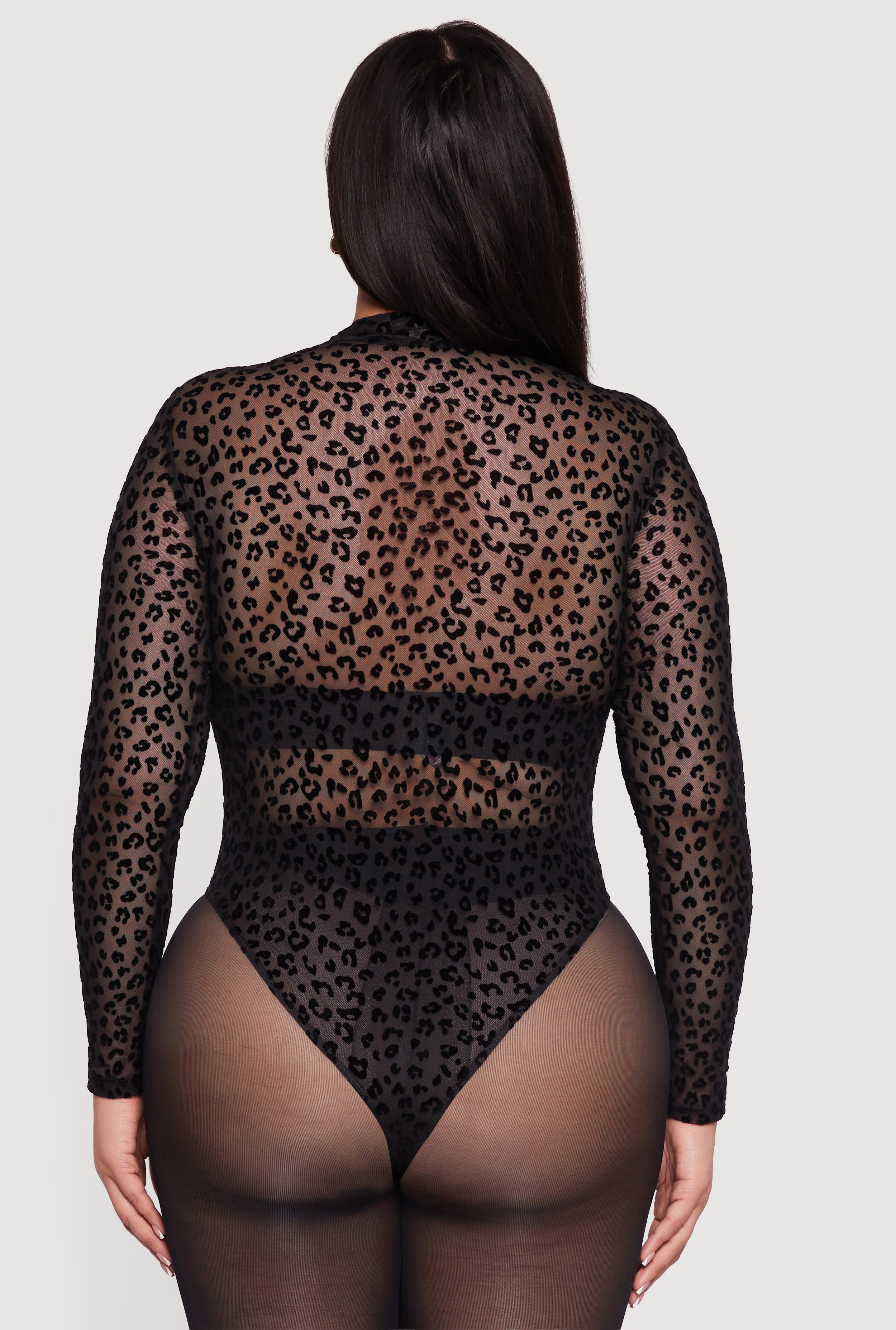 Unleash your wild side with this Plus Size Leopard Print Velvet Burnout Mock Neck Bodysuit. Designed to hug your curves and keep you comfy all day, this bodysuit is the perfect blend of fierce and casual. The soft velvet burnout fabric adds a touch of luxe texture while the mock neck and long sleeves make it a chic staple for any season. Whether you're dressing up for a night out or keeping it cool on the weekend, this bodysuit brings effortless style with a bold animal print that never goes out of fashion.
