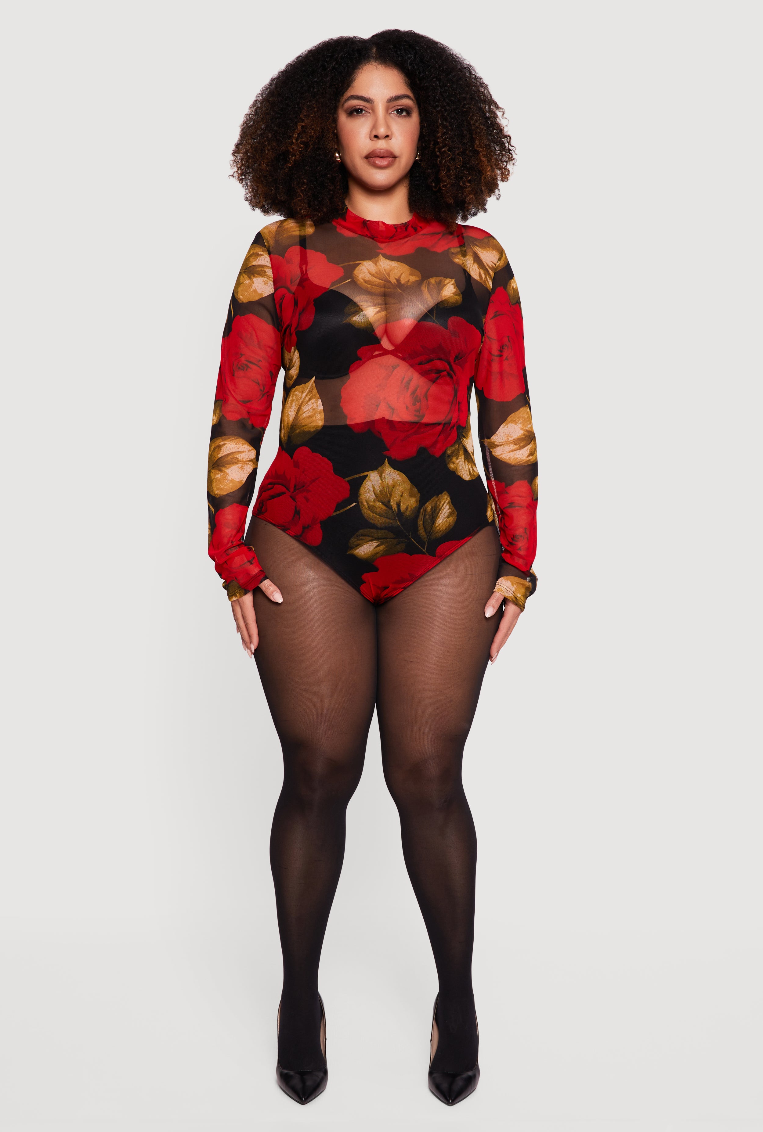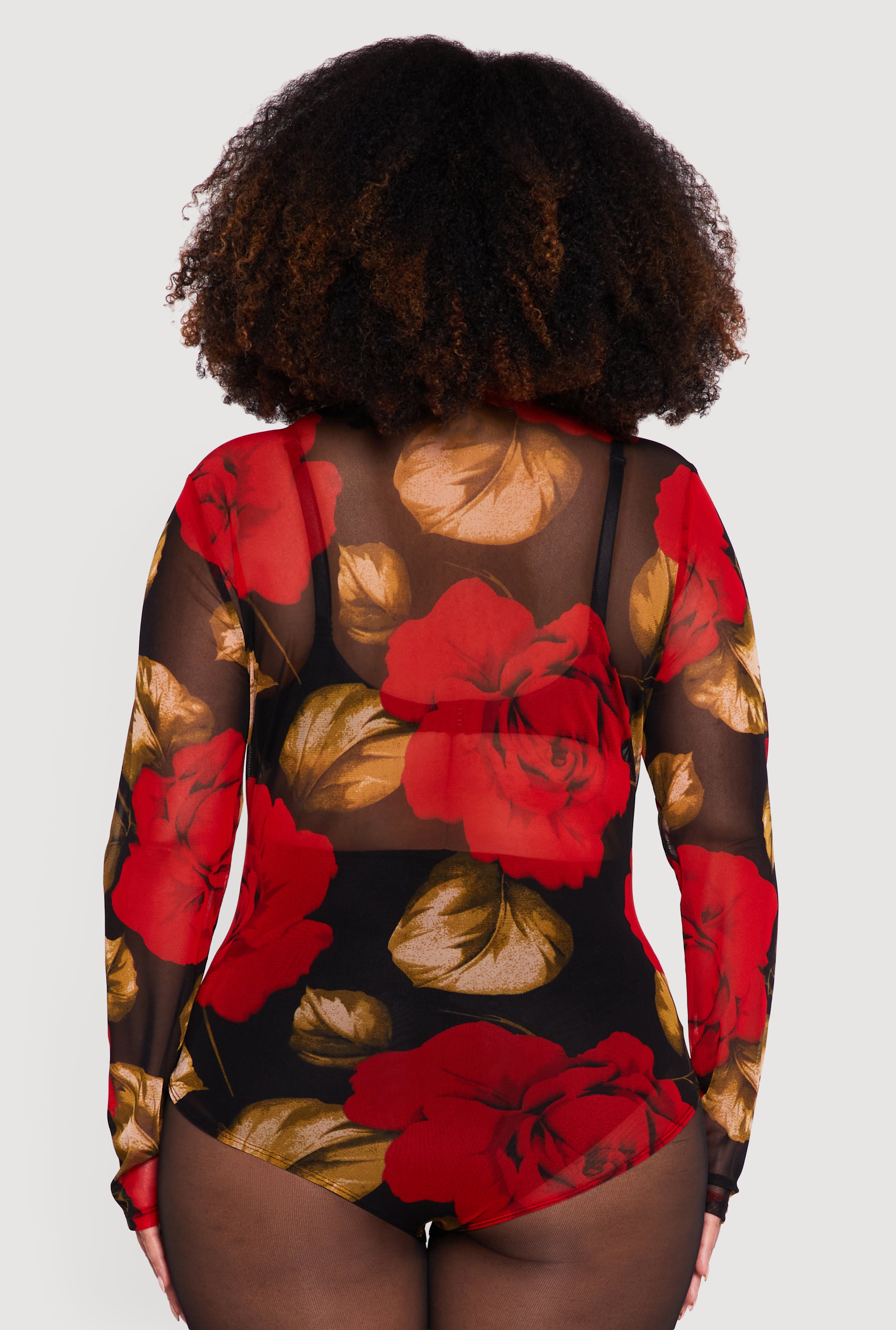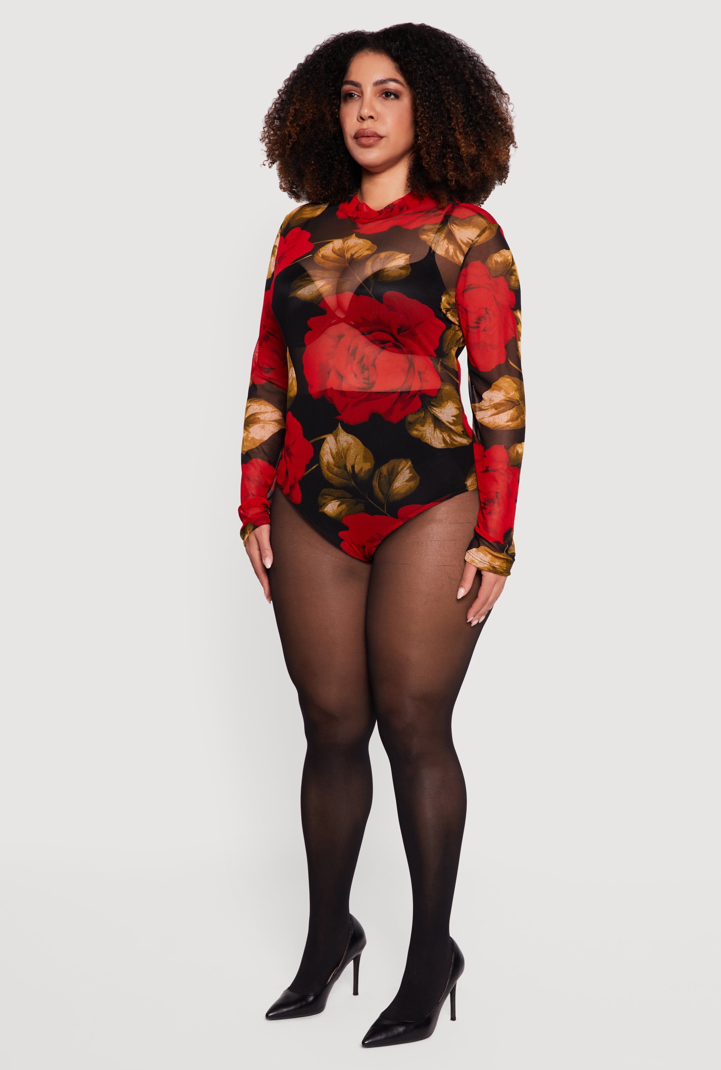 Step up your style game with this Plus Size Long Sleeve Mock Neck Patterned Mesh Bodysuit. Designed to hug your curves in all the right places, this bodysuit combines edgy mesh fabric with a sleek mock neck for a look that’s both bold and effortlessly cool. Perfect for casual outings or layering up for a night out, it offers comfort without compromising on style. Snap closure at the bottom makes it easy to wear while keeping everything in place. Pair it with your favorite jeans or skirts and get ready to turn heads.