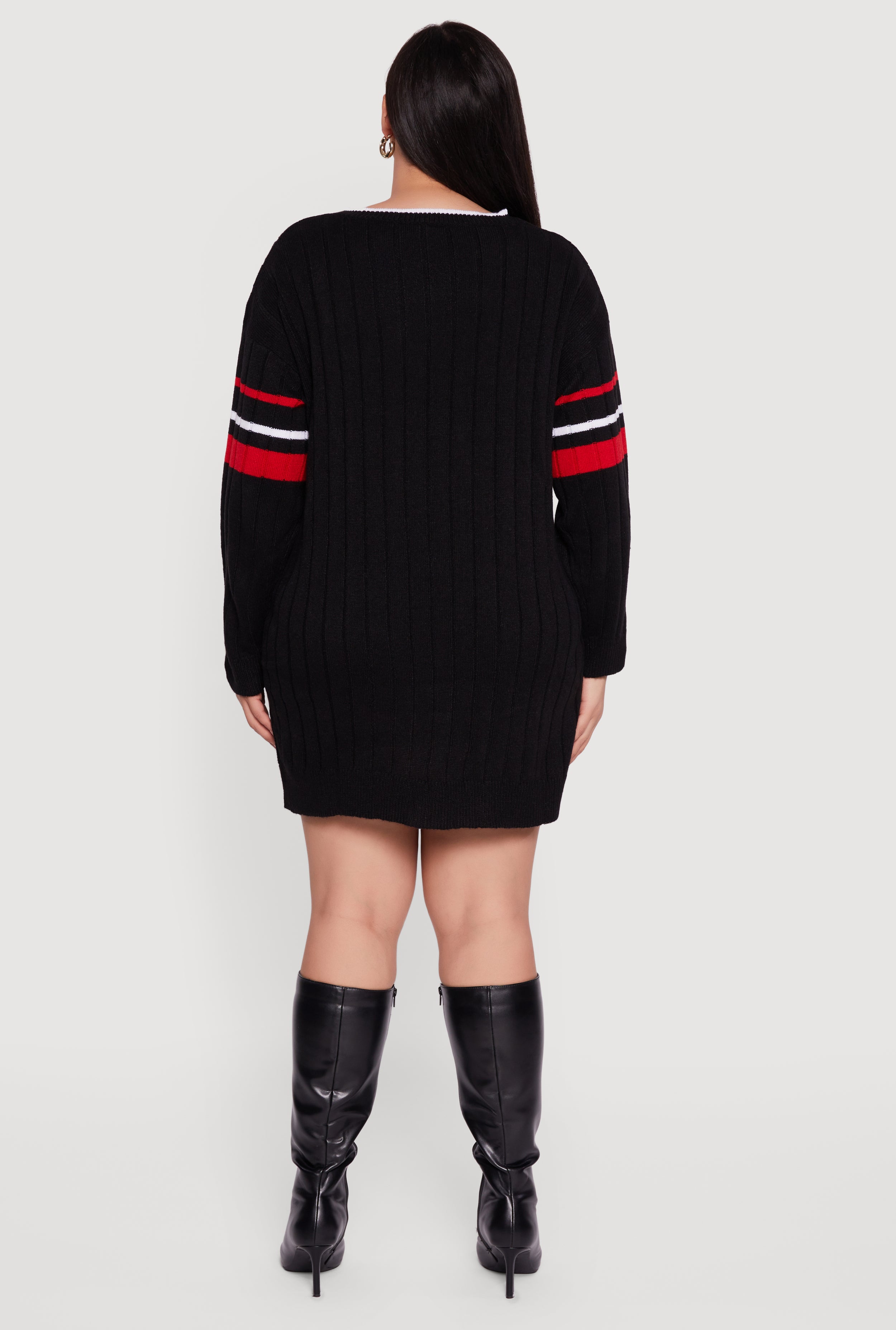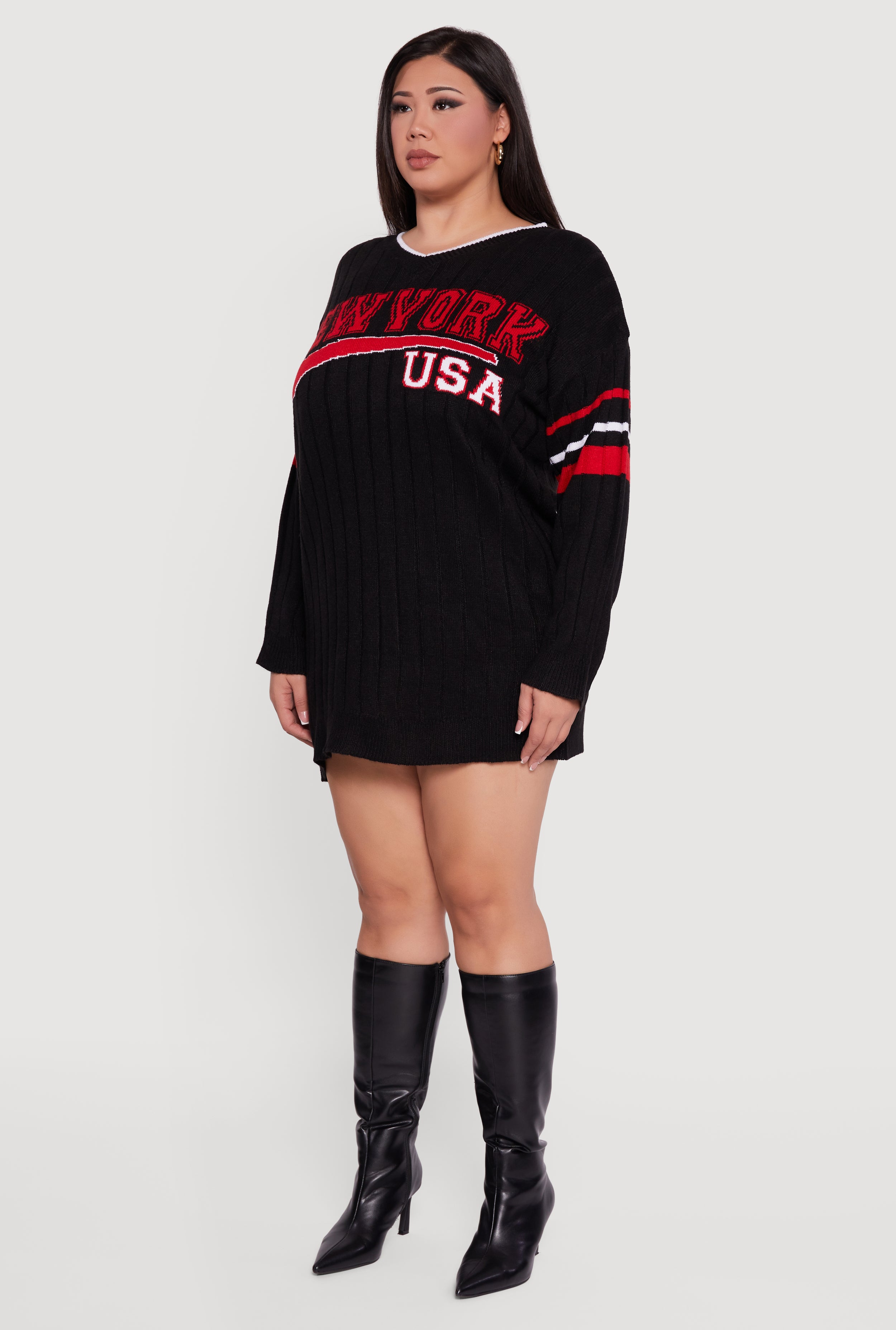 Step out in style and comfort with this Plus Size New York USA Graphic Long Sleeve Sweater Dress. Featuring a classic fit and a trendy V-neck, this short-length dress combines cozy ribbed knit fabric with a bold New York USA graphic print for that effortless street-chic vibe. Perfect for casual days when you want to keep it cool and comfy, the drop shoulder design adds a relaxed touch that flatters your curves.