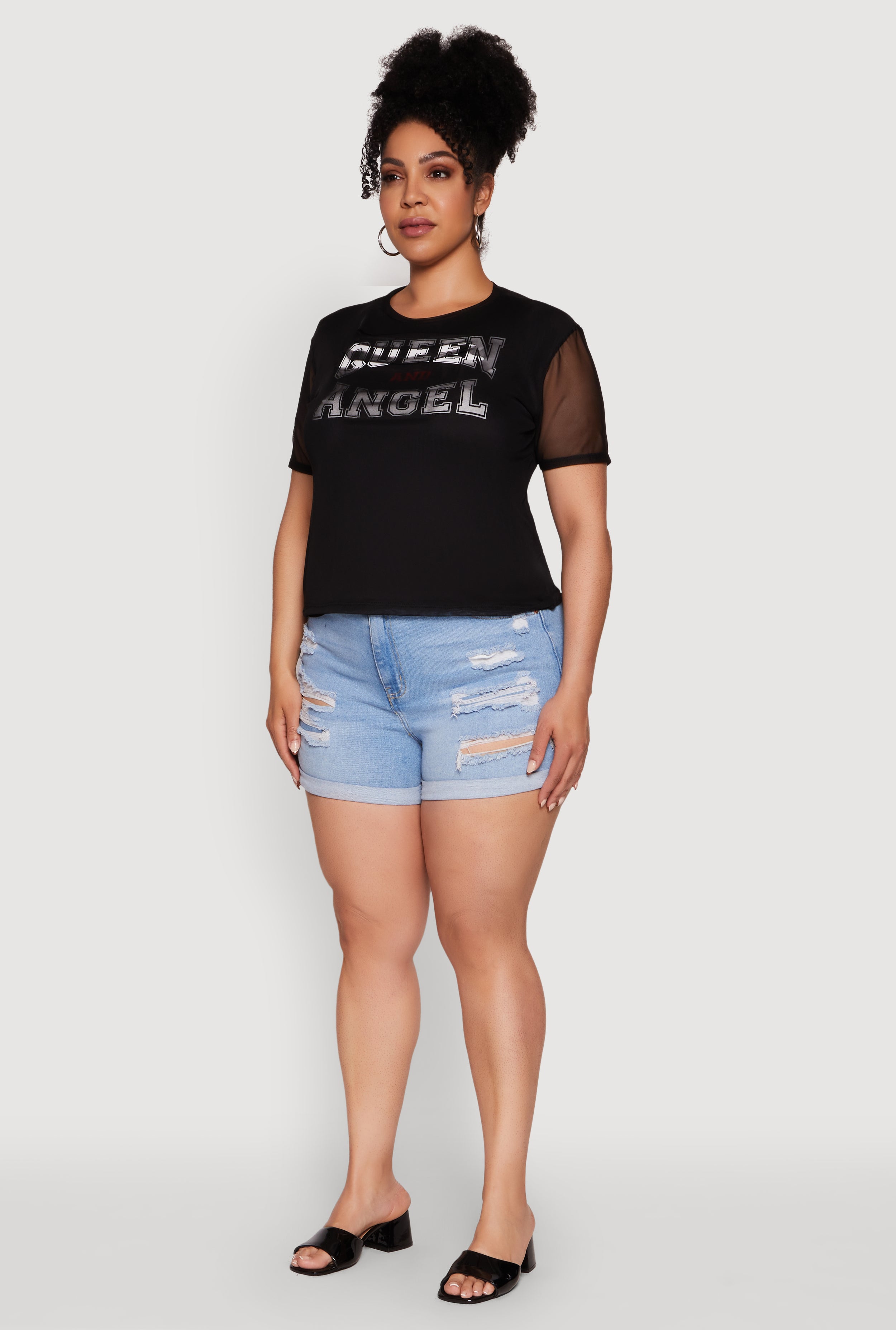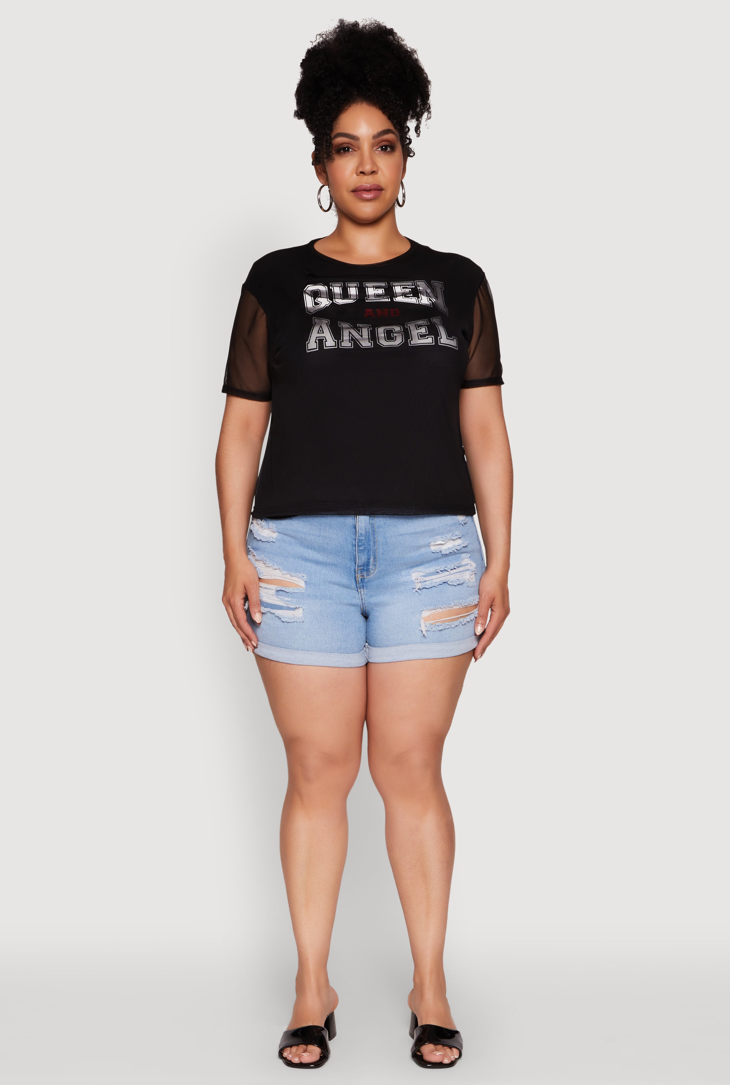 Elevate your wardrobe with the Plus Size Queen and Angel Mesh Top, a stunning blend of comfort and style that makes you feel confident and fabulous. Featuring a bold Queen and Angel graphic, this sheer mesh t-shirt is perfect for turning heads and expressing your unique vibe. The classic fit and crew neckline ensure a timeless silhouette that works for any occasion. Whether you're layering or rocking it solo, this top is your new go-to for effortless, chic style.