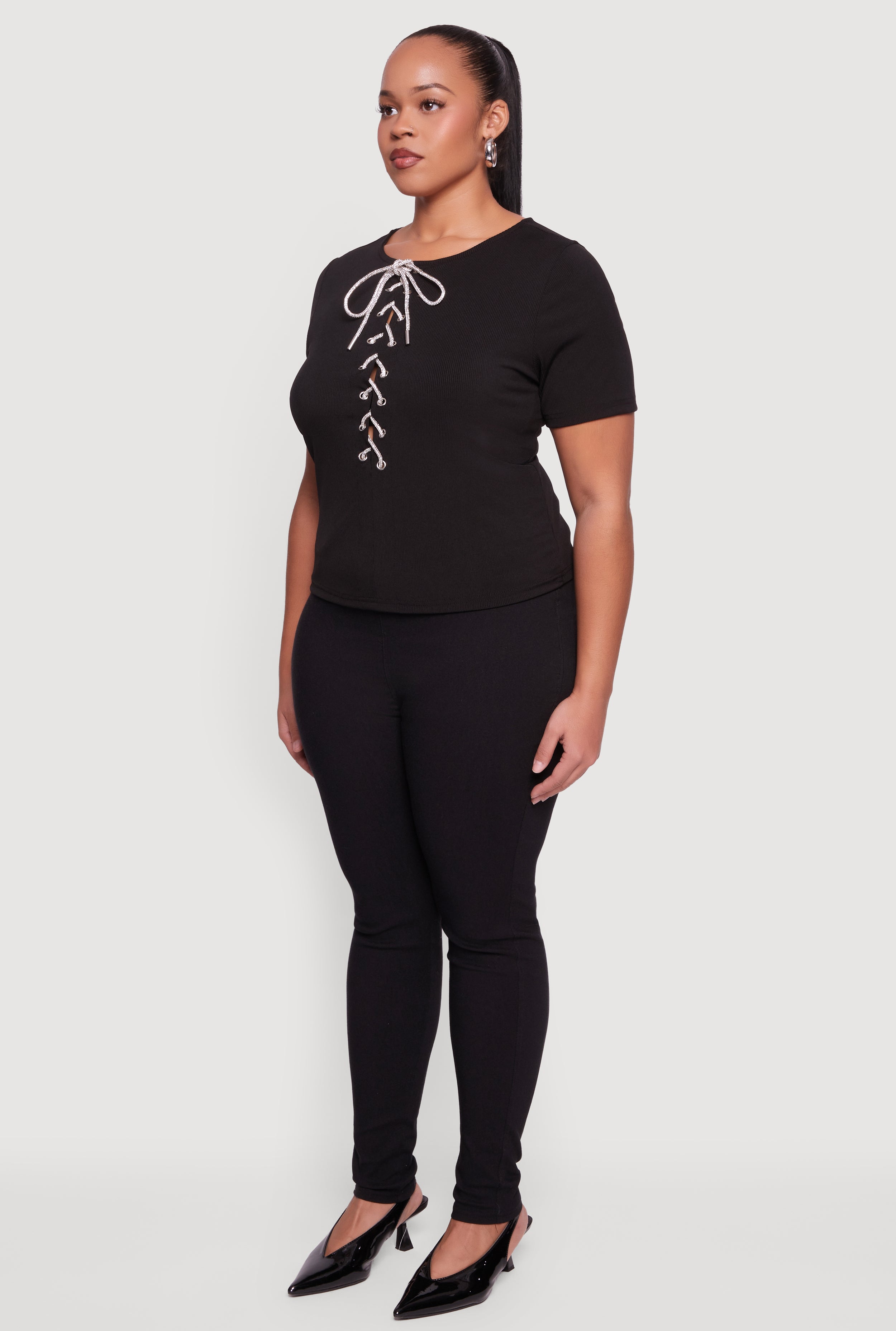 Step up your style game with this Plus Size Rhinestone Lace Up Front Ribbed Knit Top. Designed for a classic fit that flatters your curves, this short sleeve tee features a daring plunge neckline and eye-catching rhinestone embellishments. The lace-up front with grommet details adds a flirty edge, perfect for nights out, parties, or casual hangouts. Made from soft ribbed knit fabric, it combines comfort and sparkle effortlessly—because you deserve to shine every day.