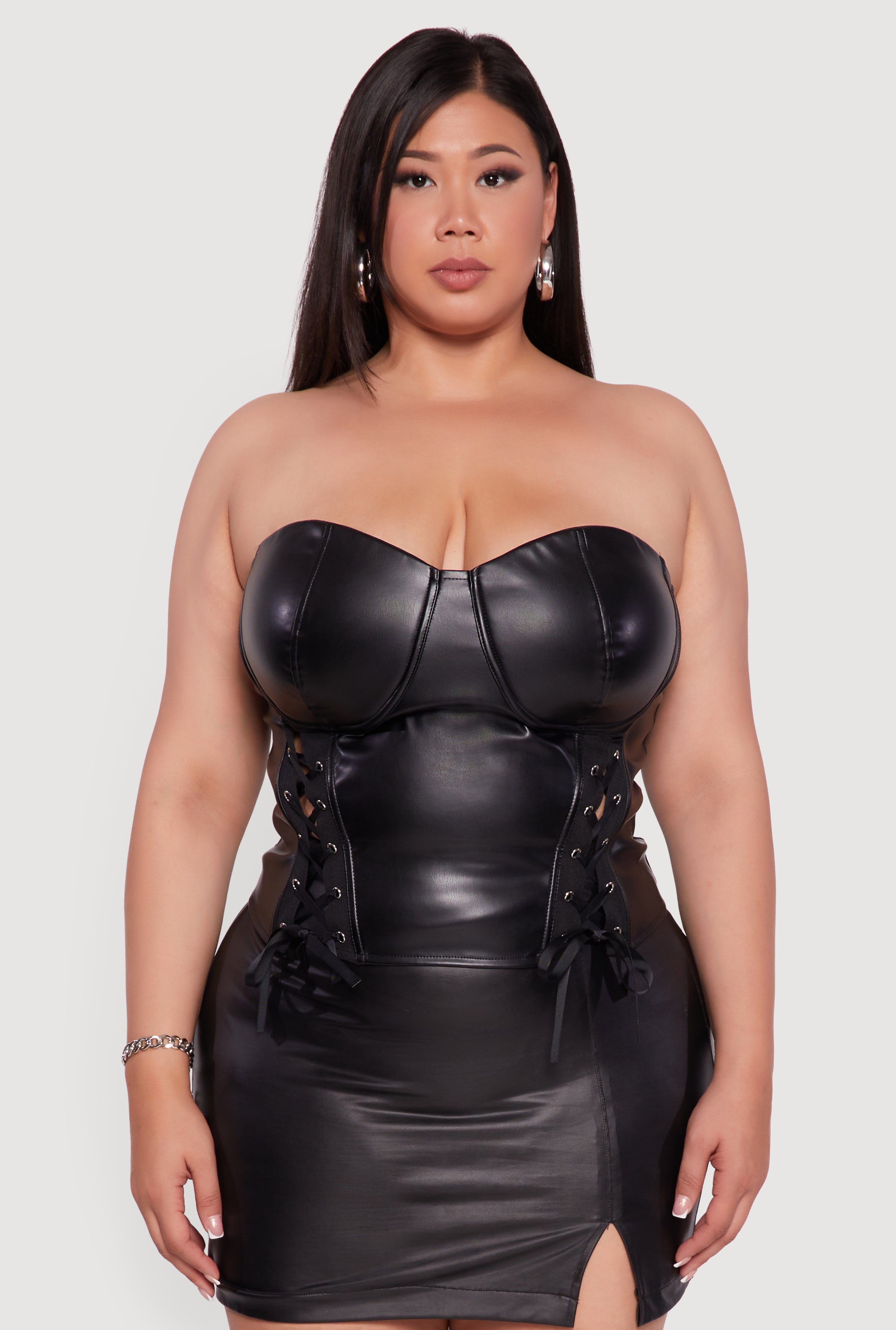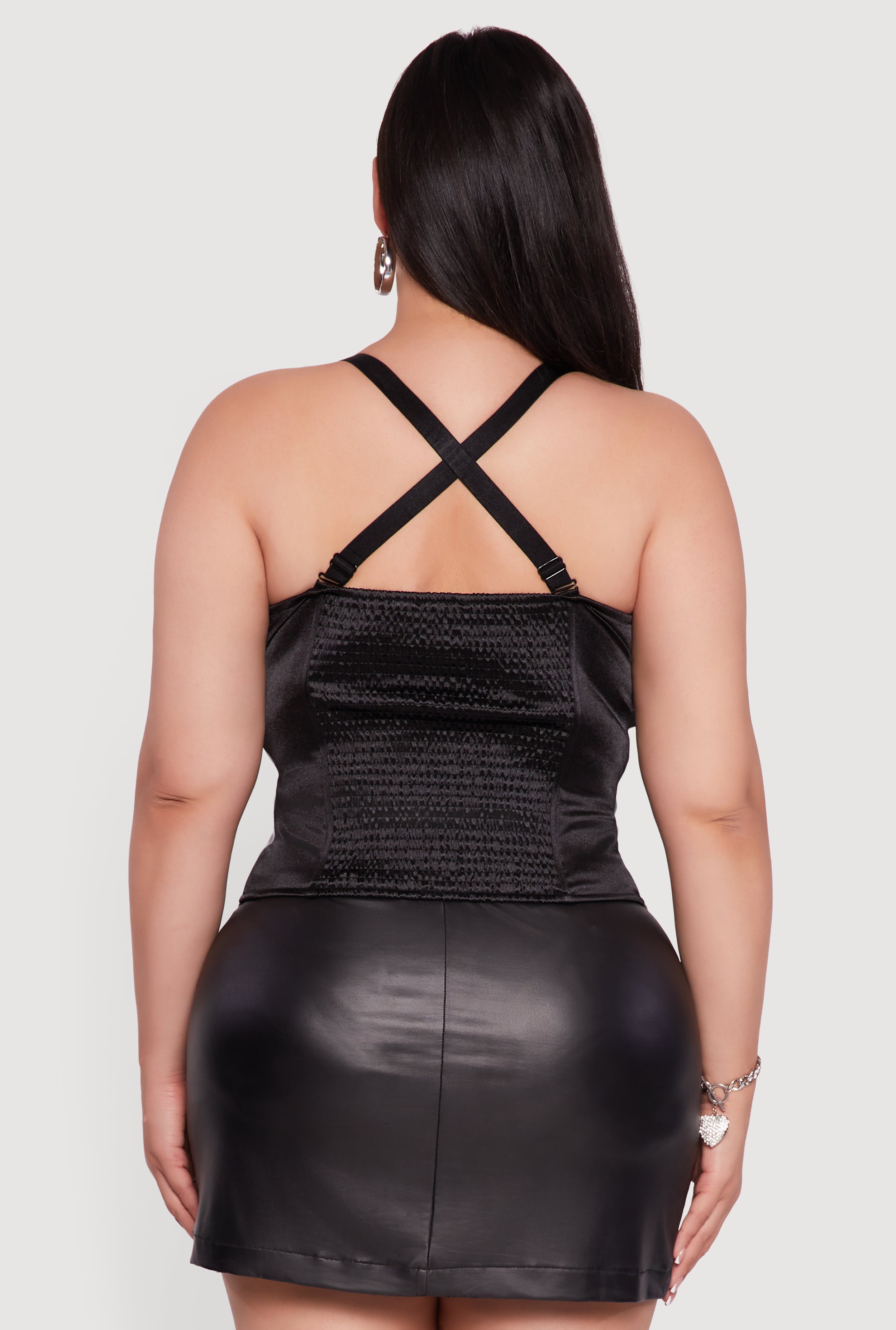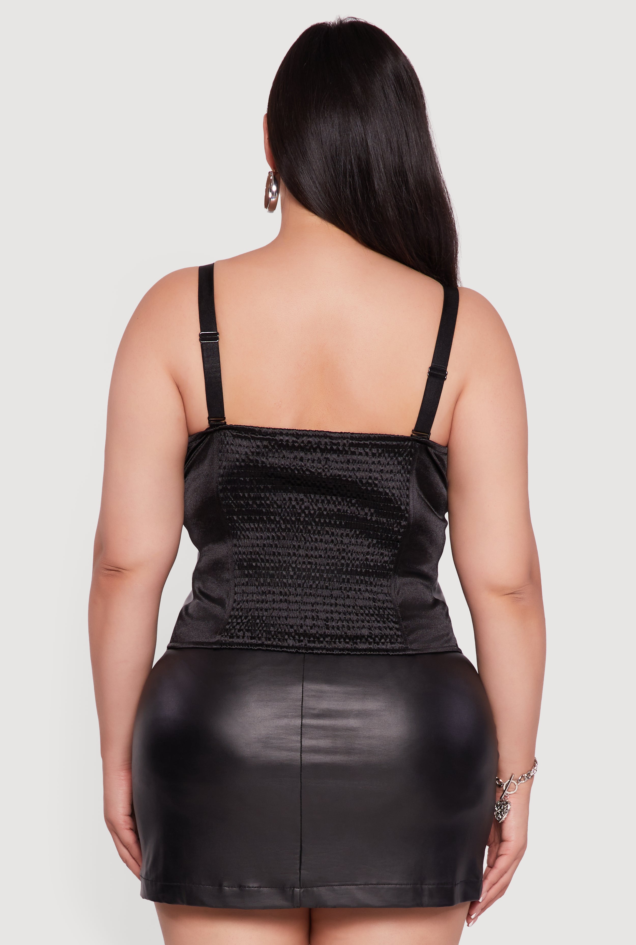 Turn heads and own your vibe with this Plus Size Satin Smocked Back Faux Leather Bustier Top. Designed to hug your curves in all the right places, this top blends edgy faux leather with luxe satin for a look that’s both fierce and feminine. The sweetheart neckline and padded bust give you the perfect shape, while the smocked back ensures a comfy fit that moves with you. Whether you’re hitting a festival, going out for a night on the town, or just want to feel extra confident at any party, this sleeveless bustier is your new go-to statement piece.