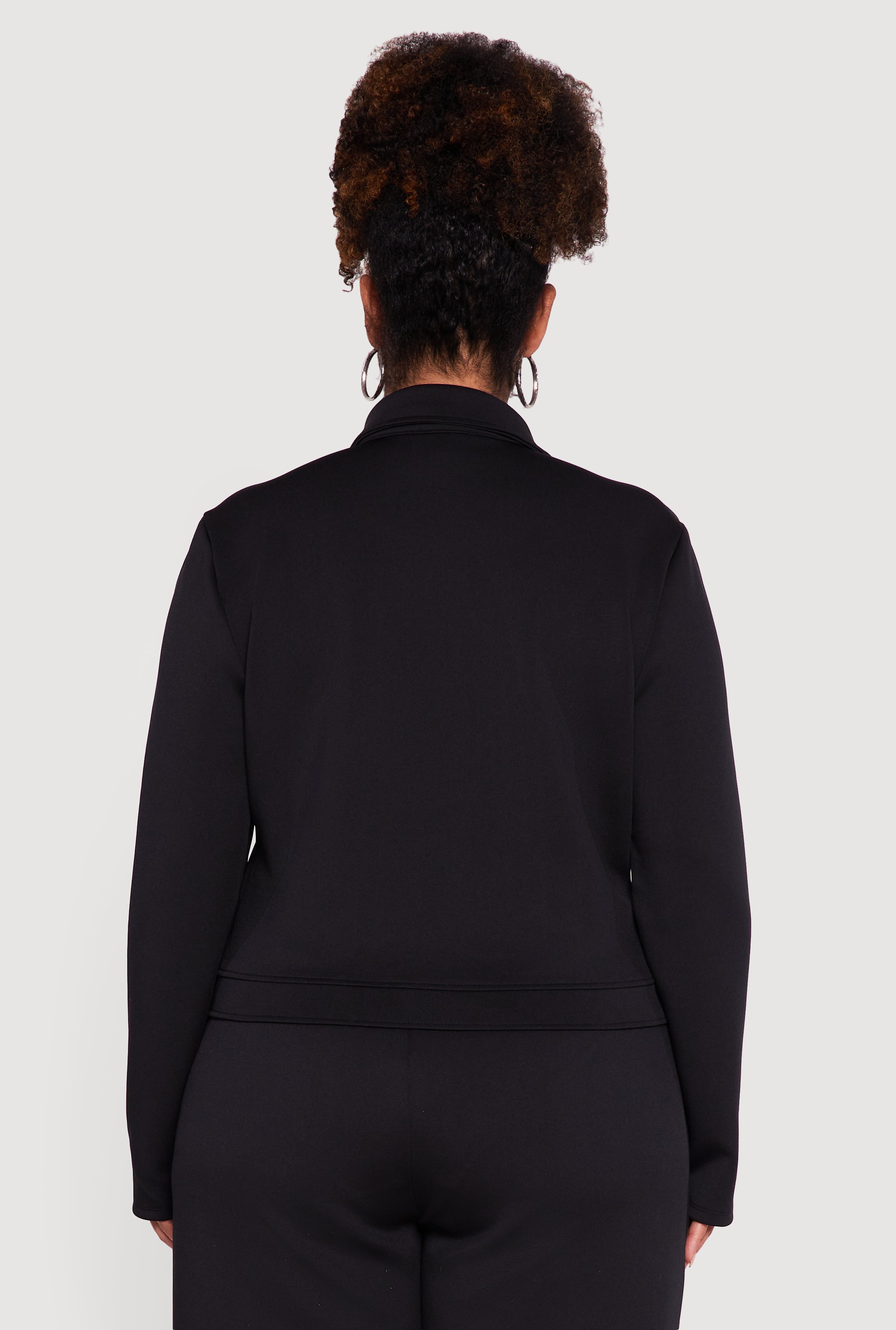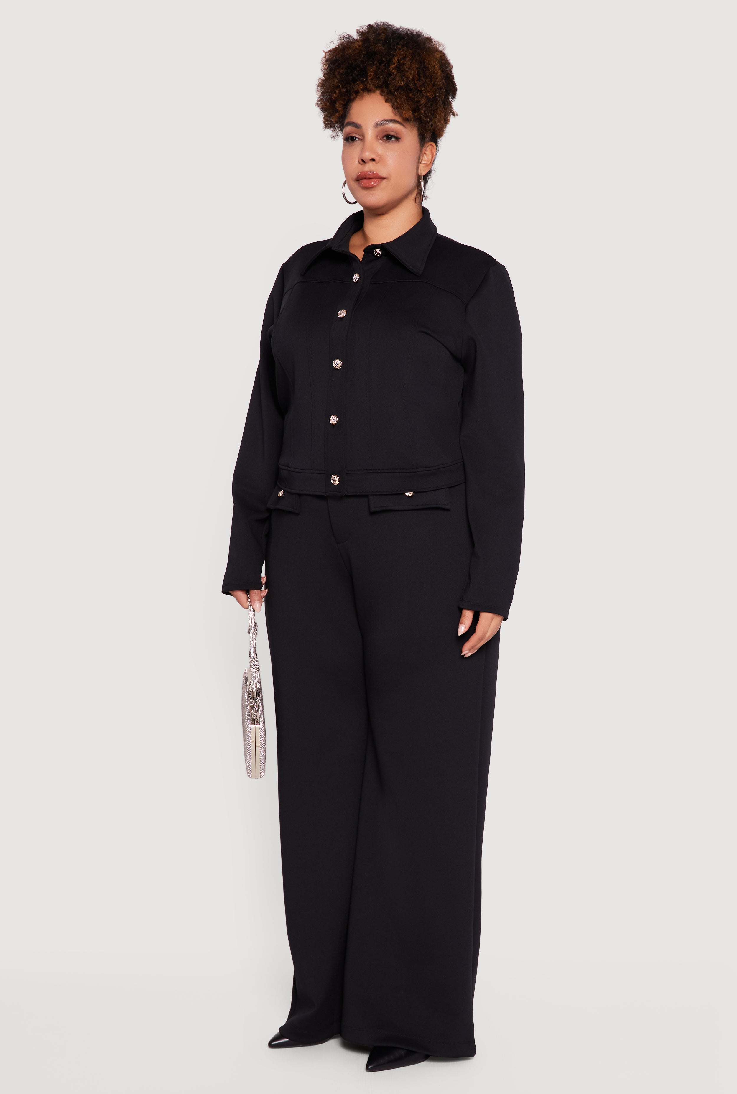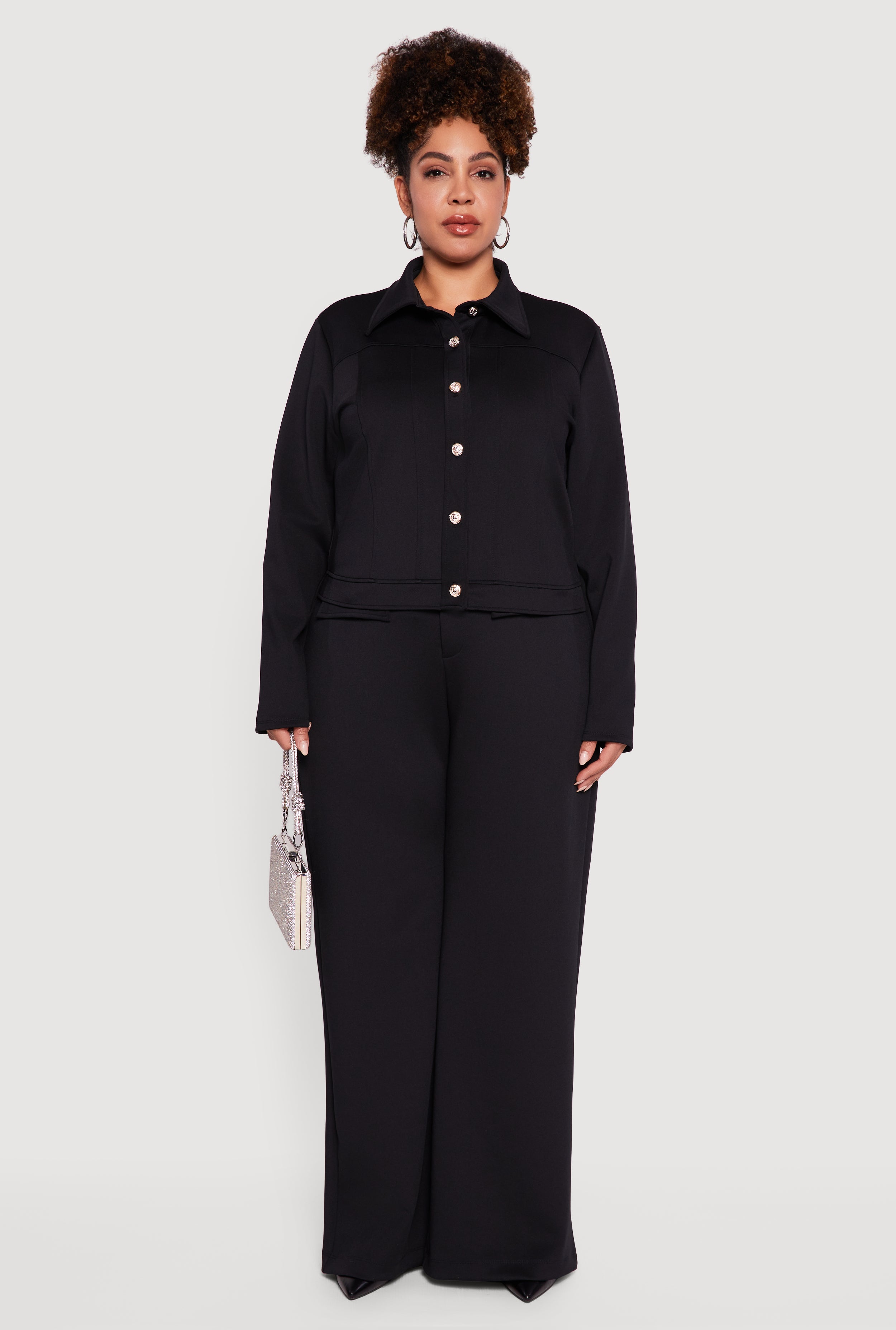 Step up your style game with this Plus Size Scuba Button Front Shacket designed to keep you cozy and effortlessly chic. Made from smooth scuba fabric, this long sleeve shacket features a classic collared neckline and a trendy button front that’s perfect for layering or wearing solo. Its solid metallic-inspired look adds a subtle edge to your outfit, making it a versatile piece for any casual or dressy occasion.