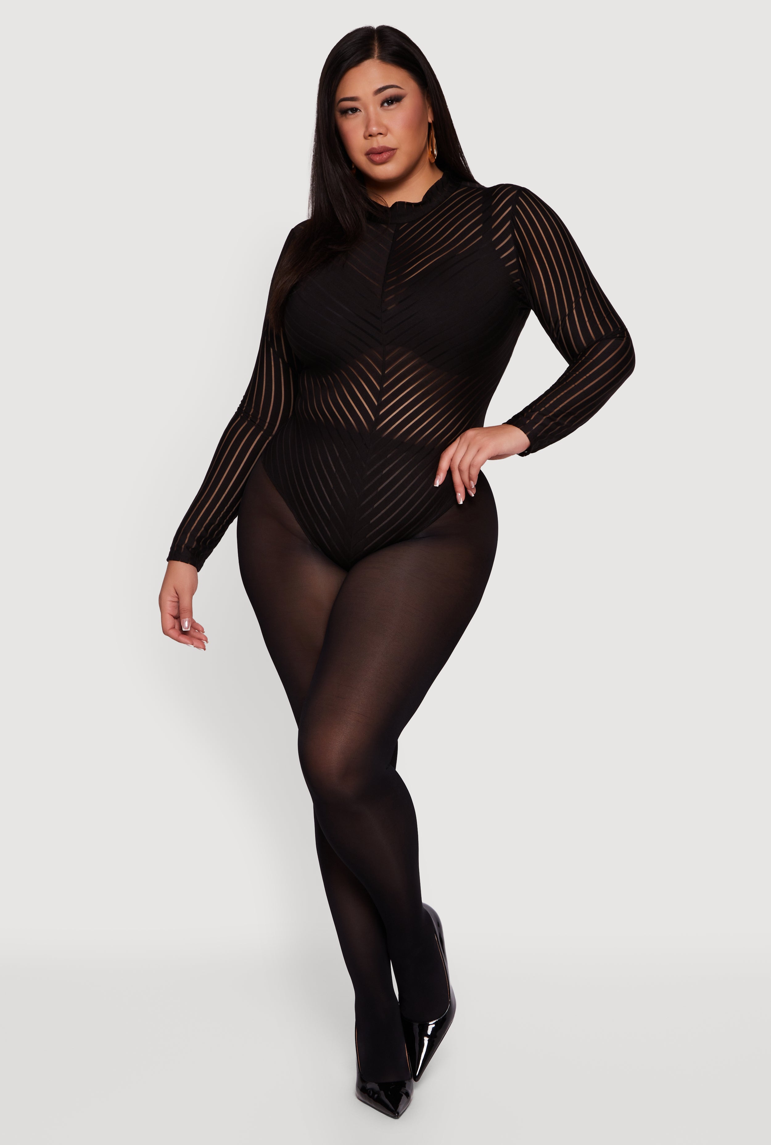 Step up your style game with this Plus Size Shadow Stripe Mesh Mock Neck Bodysuit. Designed to hug your curves in all the right places, this bodysuit features a chic shadow stripe mesh that adds just the right amount of edge and allure. Perfect for casual days, nights out, or parties, its mock neck and long sleeves keep things sophisticated while the keyhole back and snap closure bring a flirty finish. Pair it with your favorite jeans or skirt and get ready to turn heads effortlessly.