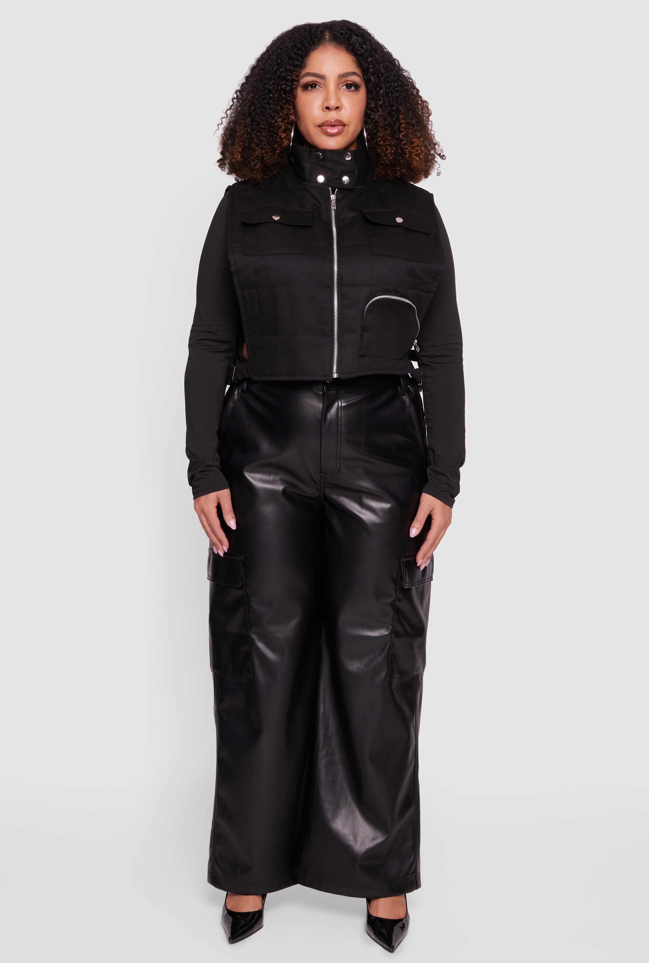 Step up your layering game with this Plus Size Side Buckle Zip Front Quilted Cargo Vest. Designed for effortless style and comfort, this sleeveless vest features a sleek zip front and open sides that keep your look fresh and breathable. The collared neckline adds a touch of polish while the quilted fabric brings cozy warmth without the bulk. Cargo-inspired flap and zip pockets give you all the storage you need for your essentials, making it perfect for casual days out or cool-weather adventures. Affordable and flattering, this vest is your new go-to for versatile outerwear that fits your vibe and your curves.