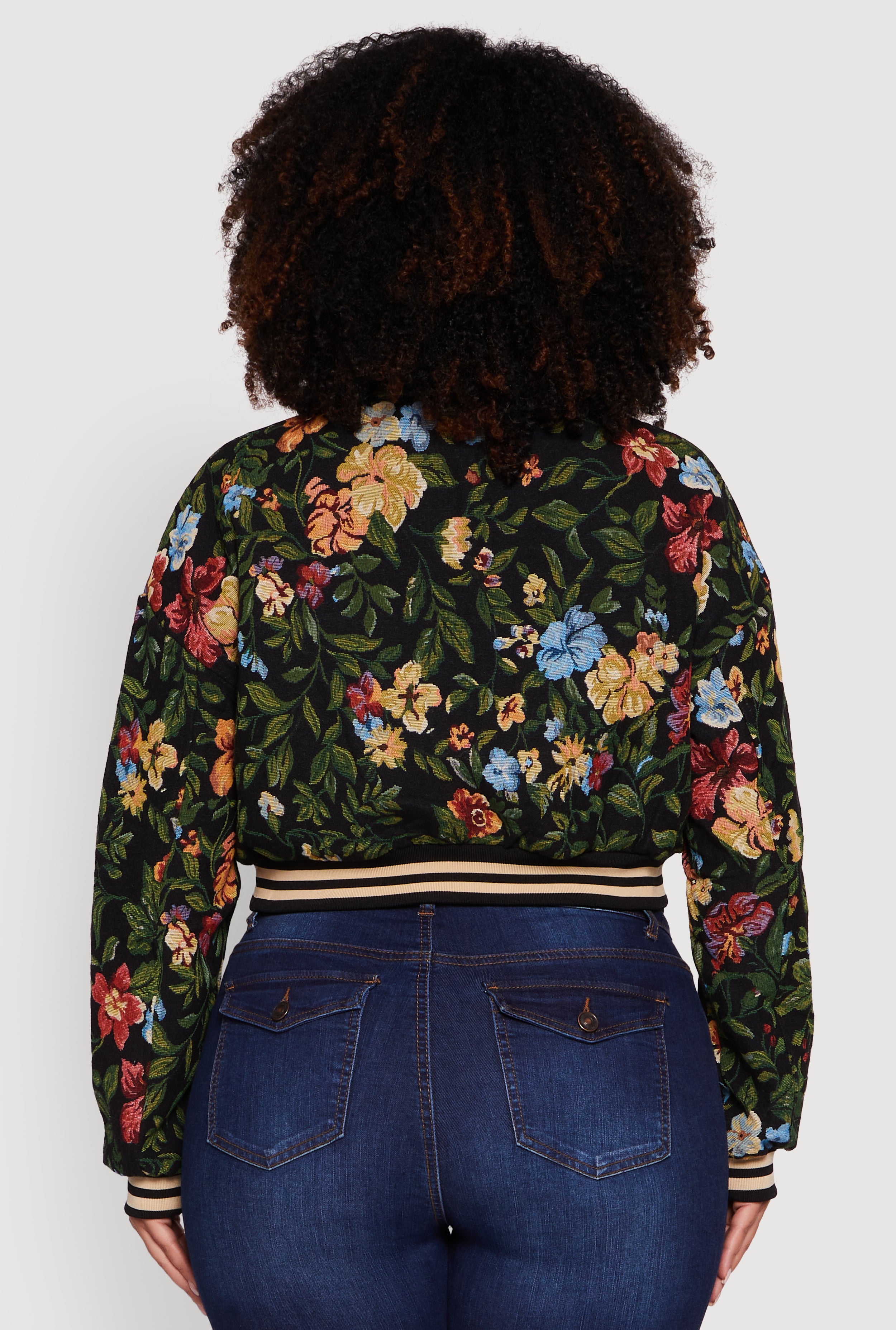 Plus Size Varsity Stripe Floral Print Cropped Jacket