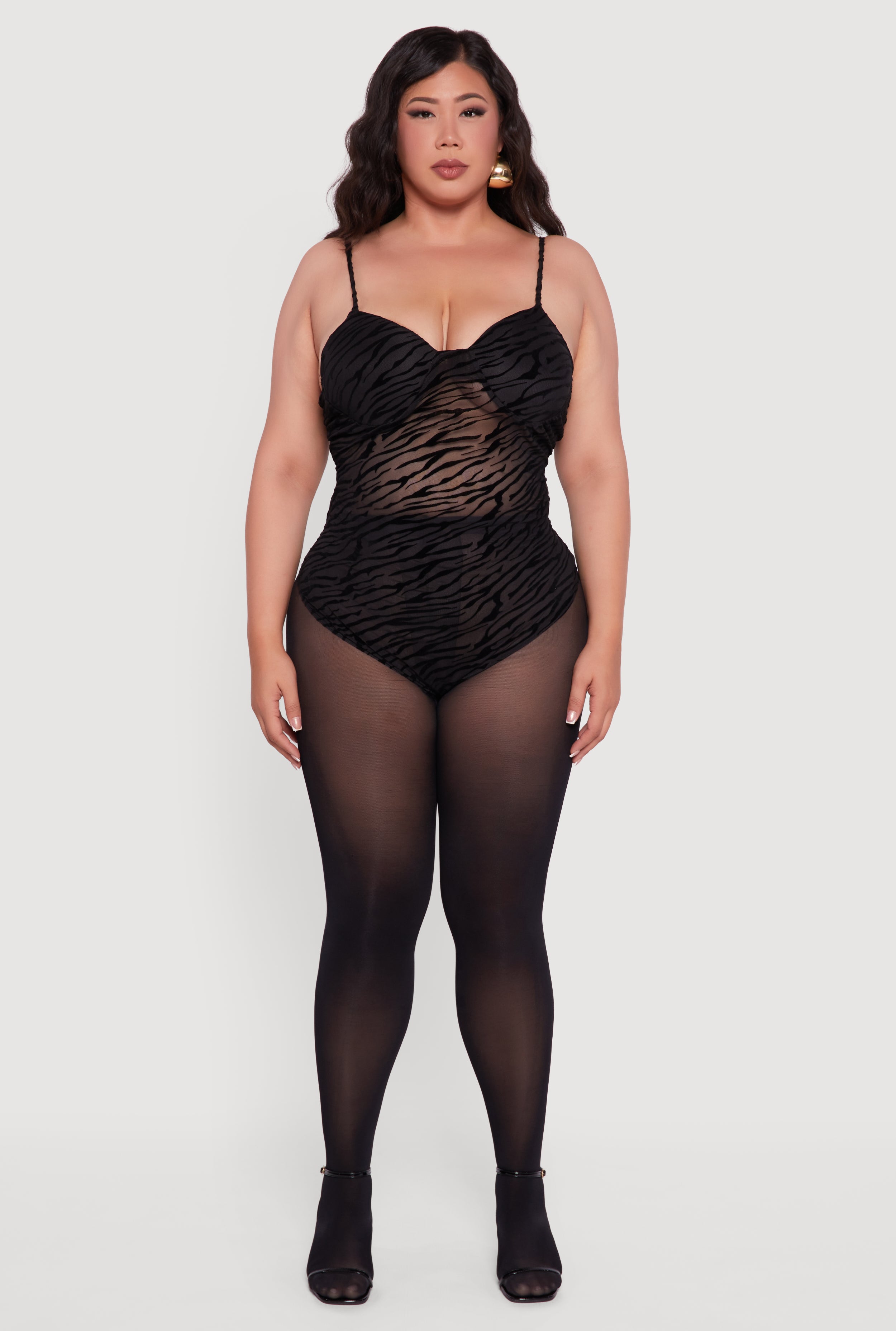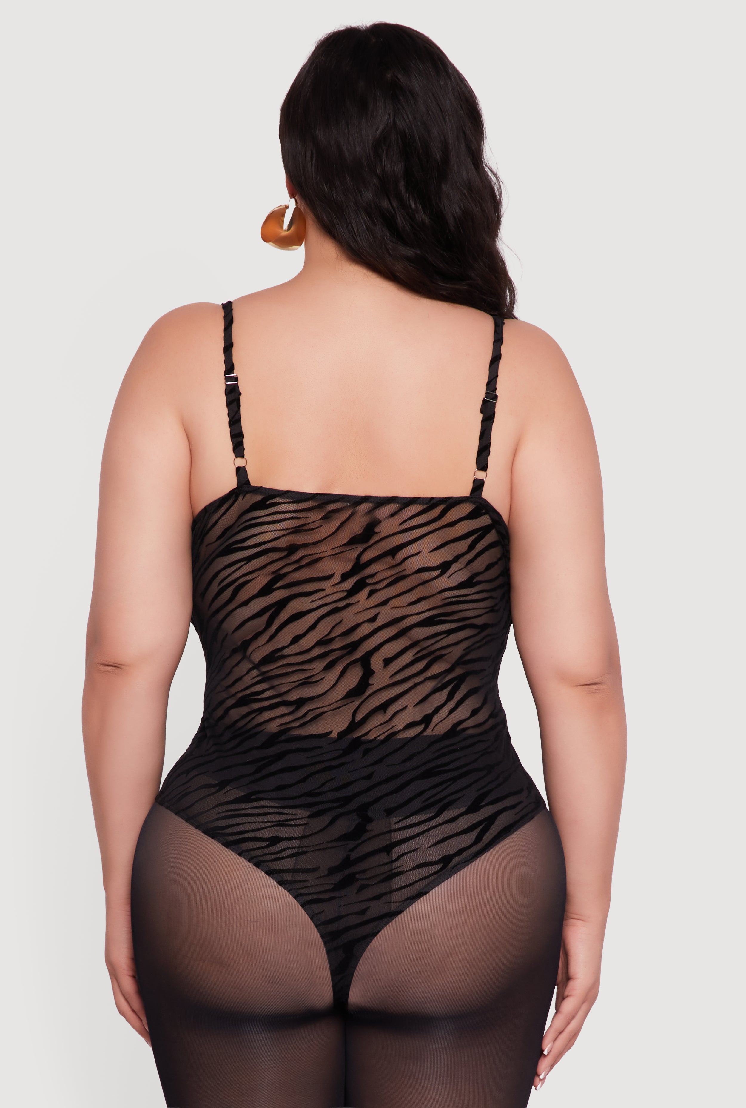 Unleash your wild side with this Plus Size Zebra Print Velvet Burnout Padded Bodysuit. Designed to hug your curves and show off your shape, this sleeveless stunner features a sweet heart neckline and an open back with adjustable spaghetti straps for the perfect fit. The velvet burnout mesh adds a touch of luxe texture while the padded cups give you just the right lift. Ready for a festival or a night out, this bodysuit snaps at the bottom for easy wear and pairs effortlessly with your favorite bottoms. Confidence never looked so fierce.