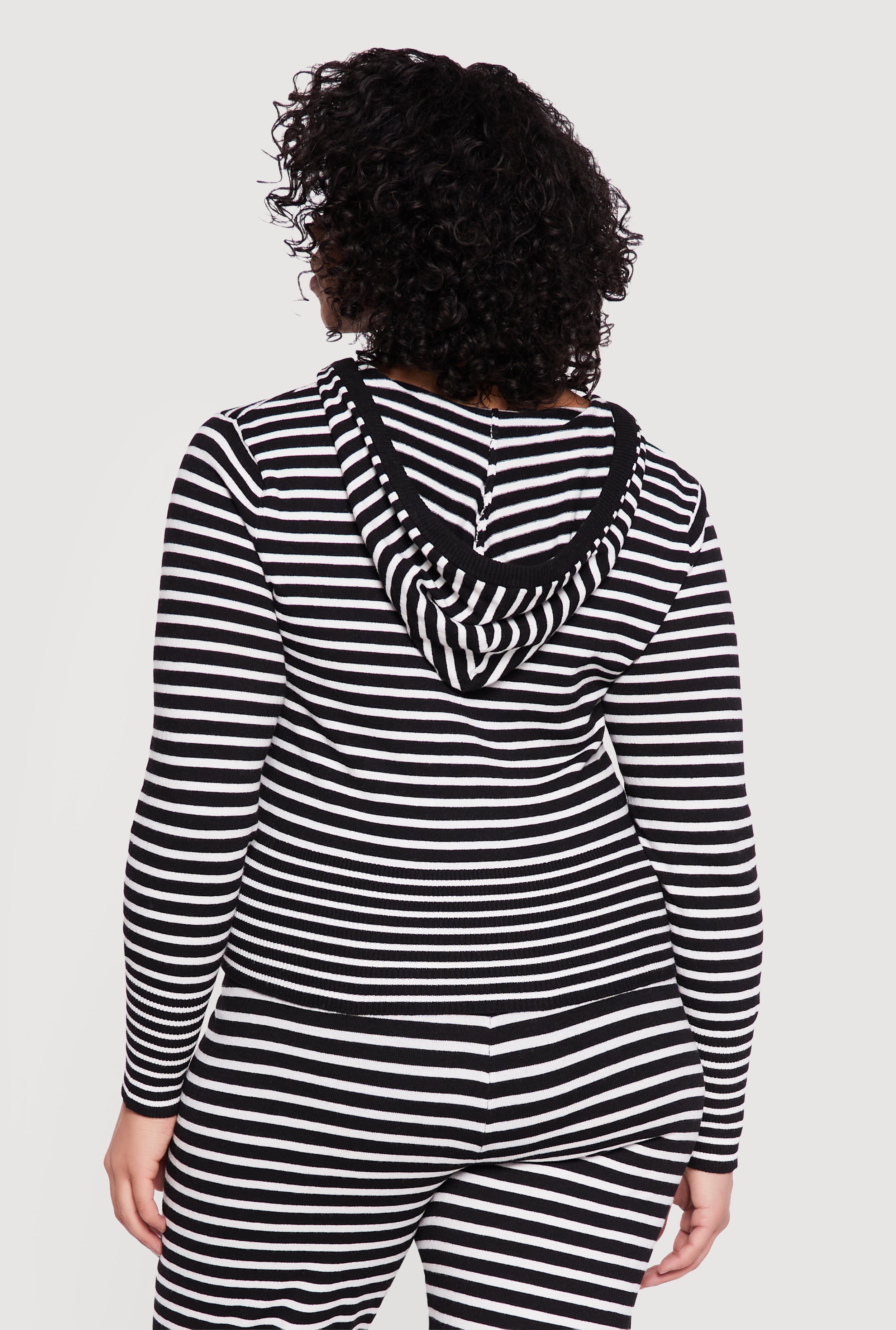 This plus size hoodie features a hooded neckline and a zip front closure for easy layering. Crafted from ribbed knit fabric with a striped pattern, it offers a classic fit that suits casual and athleisure styles. Long sleeves and a drawstring hood complete the timeless silhouette.