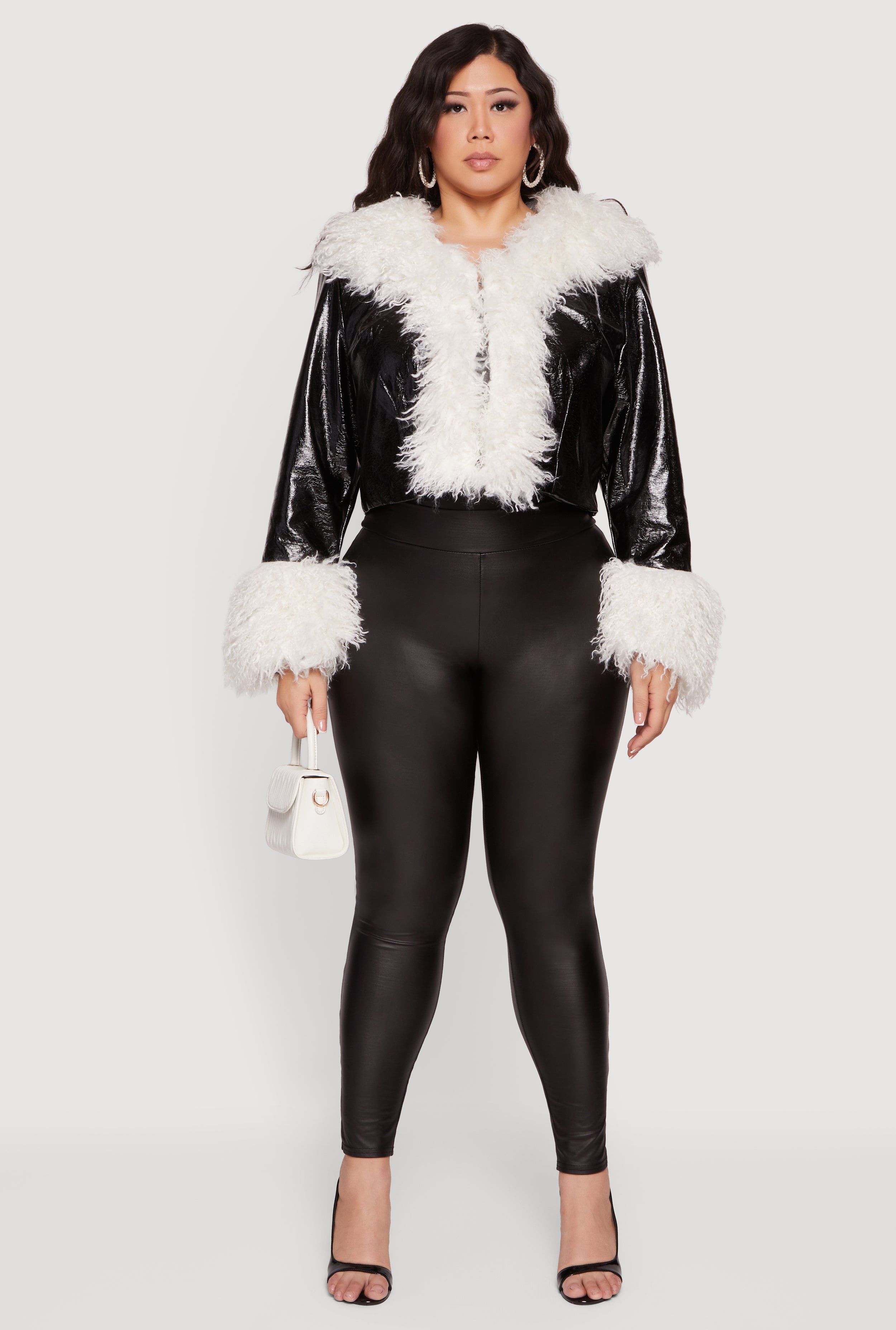 Plus Size Faux Fur Trim Cropped Faux Leather Jacket