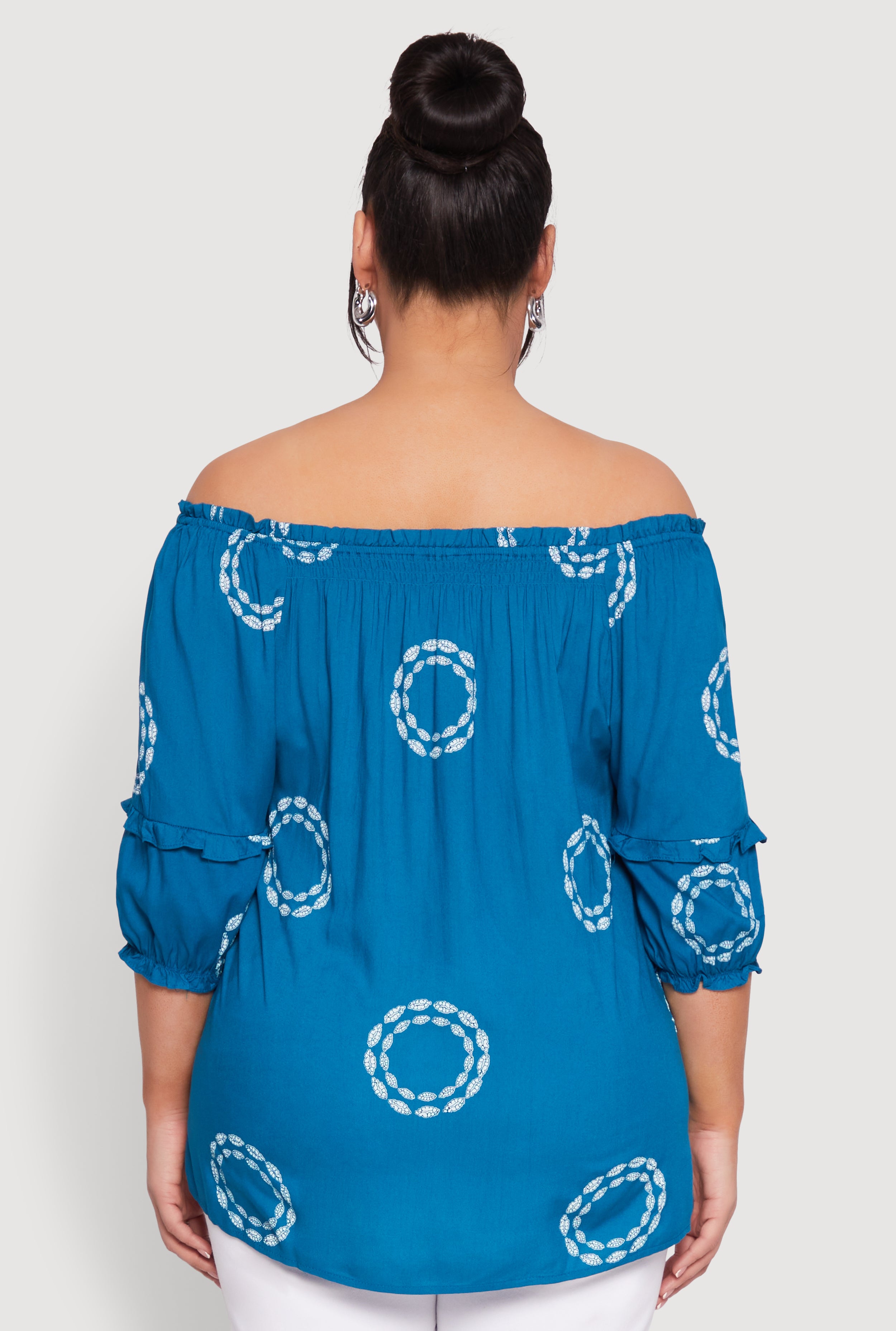 Get ready to turn heads with our Plus Size Circle Print Off The Shoulder Top. Perfect for those laid-back boho days or a casual hangout, this top combines effortless style with a flattering classic fit. The tiered 3/4 sleeves add a playful touch, while the off the shoulder neckline keeps your look flirty and fun. Whether you're pairing it with jeans or skirts, this blouse is your new go-to for a chic, timeless silhouette that celebrates your curves.