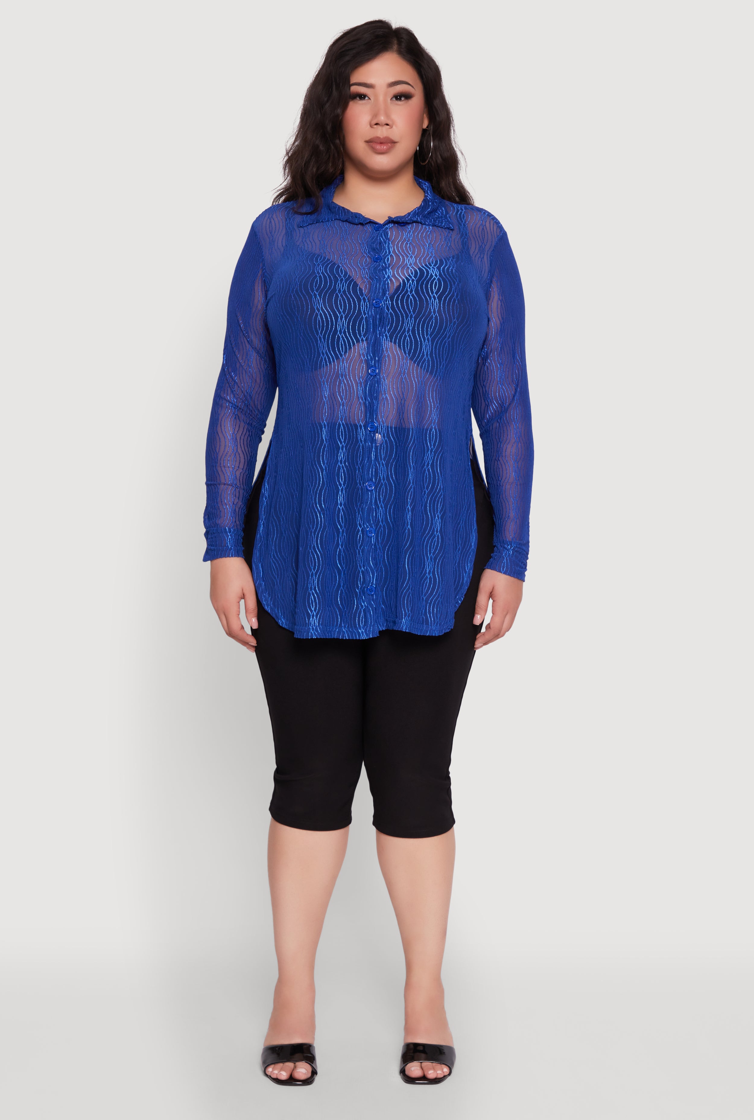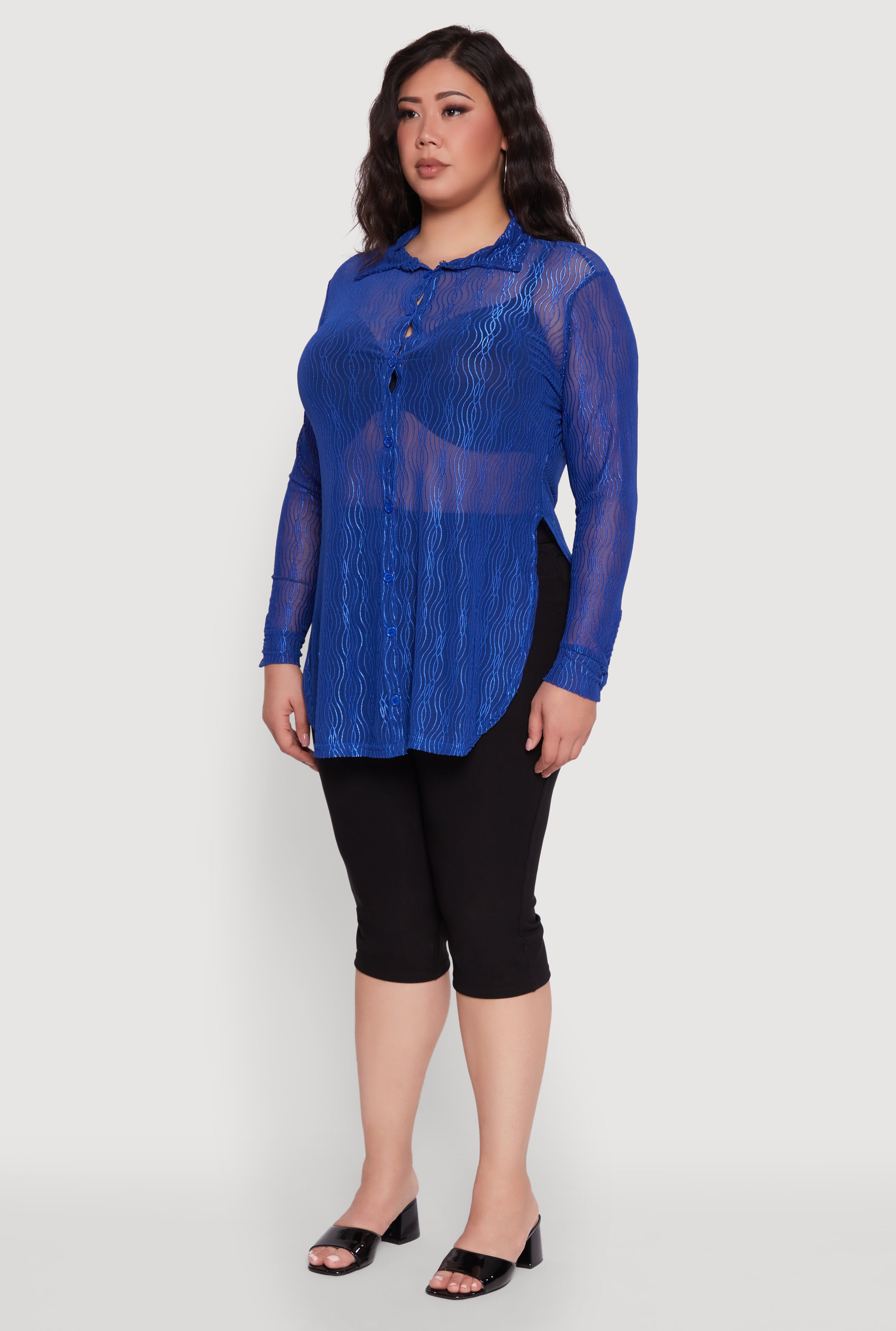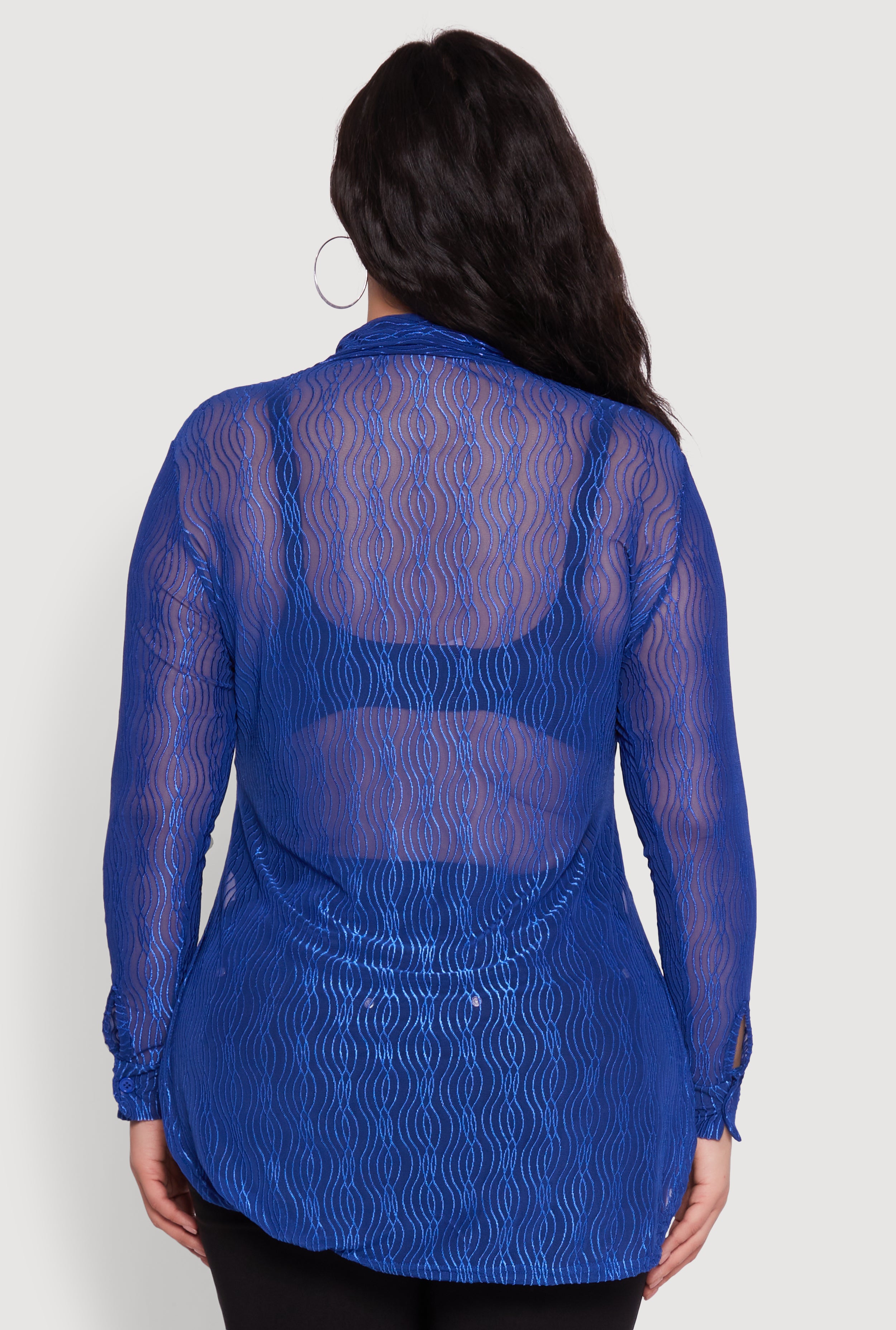 Elevate your casual night out look with this Plus Size Sheer Classic Fit Long Sleeve Tunic Shirt. Designed to flatter with a timeless silhouette, its sheer mesh fabric adds a playful edge while keeping things effortlessly chic. The classic shirt collar and tunic hem create a versatile piece that pairs perfectly with your favorite jeans or leggings. Undergarments sold separately, so you can style it your way and stand out with confidence.