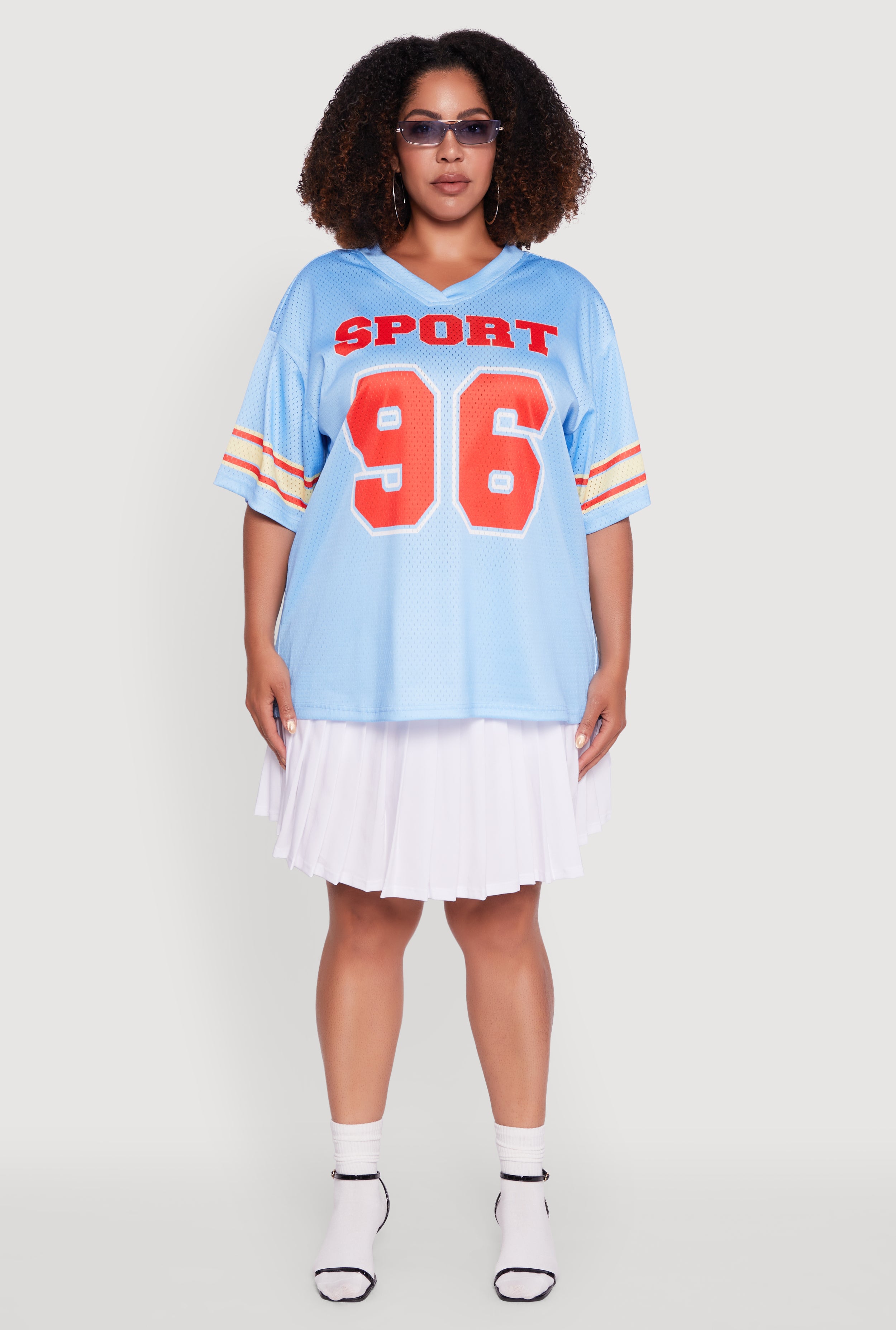 Step up your casual game with the Plus Size Sport 96 Graphic Football Jersey. Designed for comfort and style, this classic fit jersey features a bold graphic print and varsity stripe detail that bring sporty vibes to your everyday look. The breathable jersey mesh fabric keeps you cool whether you're cheering from the sidelines or just out and about. With its flattering V-neck and short sleeves, it’s the perfect blend of athleisure and casual cool for your wardrobe.