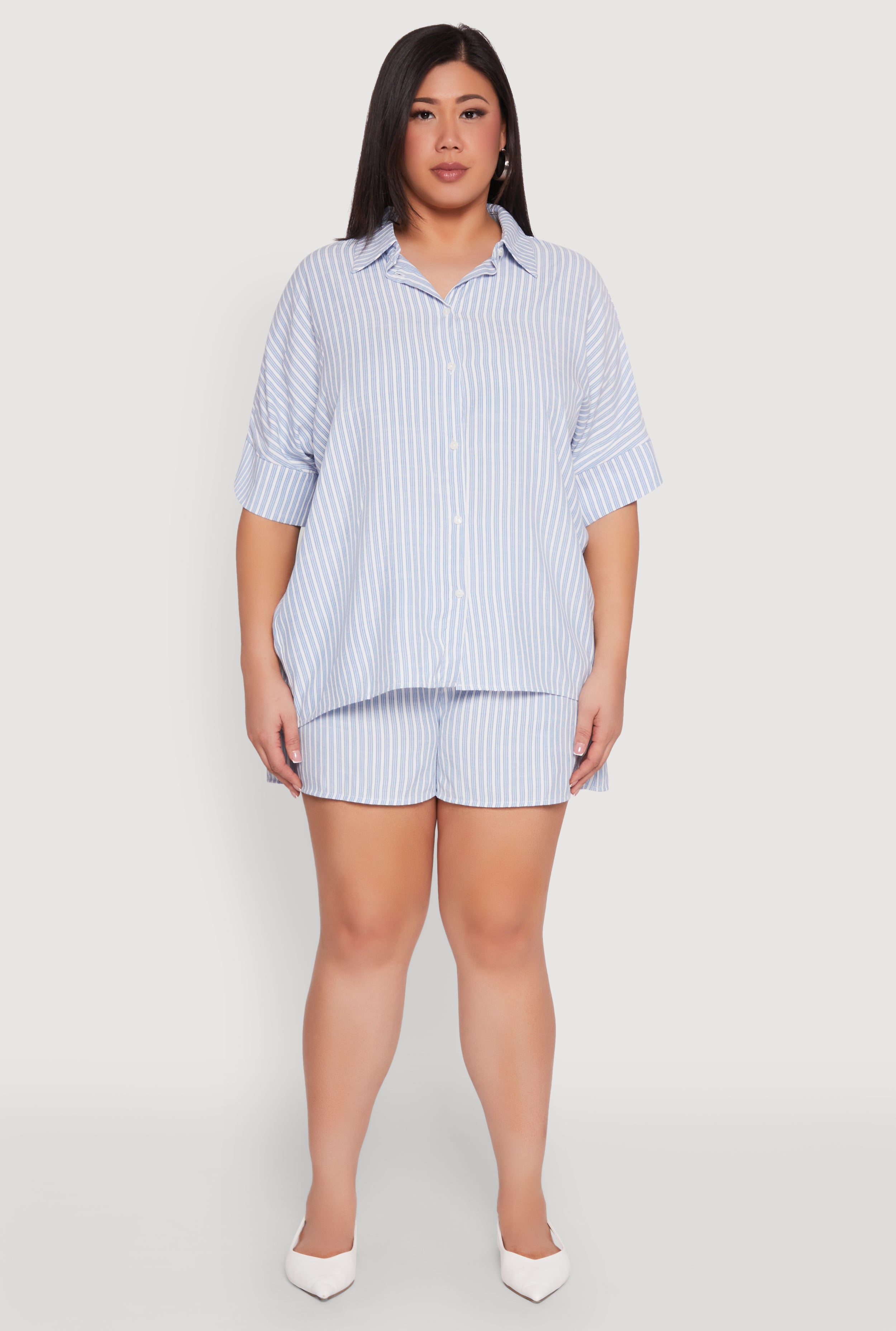 Upgrade your wardrobe with our Plus Size Striped Button Front Shirt, the perfect blend of classic style and effortless comfort. Featuring a timeless silhouette with a crisp shirt collar and 3/4 sleeves, this top is your go-to for versatile looks that never go out of fashion. Whether you're dressing up for a casual day out or adding a polished touch to your set, this shirt is designed to make you look and feel fabulous. Embrace your curves and showcase your style with confidence in this must-have piece.