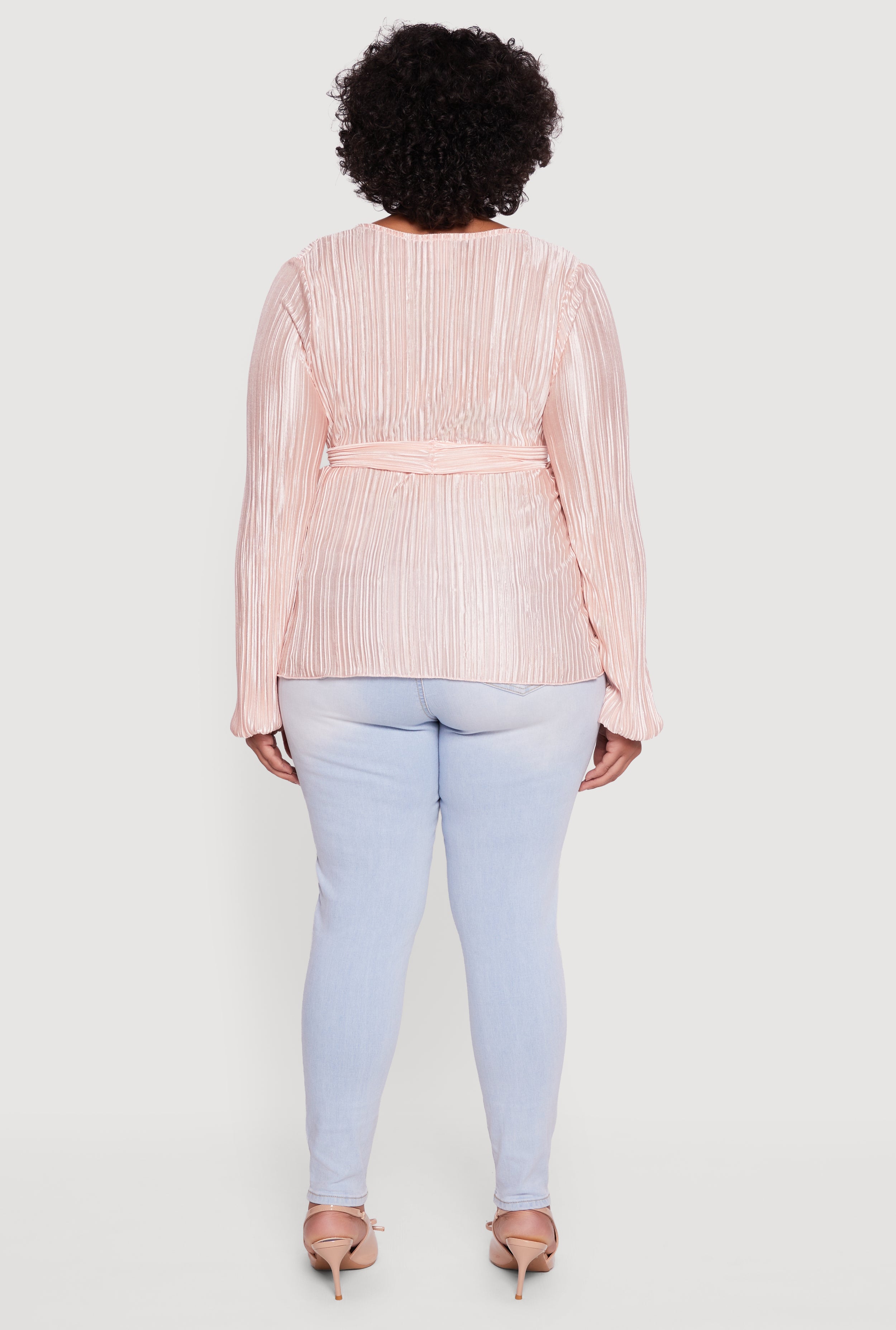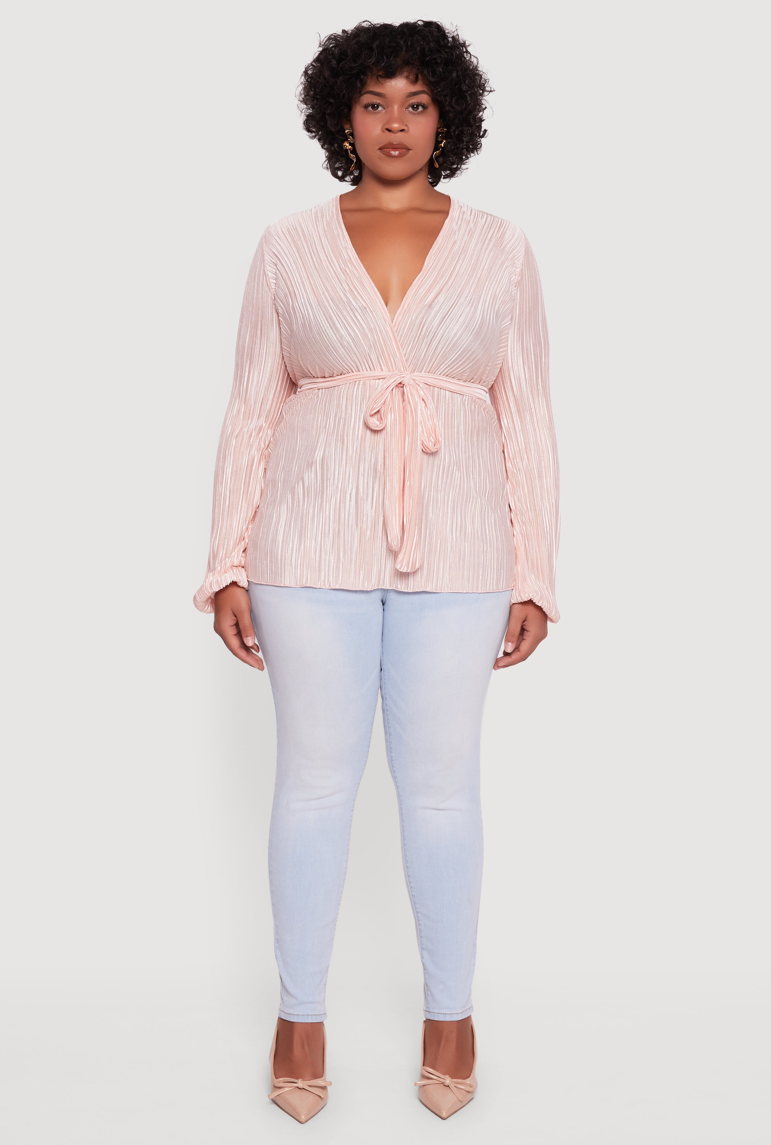 Step out in style with this Plus Size Plisse Long Sleeve Tie Waist Wrap Top designed to flatter every curve. The classic fit and timeless V-neck silhouette make it your go-to for a night out or any dressy occasion. The delicate plisse fabric adds a sheer, textured vibe that’s effortlessly chic, while the adjustable tie waist lets you customize your look for maximum confidence. Ready to turn heads and feel fabulous? This wrap top is your new wardrobe MVP.