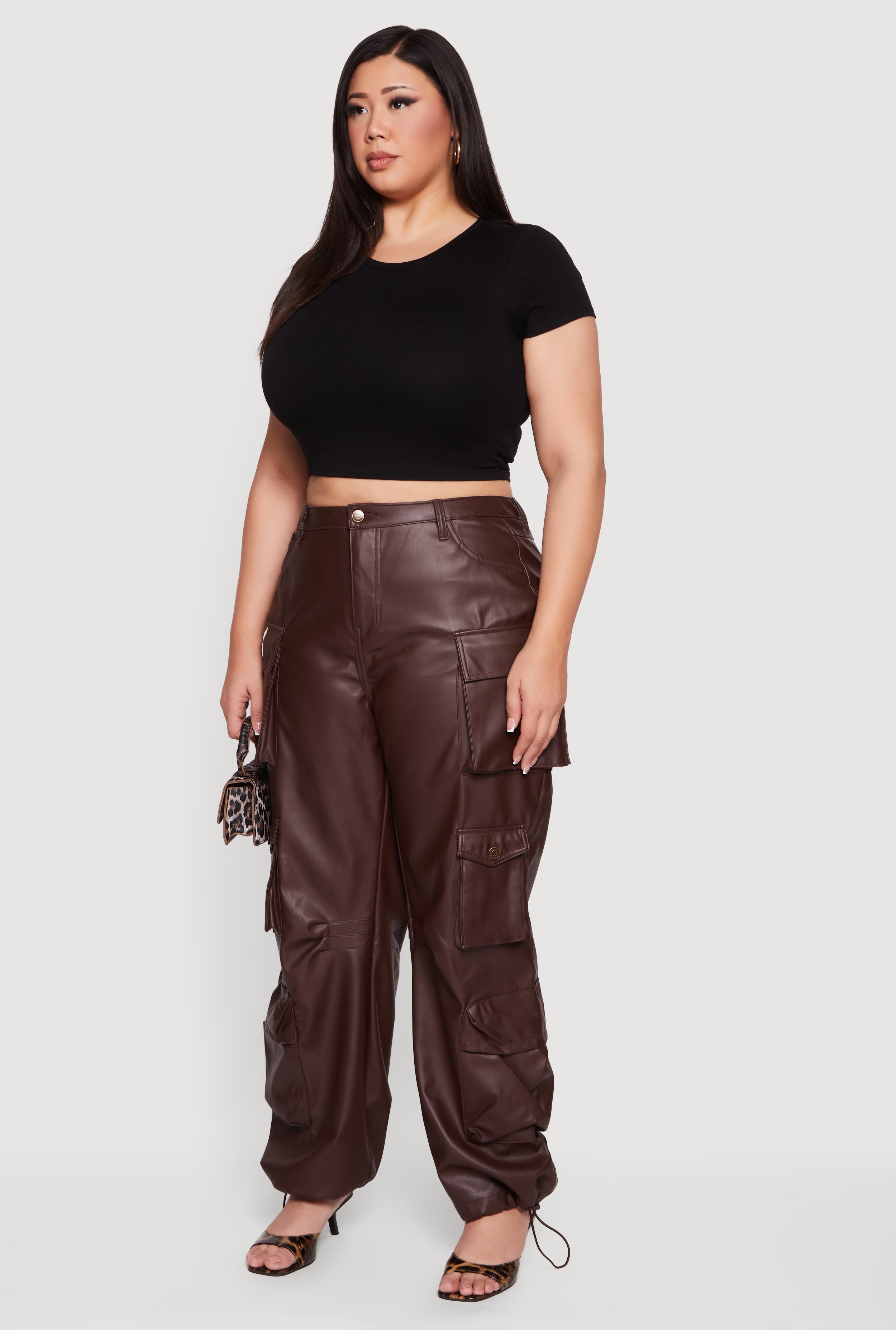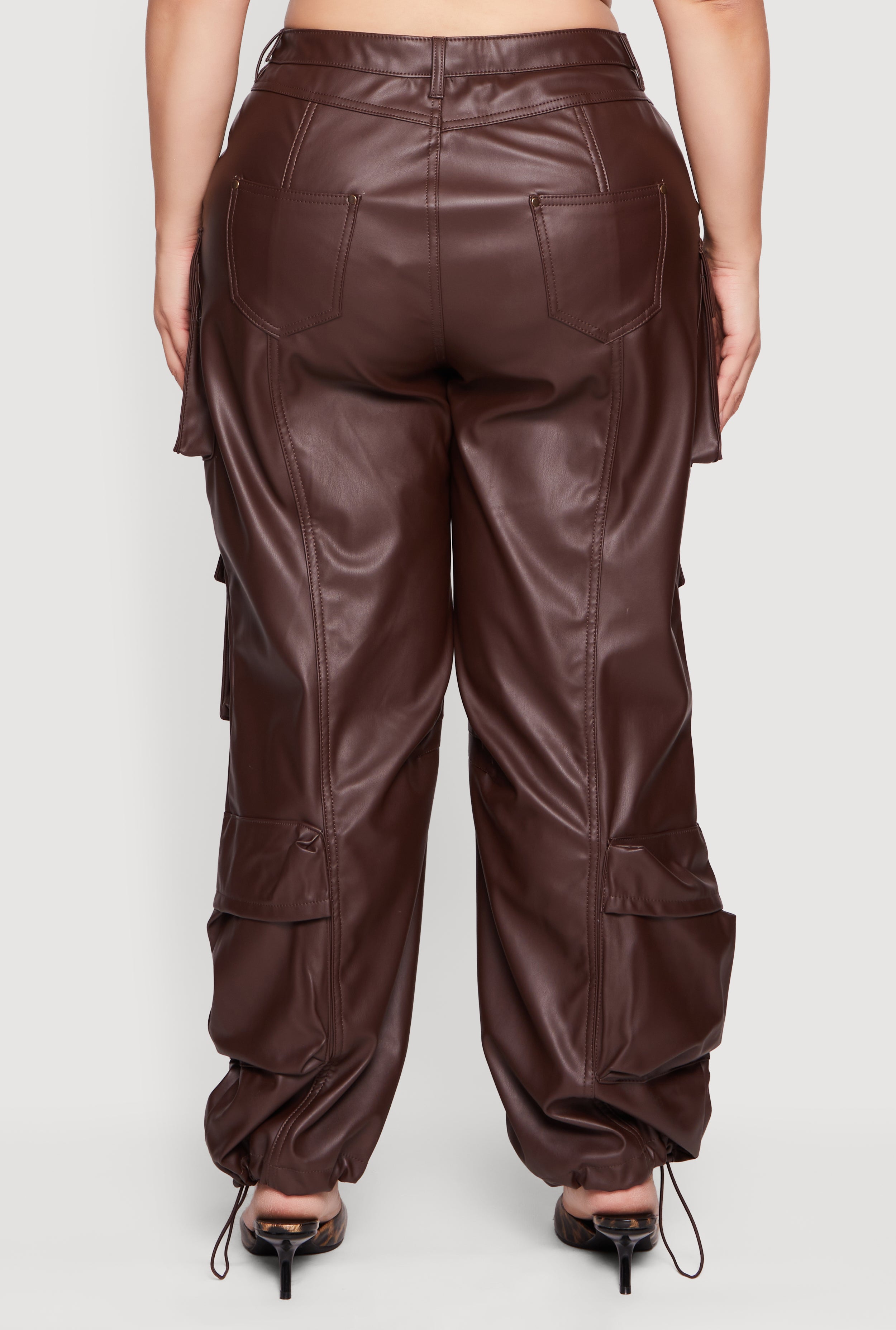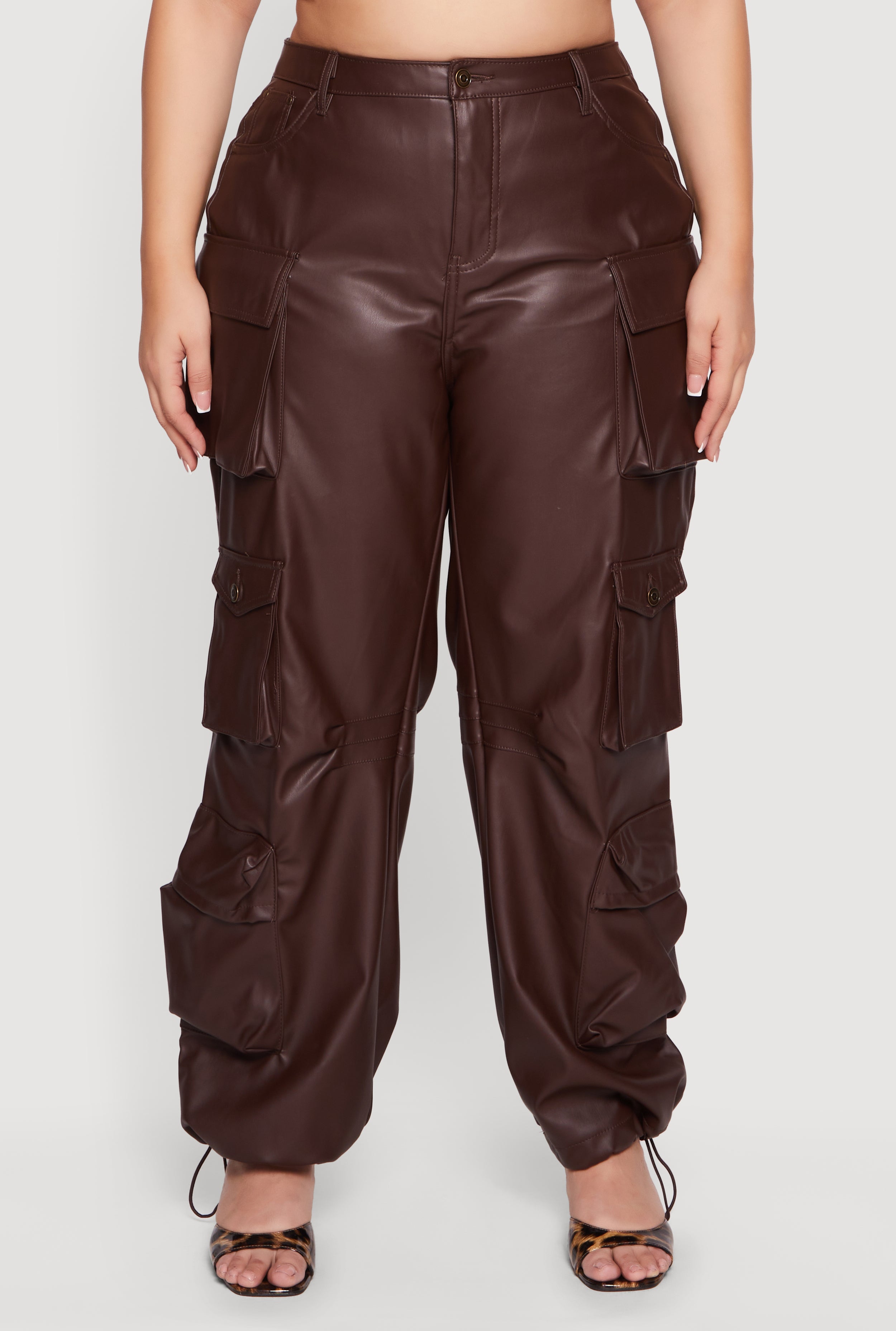 Step up your style game with these Plus Size High Waisted Faux Leather Cargo Joggers that blend edgy vibes with ultimate comfort. Designed for the bold and trendy, these joggers feature a high waist to flatter your curves and a baggy, tapered leg for that cool, casual look. The soft fleece lining keeps you cozy, while the faux leather exterior adds a sleek, festival-ready edge. Adjustable toggle drawstring hems let you customize your fit, and practical cargo pockets bring both style and function to your everyday outfit.
