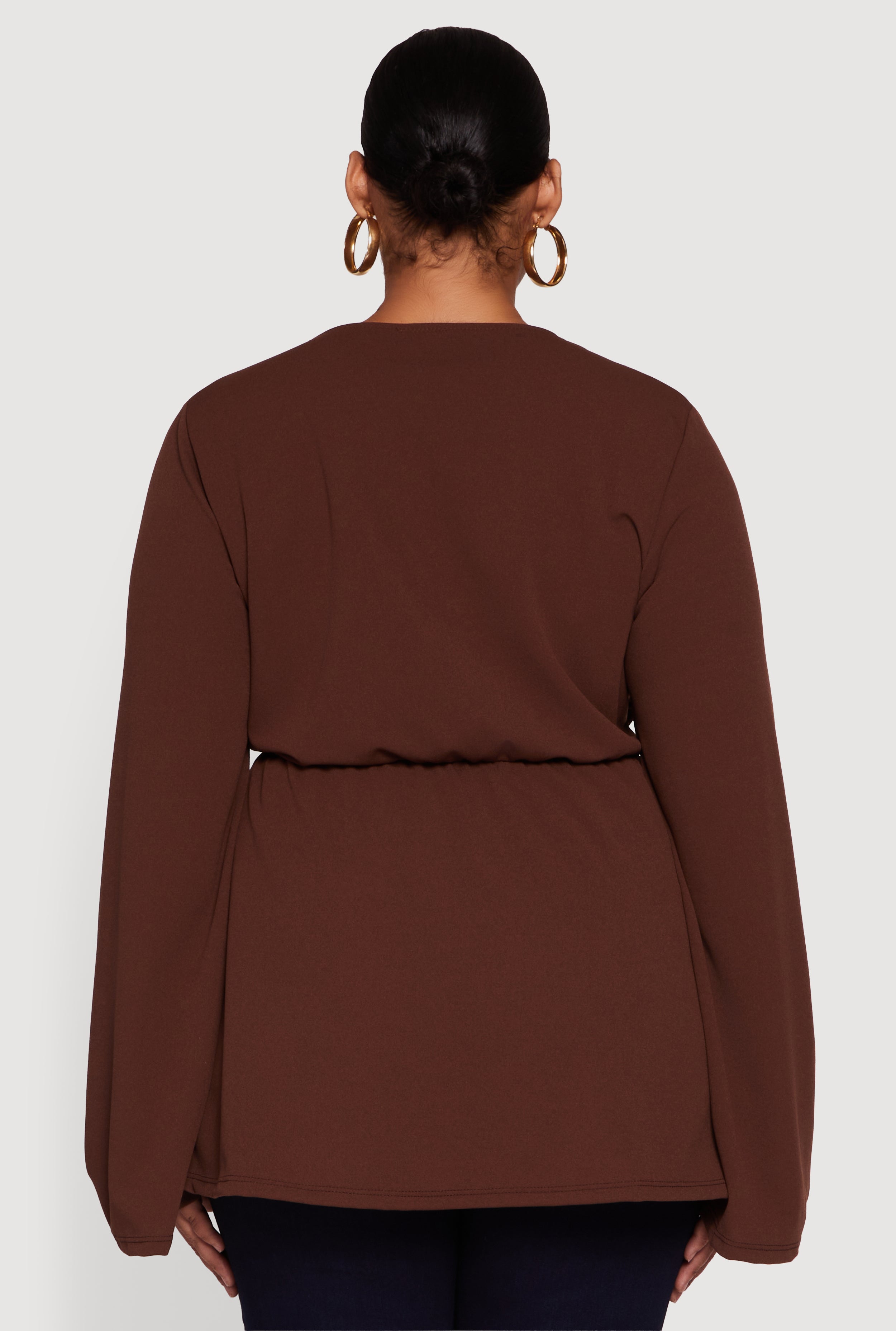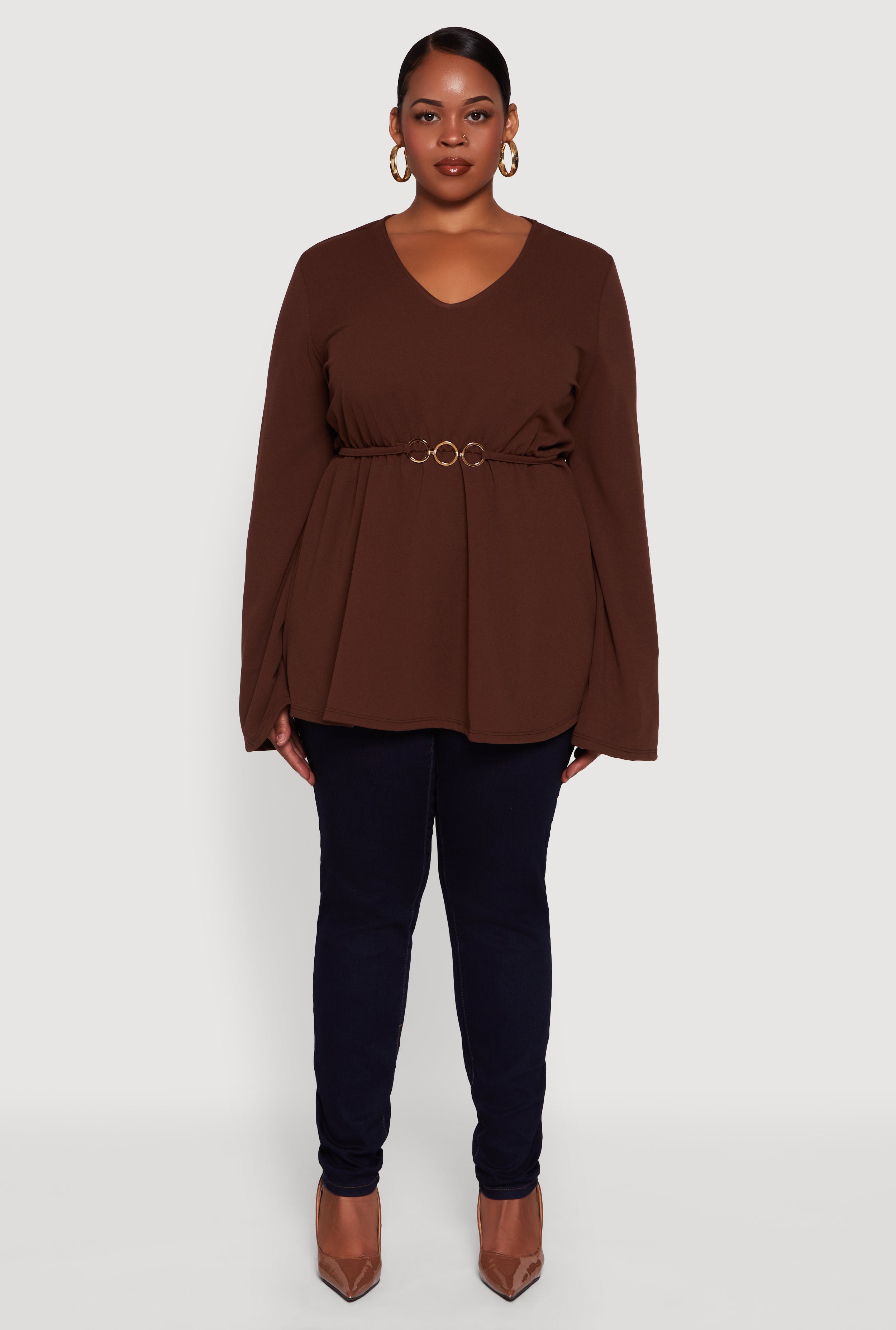 Step into the spotlight with this Plus Size Metallic Belted Front V Neck Bell Sleeve Blouse. Designed to flatter every curve with its classic fit and shimmering metallic crepe knit, this blouse effortlessly blends casual vibes with night-out glam. The belted front cinches your waist for a flattering silhouette, while the dramatic bell sleeves add a playful touch that moves with you. Whether you’re dressing up for a night out or keeping it cool and casual, this blouse is your new go-to for instant style and confidence.