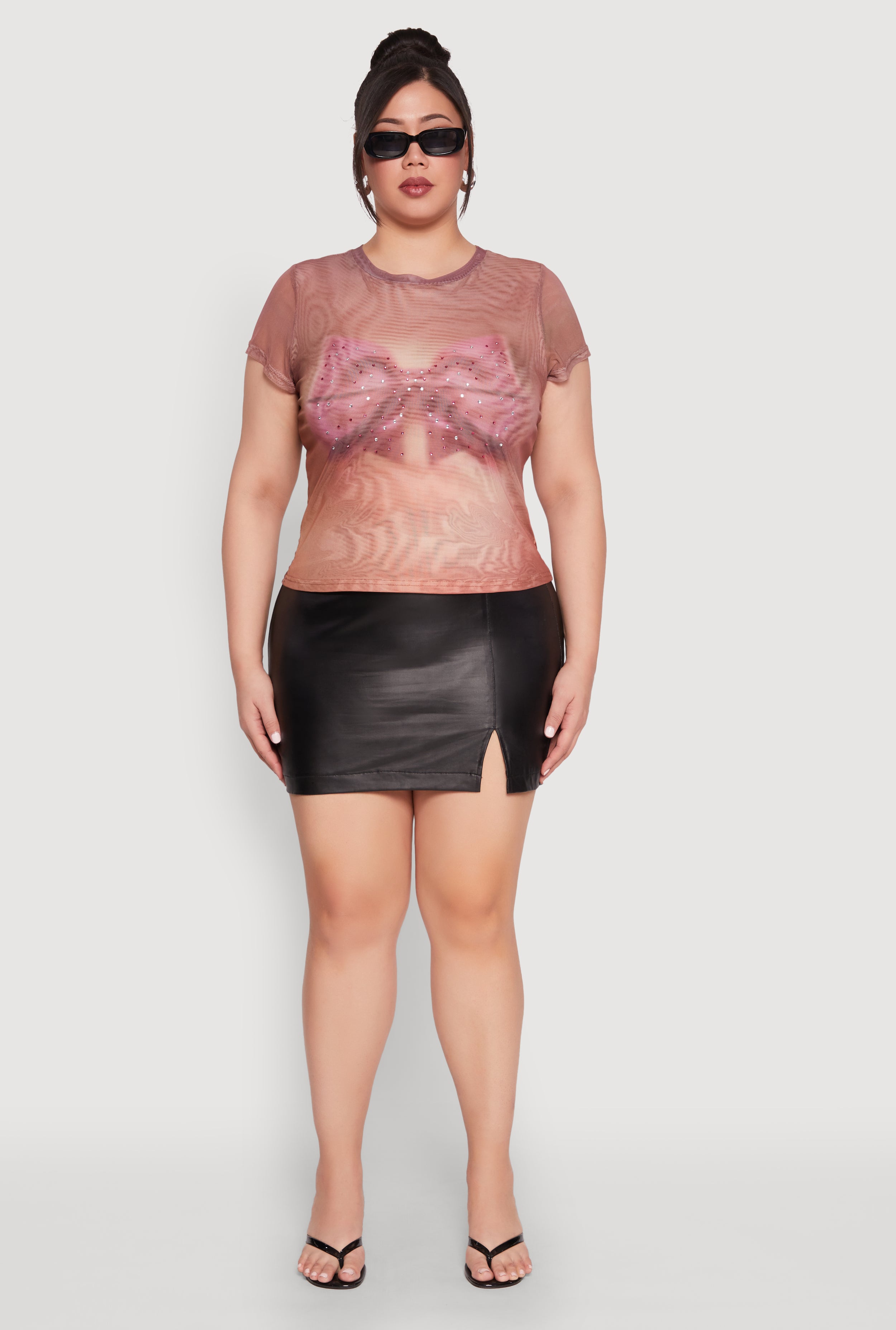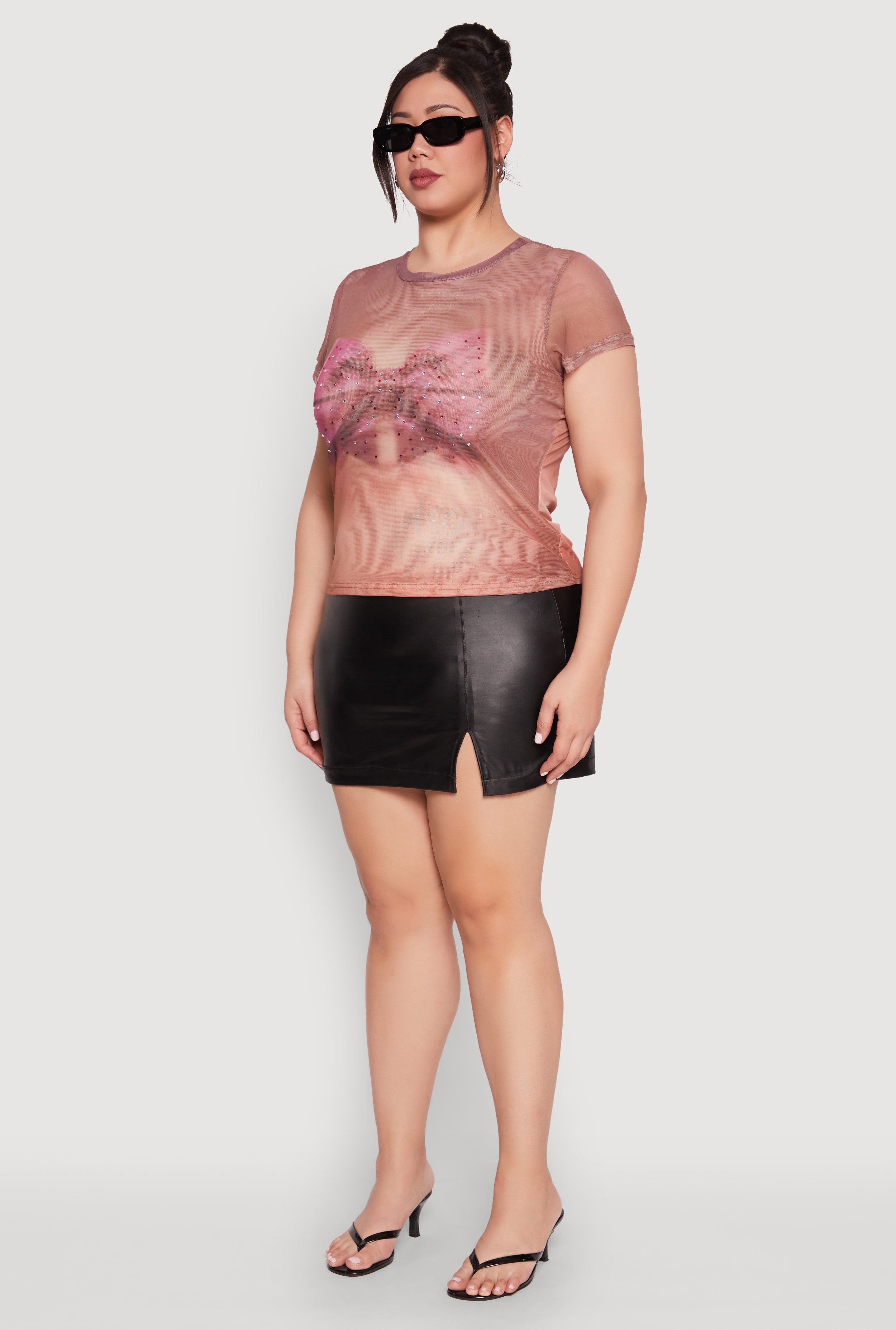 Step up your style game with our Plus Size Rhinestone Studded Graphic Print Mesh Tee. Perfect for turning heads at the club or out with friends, this tee combines edgy glamour with a comfy, classic fit. The sheer mesh fabric adds a daring vibe, while the rhinestones and graphic print give it that perfect pop of sparkle. Whether you're hitting the dance floor or just want to feel fabulous, this top is your new go-to for bold, effortless style.