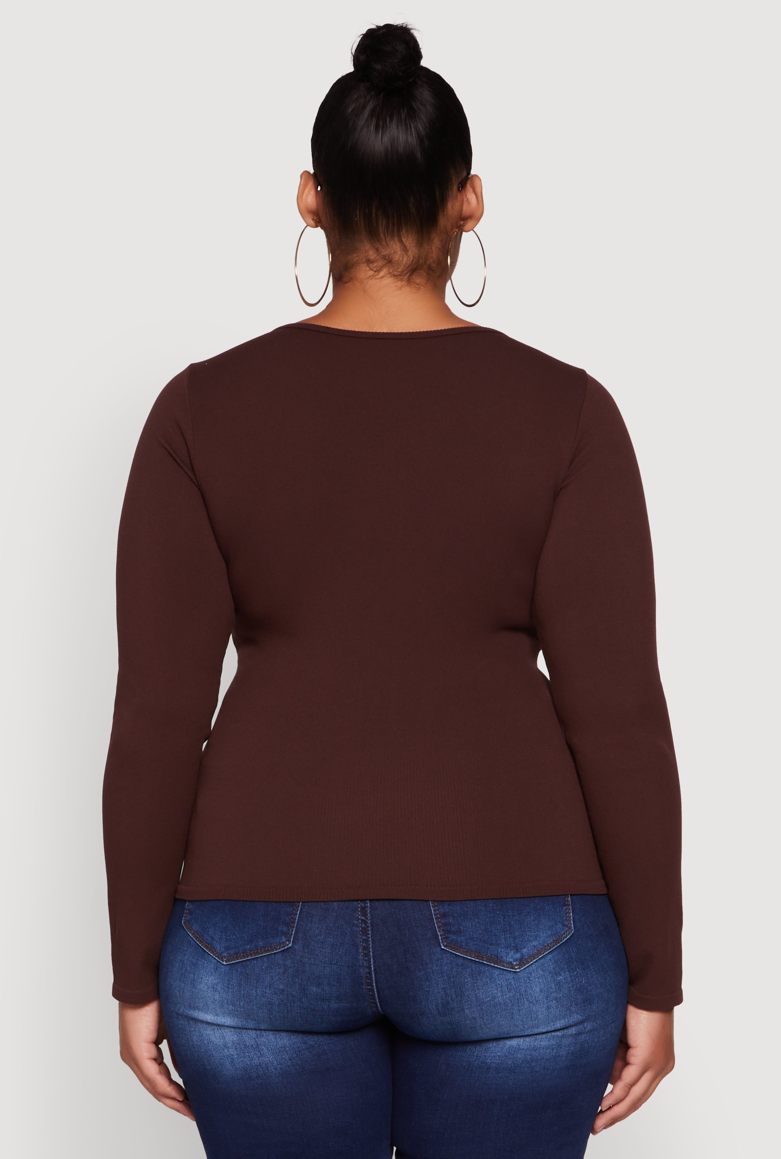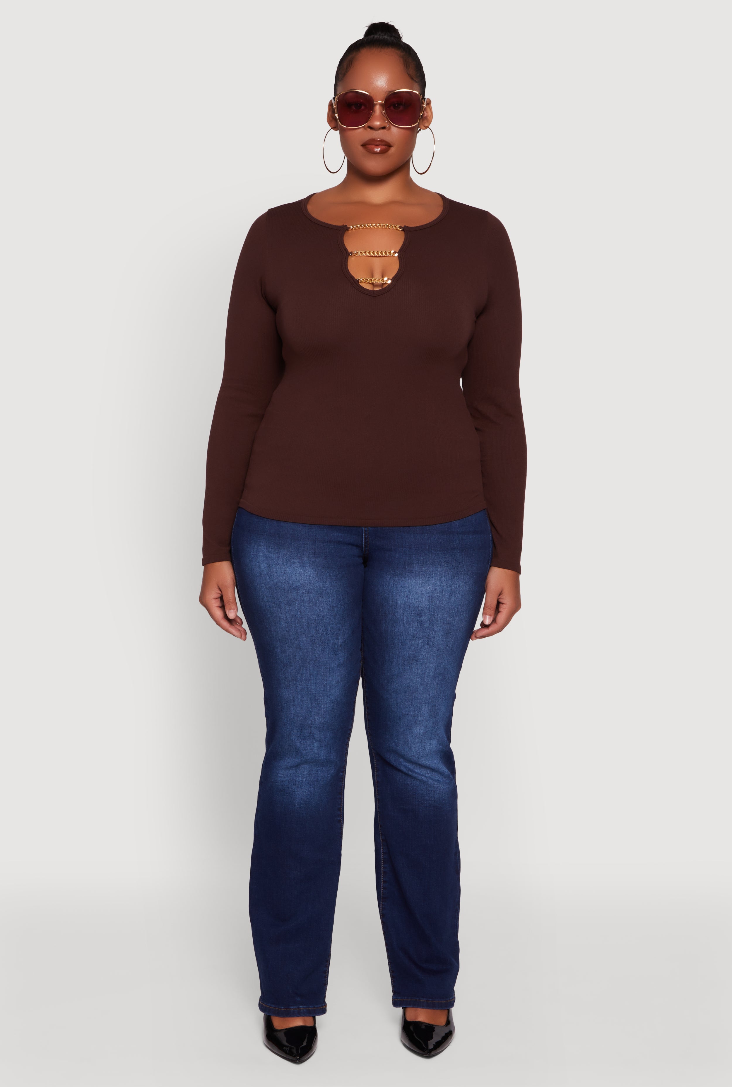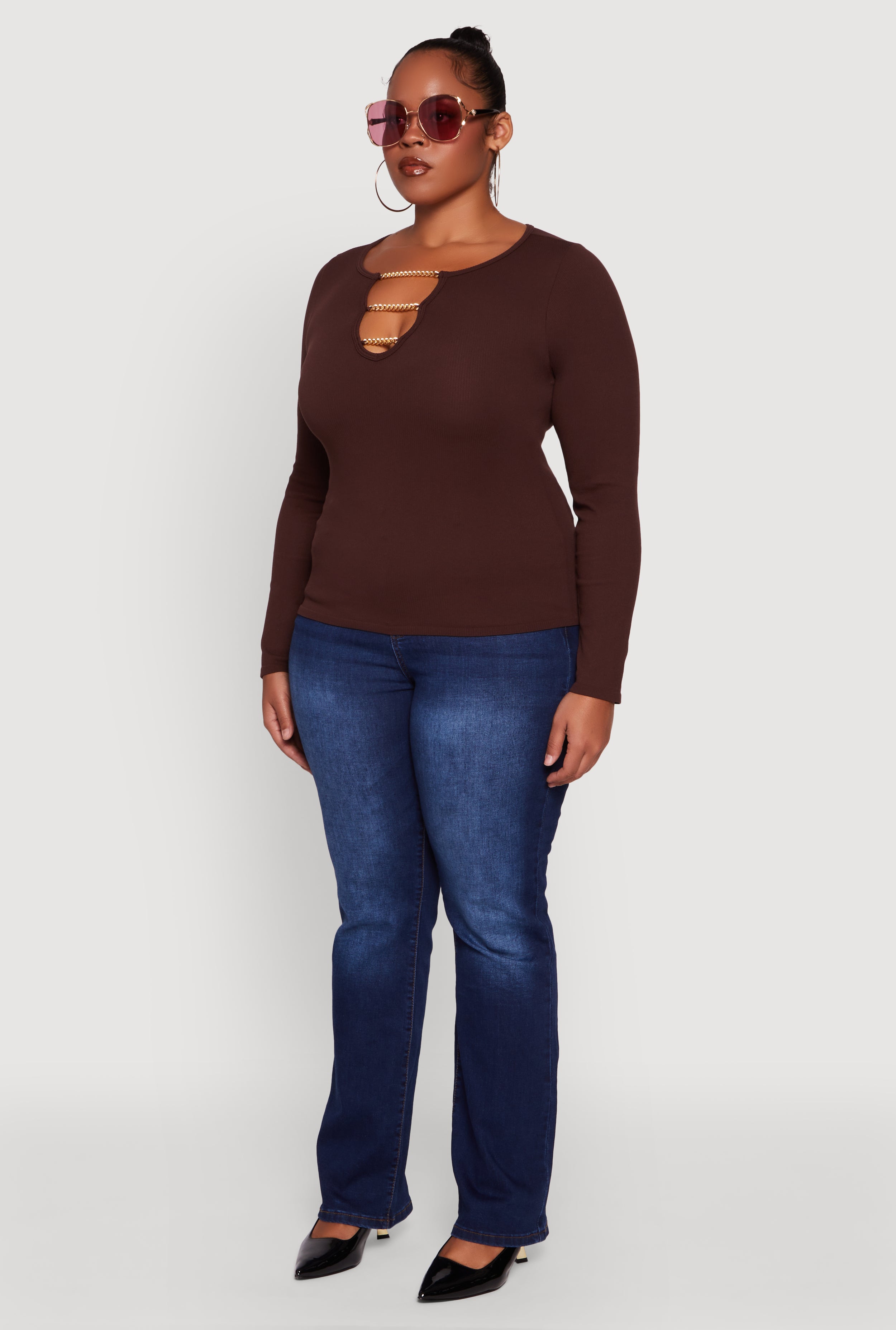 Plus Size Rib Knit Metallic Chain Keyhole Neckline Top
