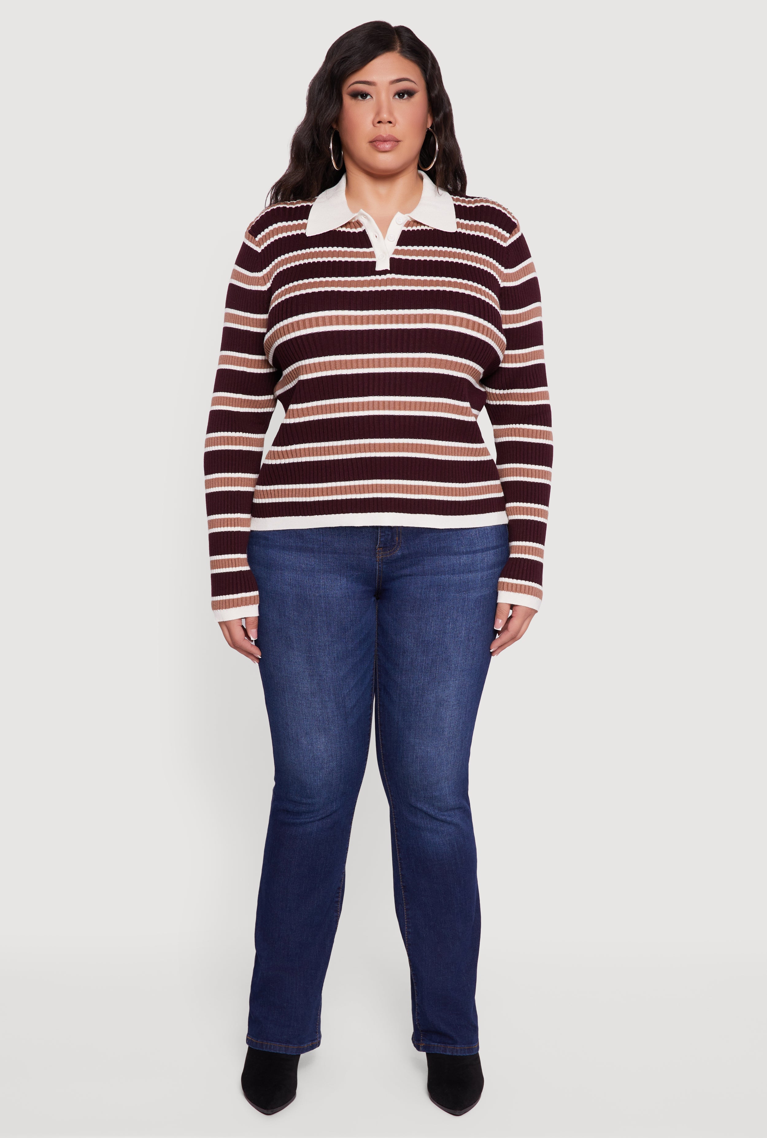 Step up your casual game with this Plus Size Striped Rib Knit Polo Sweater. Designed with a classic fit and timeless polo collar, this sweater combines comfort and style effortlessly. The ribbed knit fabric adds texture and stretch, while the bold stripes keep your look fresh and fun. Perfect for layering or wearing solo, it’s your new go-to for easy everyday vibes.