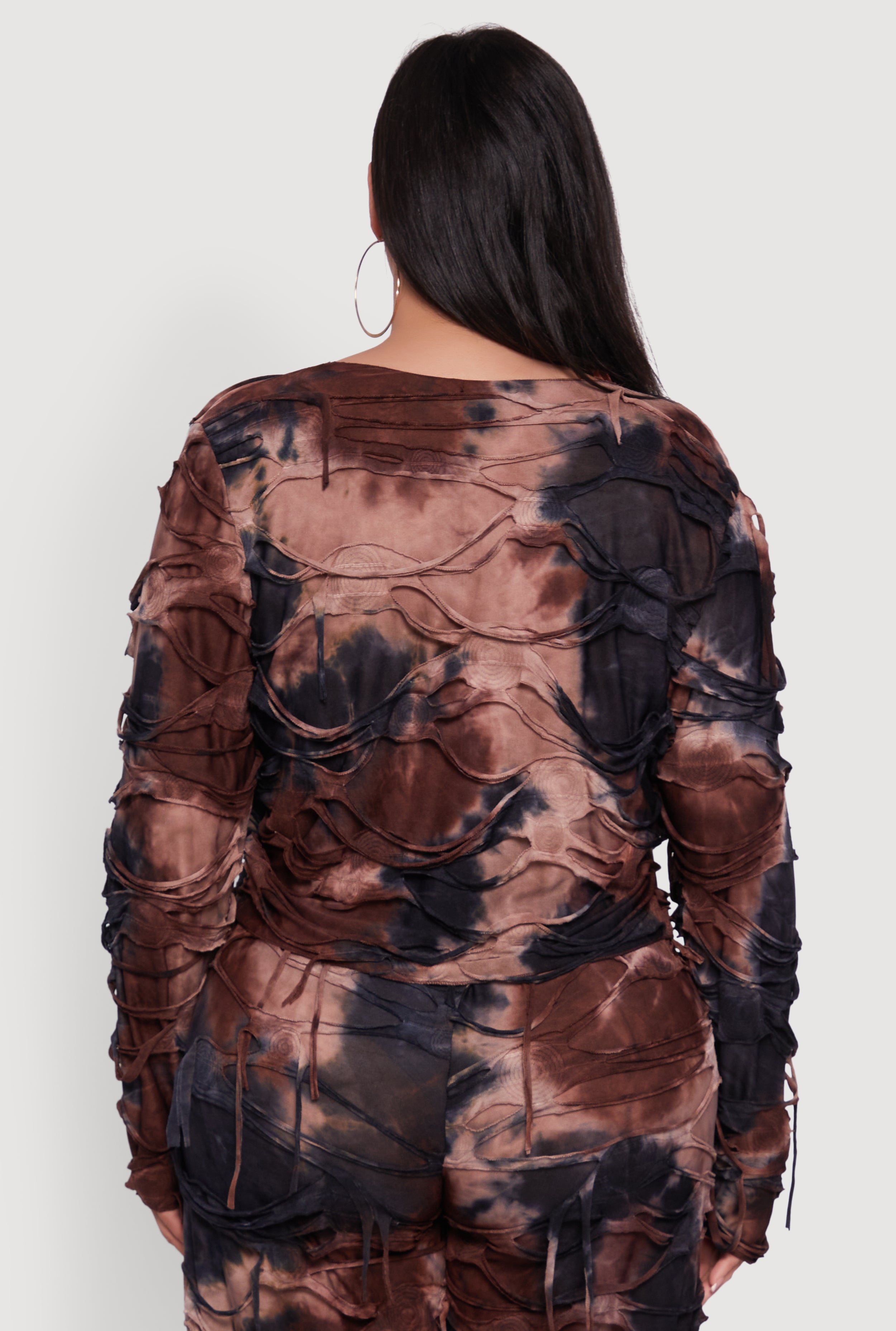 Step into effortless cool with the Plus Size Tie Dye Slashed Tie Front Top. This classic fit top brings a fresh twist to your wardrobe with its edgy distressed details and trendy tie front hem. The long sleeves and flattering V-neck make it perfect for festival vibes or a night out with your crew. Ready to turn heads and keep things comfy, this top is your new go-to for making bold style statements without trying too hard.