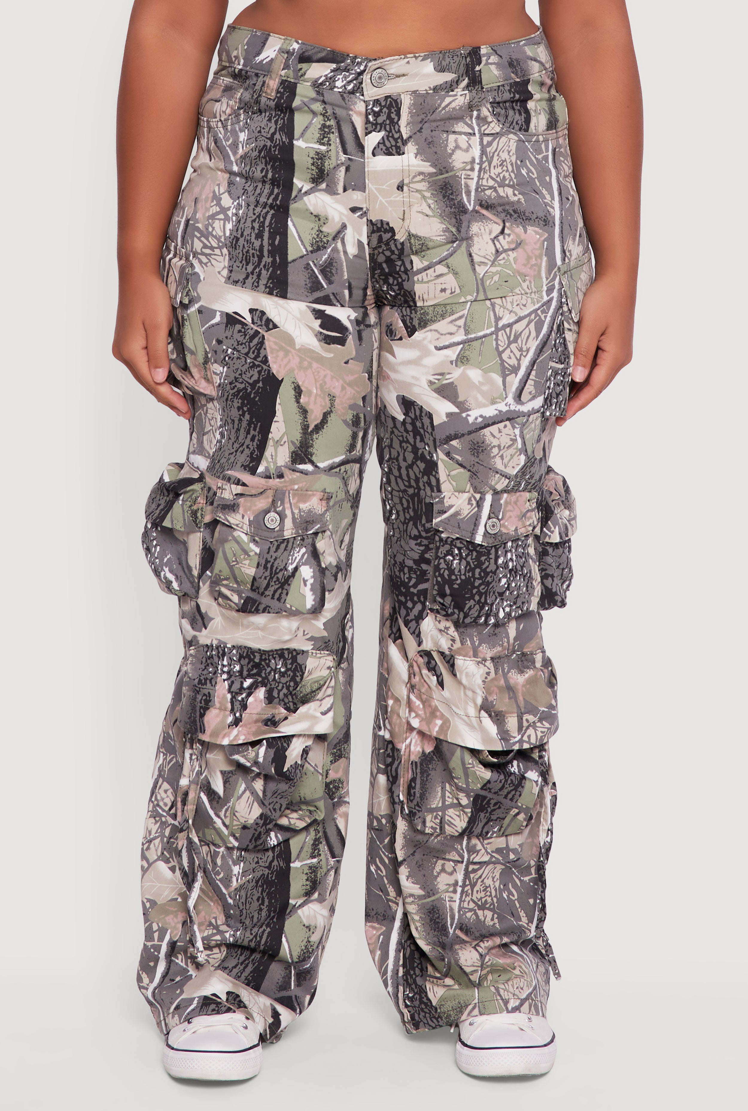 Step up your casual game with these Plus Size VIP Camo Wide Leg Utility Pants. Designed for those who love a blend of style and comfort, these cargo pants feature a trendy hunter's camo print that adds a cool edge to any outfit. The mid rise and wide leg cut offer a flattering, loose fit that moves with you all day long. Whether you're running errands or meeting friends, these pants bring utility and fashion together effortlessly. Plus, the zipper closure keeps things sleek and easy.