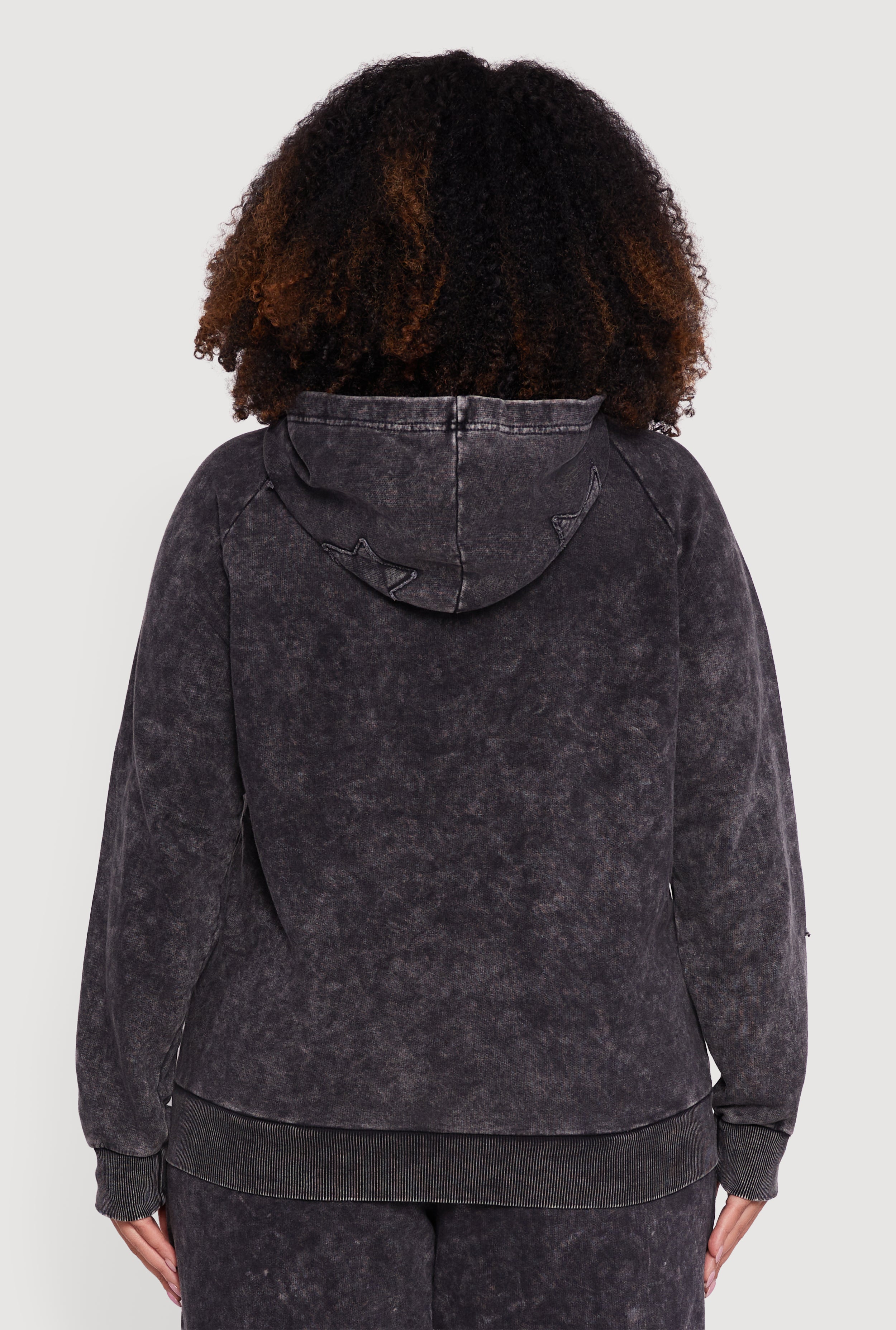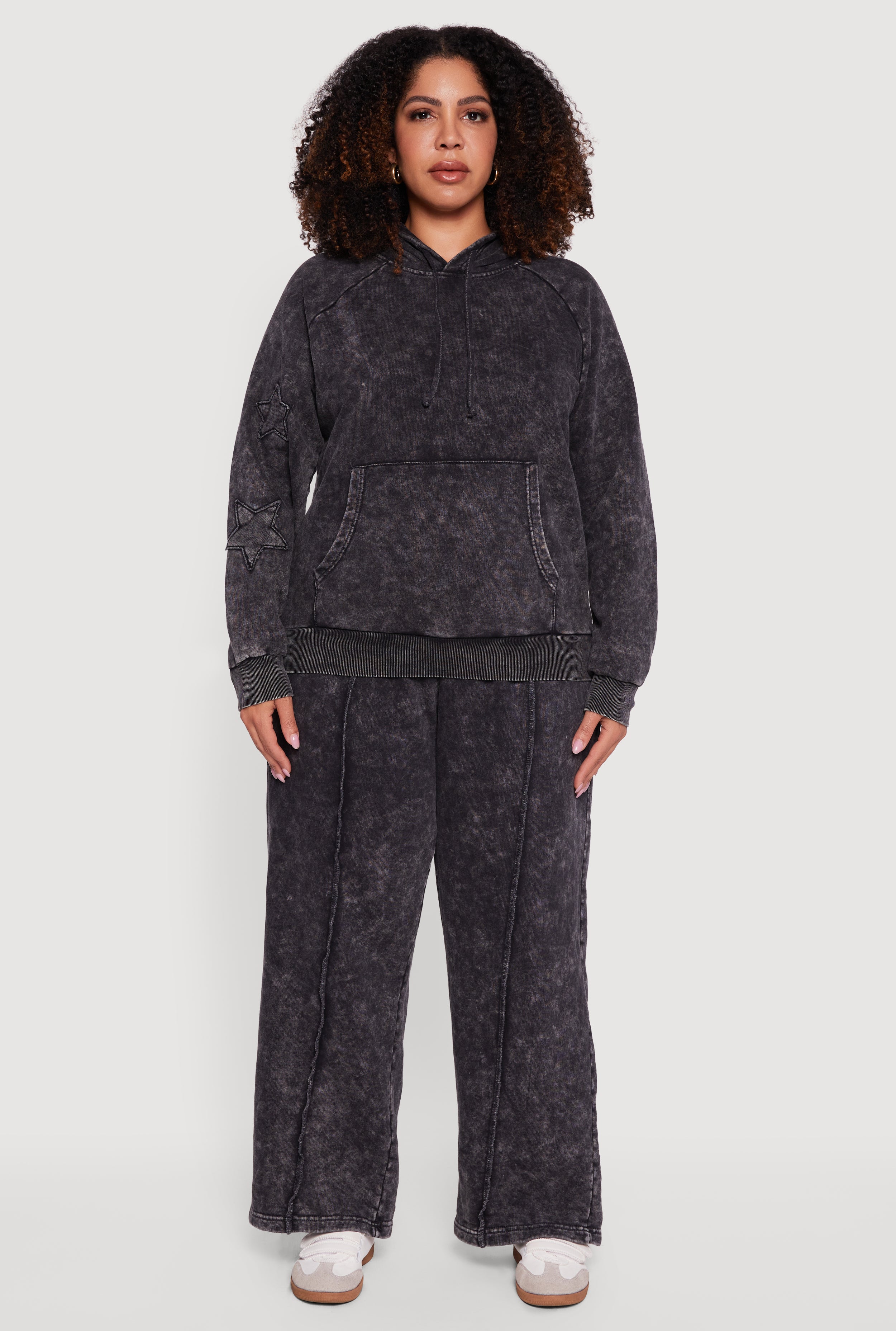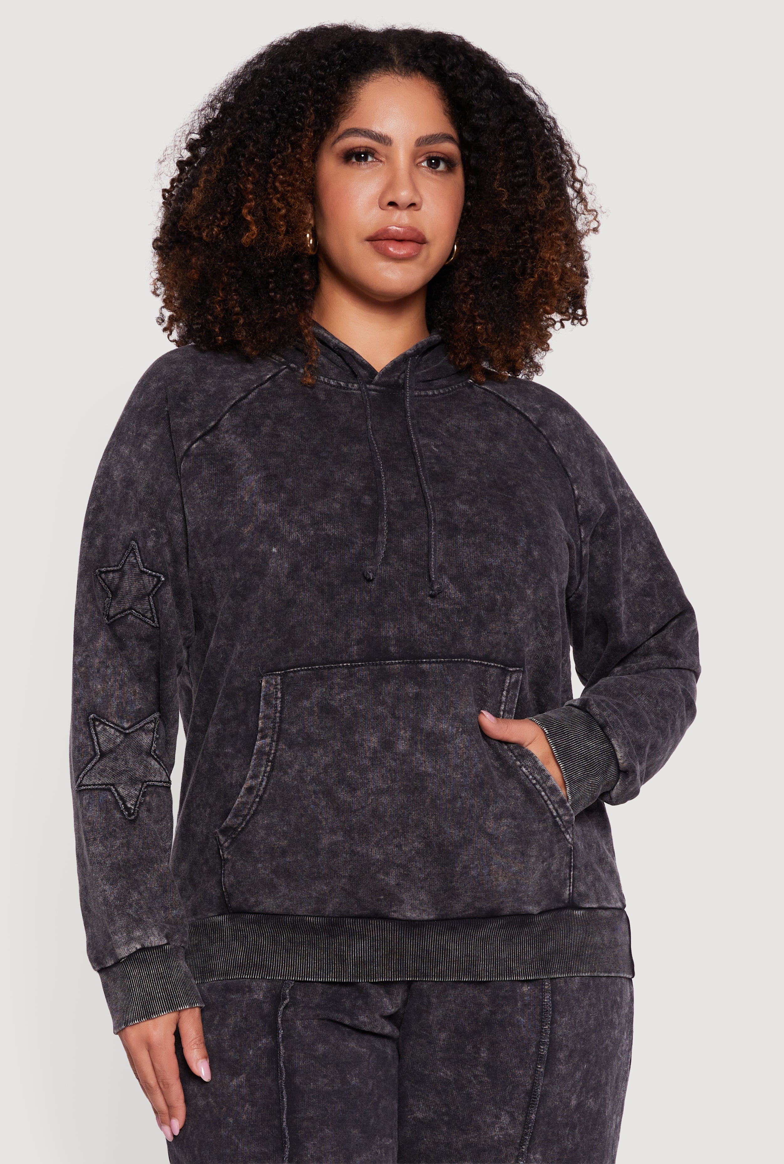 Step up your casual game with this Plus Size Star Patch Graphic Acid Wash Hooded Sweatshirt. Designed with a classic fit and made from soft French Terry, it offers the perfect blend of comfort and style. The acid wash pattern adds a trendy vintage vibe, while the star patch and decorative stitching bring playful details that make this hoodie stand out. Featuring a cozy hood with drawstring closure and a convenient kangaroo pocket, it’s your go-to for laid-back days or athleisure looks.