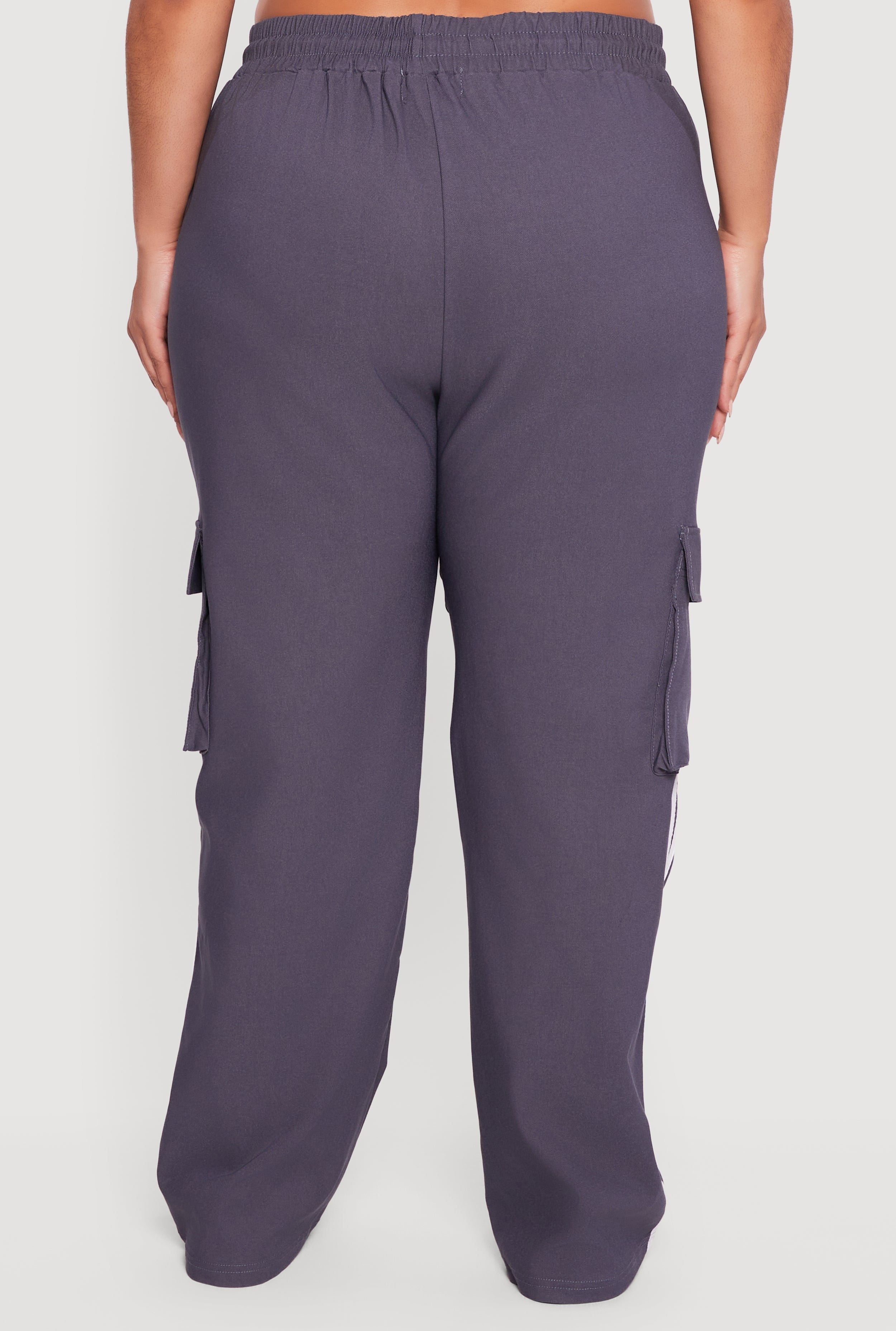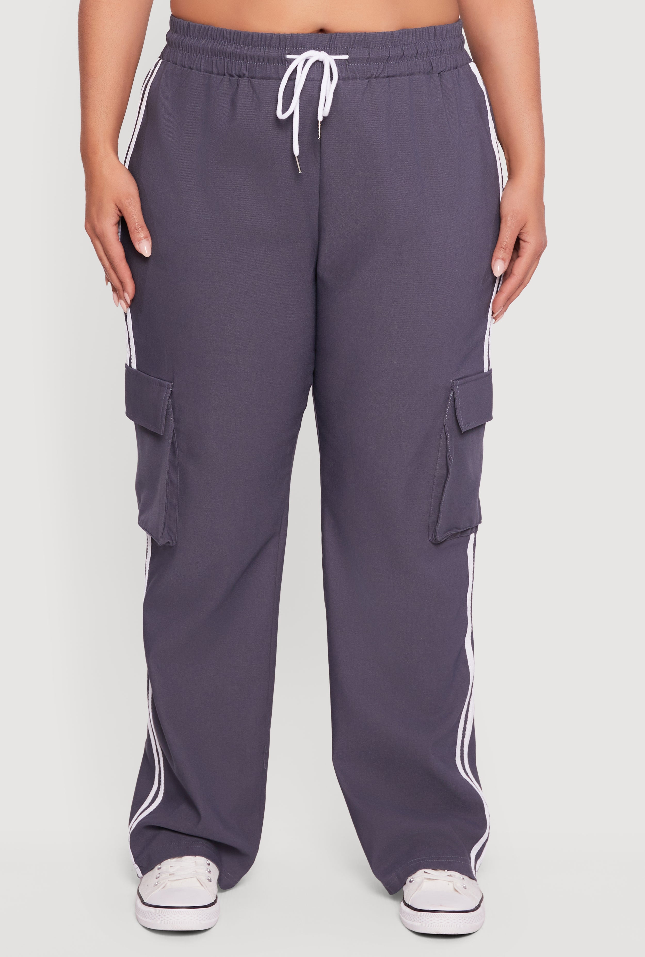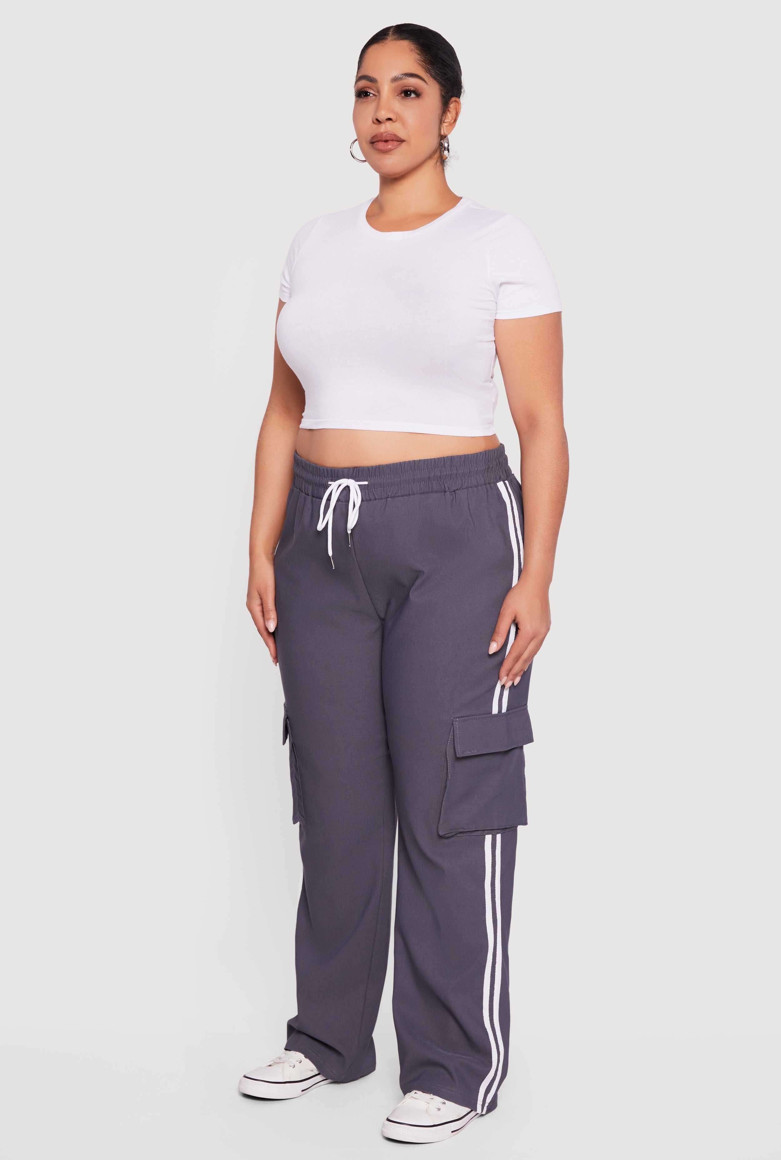 Step up your casual game with these Plus Size Varsity Stripe High Waisted Cargo Pants. Designed to blend sporty vibes with everyday comfort, these wide-leg cargo pants feature a high waist for a flattering fit and a relaxed silhouette that moves with you. The varsity stripe detail adds a trendy touch while practical cargo pockets keep your essentials close. Perfect for chill days or athleisure looks, the drawstring closure lets you customize your fit with ease.