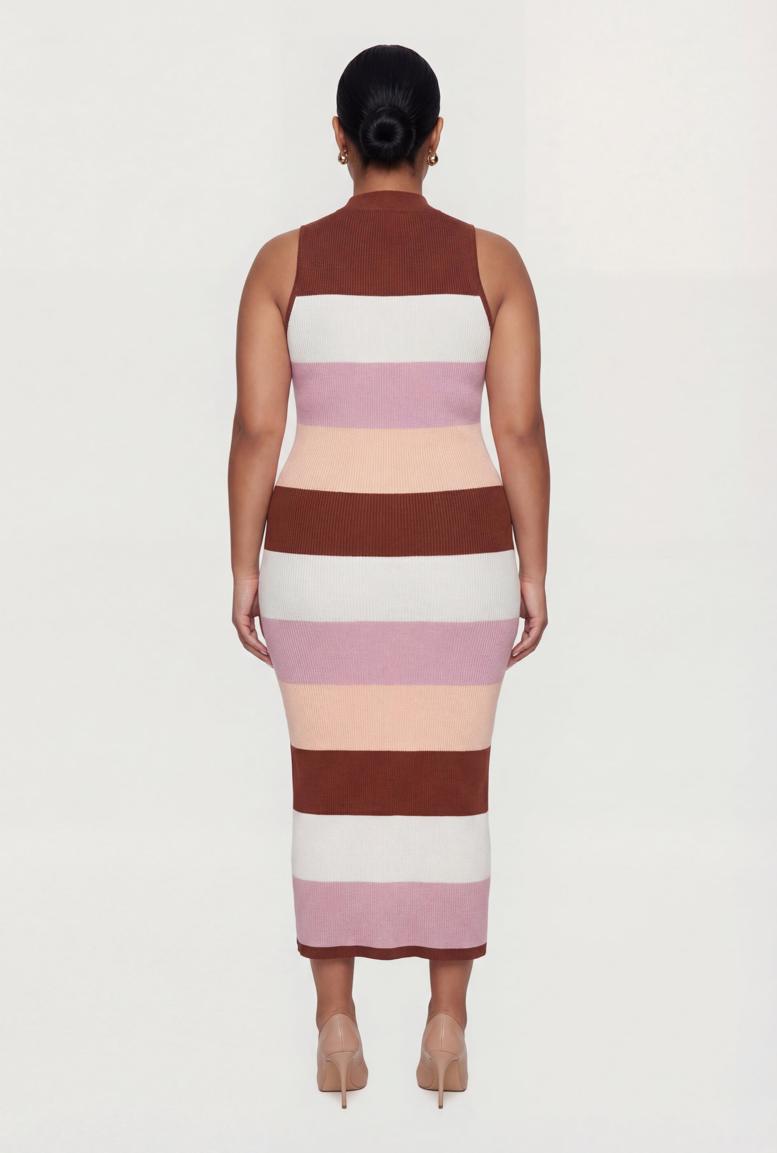 This sleeveless sweater dress features a mock neck and a curve-hugging silhouette that flatters plus size figures. Its long length and striped pattern create a casual yet polished look perfect for everyday wear.