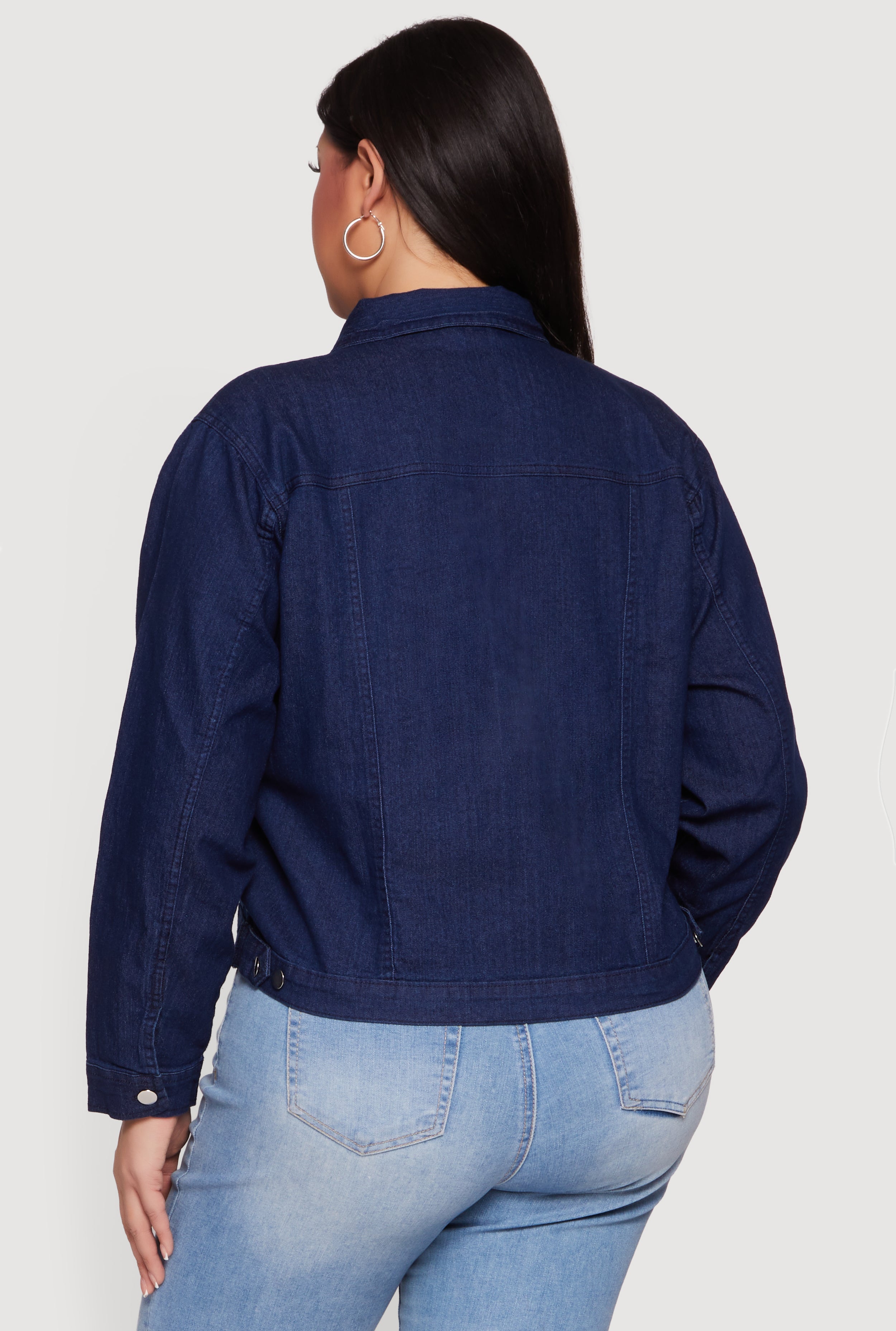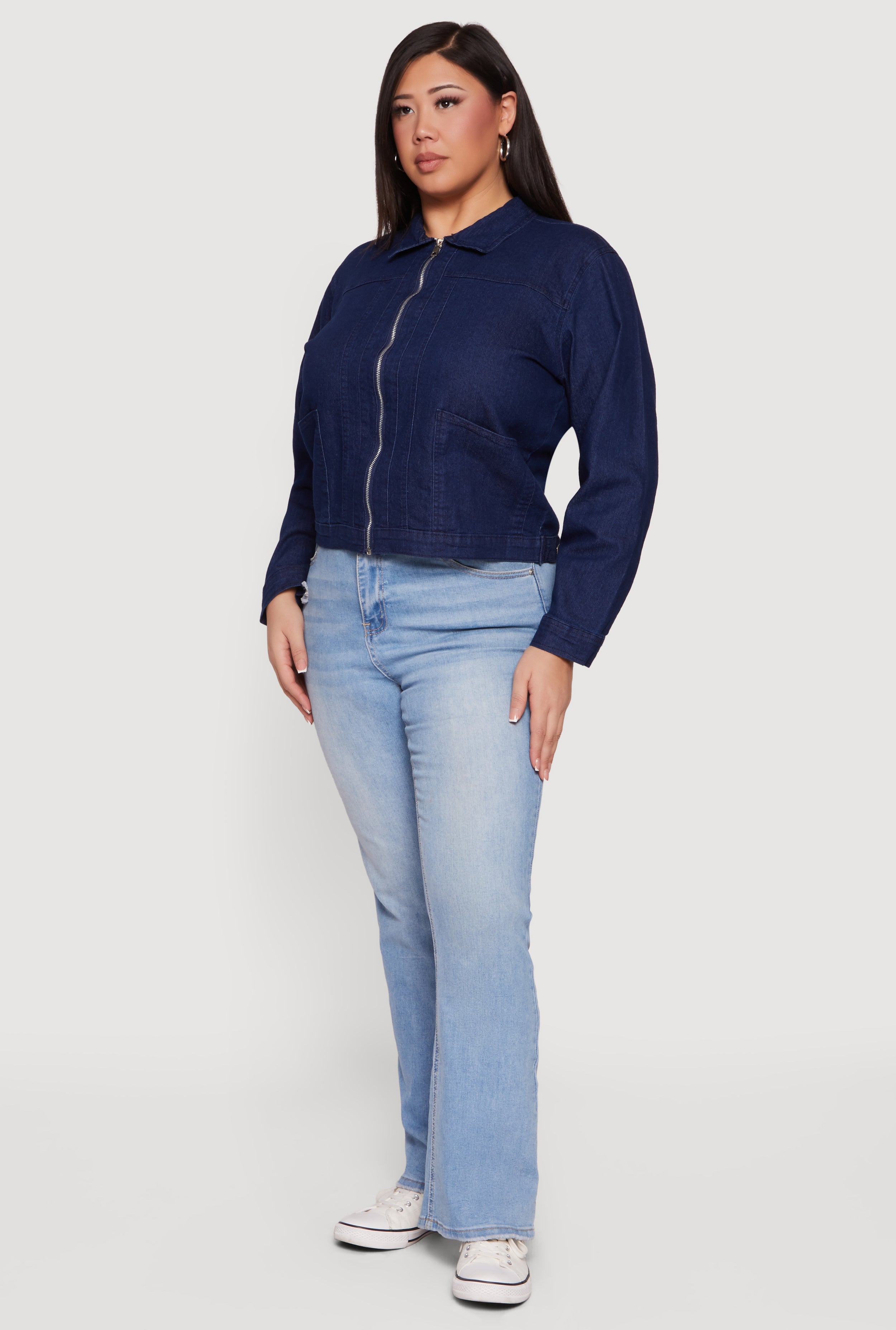 This plus size denim jacket features a classic shirt collar and long sleeves, designed with a zip front closure for easy wear. Crafted from durable denim, it offers a casual outerwear option that pairs effortlessly with a variety of outfits.