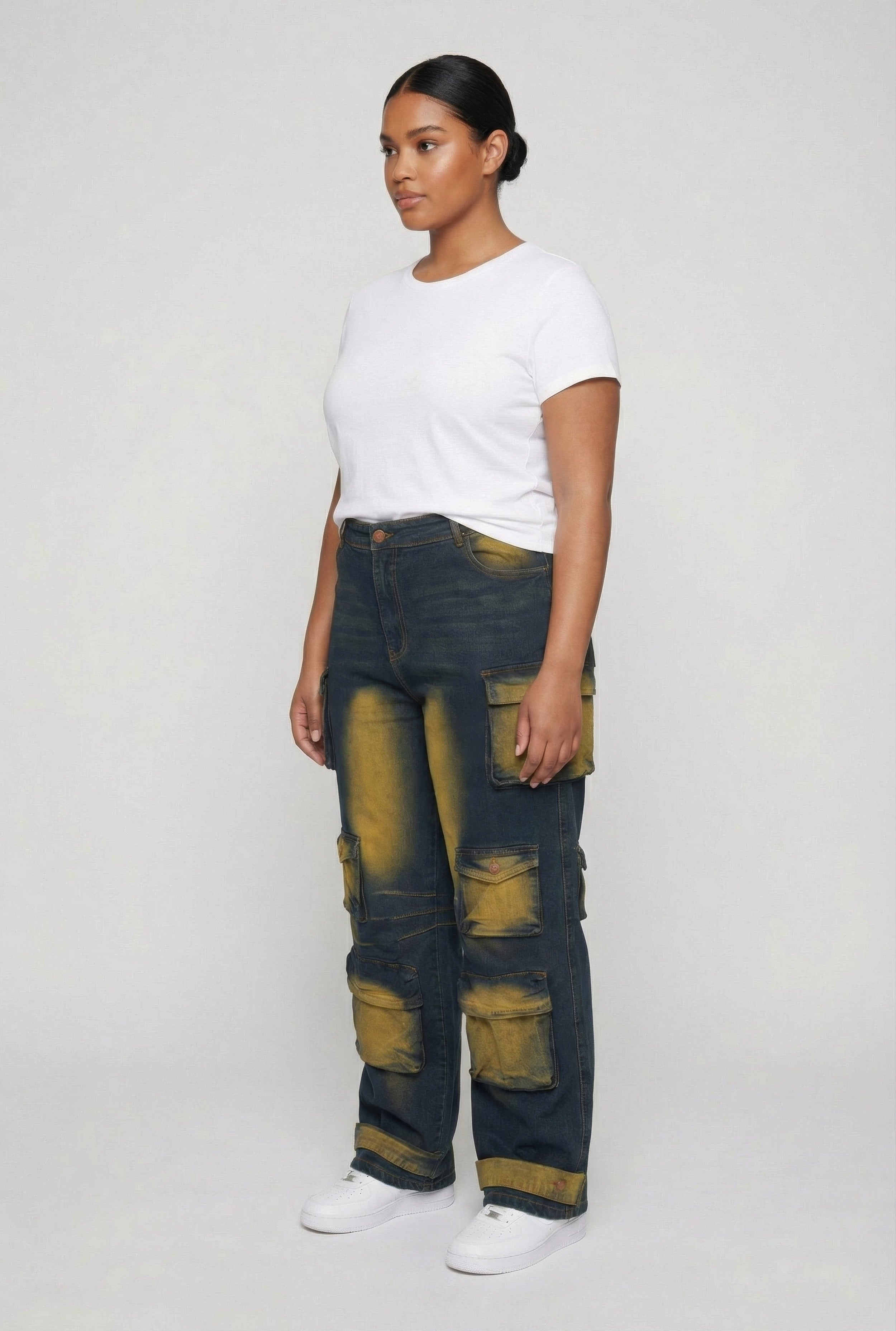 Step up your street style game with these Plus Size Bleached Detail Wide Leg Cargo Pocket Jeans. Designed to hug your curves in all the right places, these high-waisted, baggy denim jeans bring the perfect mix of comfort and edge. The bleached detailing adds a trendy twist while the cargo pockets offer both style and function. Whether you're out with friends or running errands, these jeans keep your look effortlessly cool and casual.