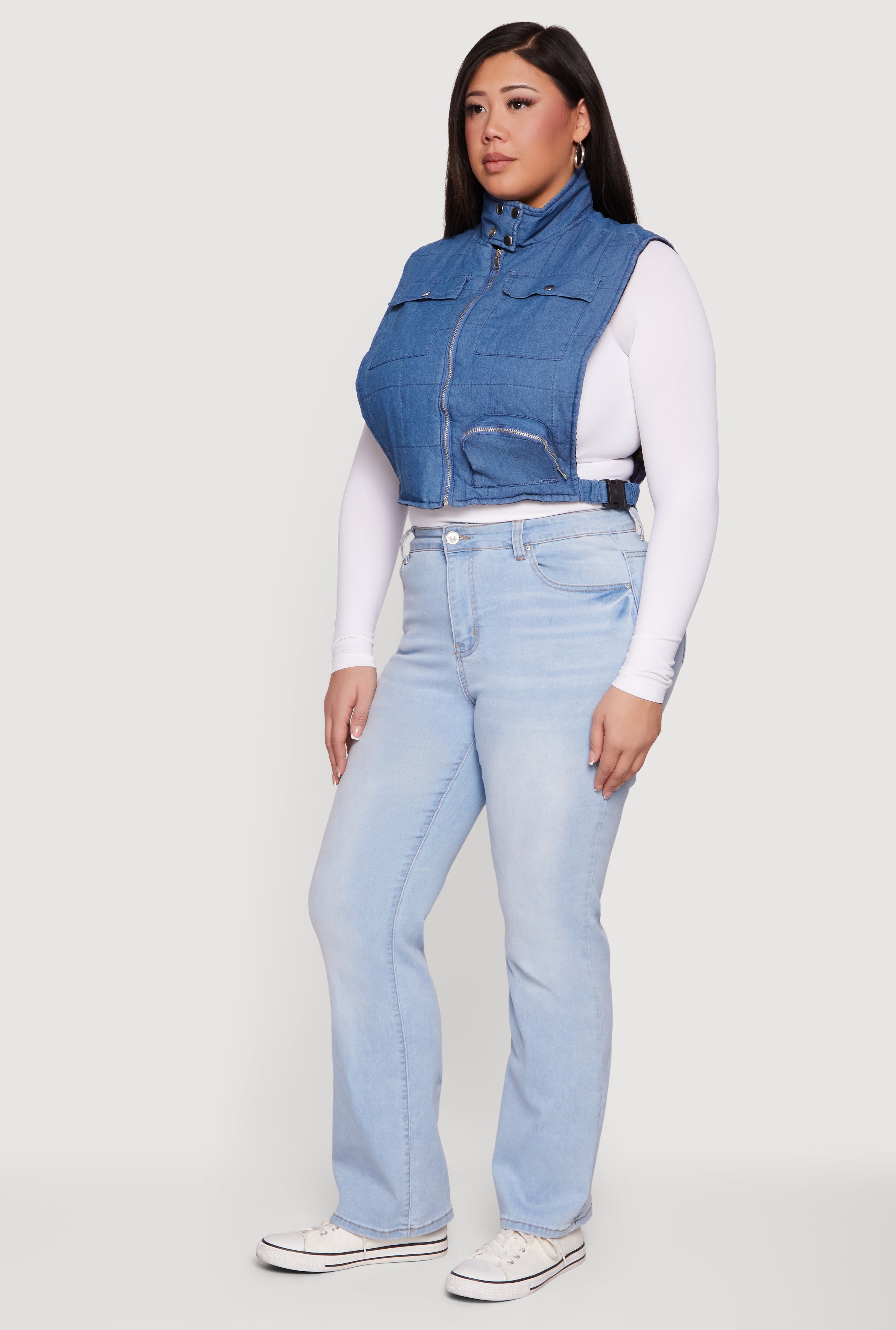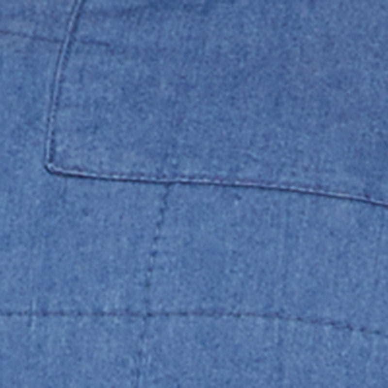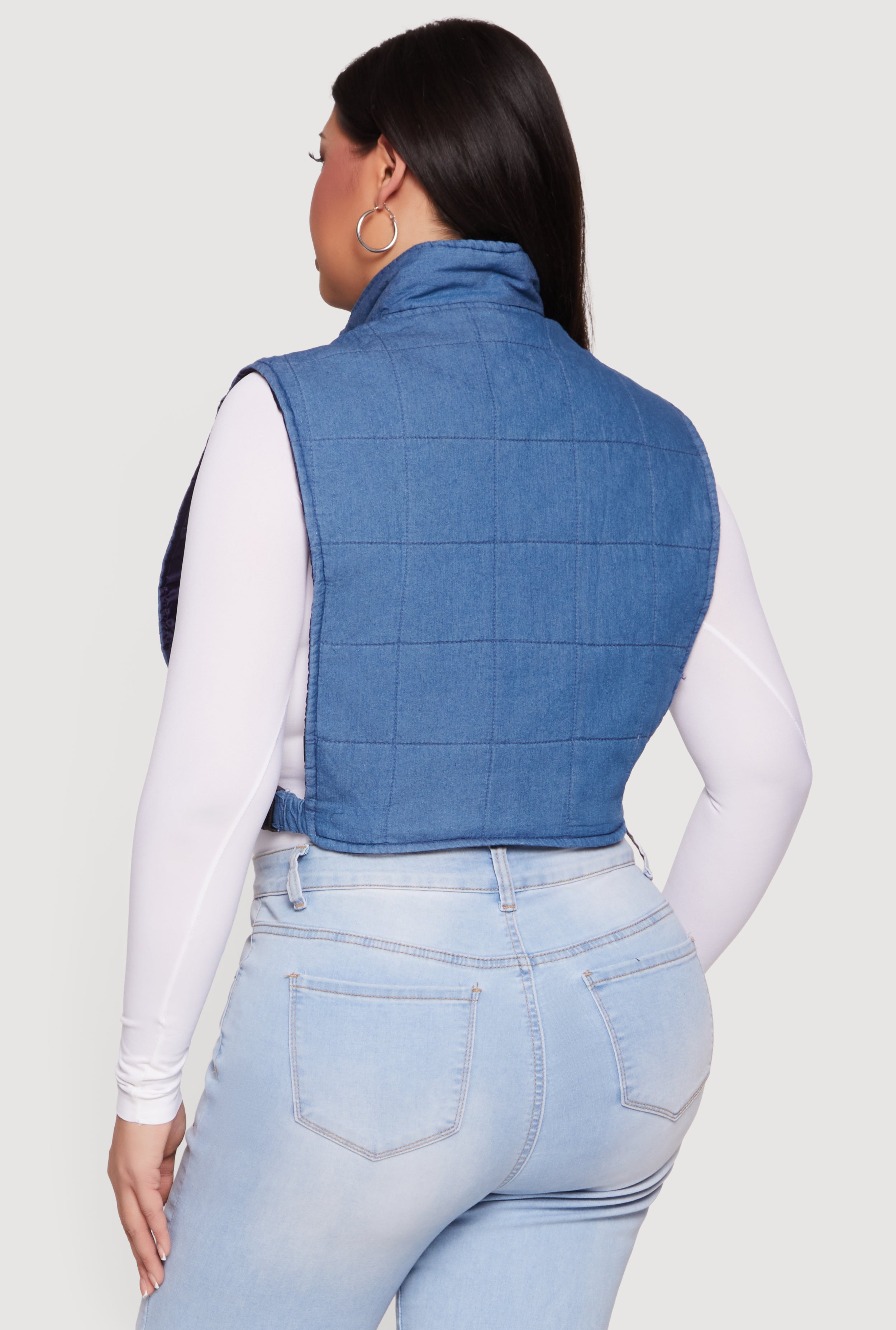 This quilted vest features a sleek mock neck and sleeveless design, perfect for layering. It closes with a zipper and snap buttons for added security. Crafted from chambray, it offers a structured yet lightweight feel to elevate your outerwear game.
