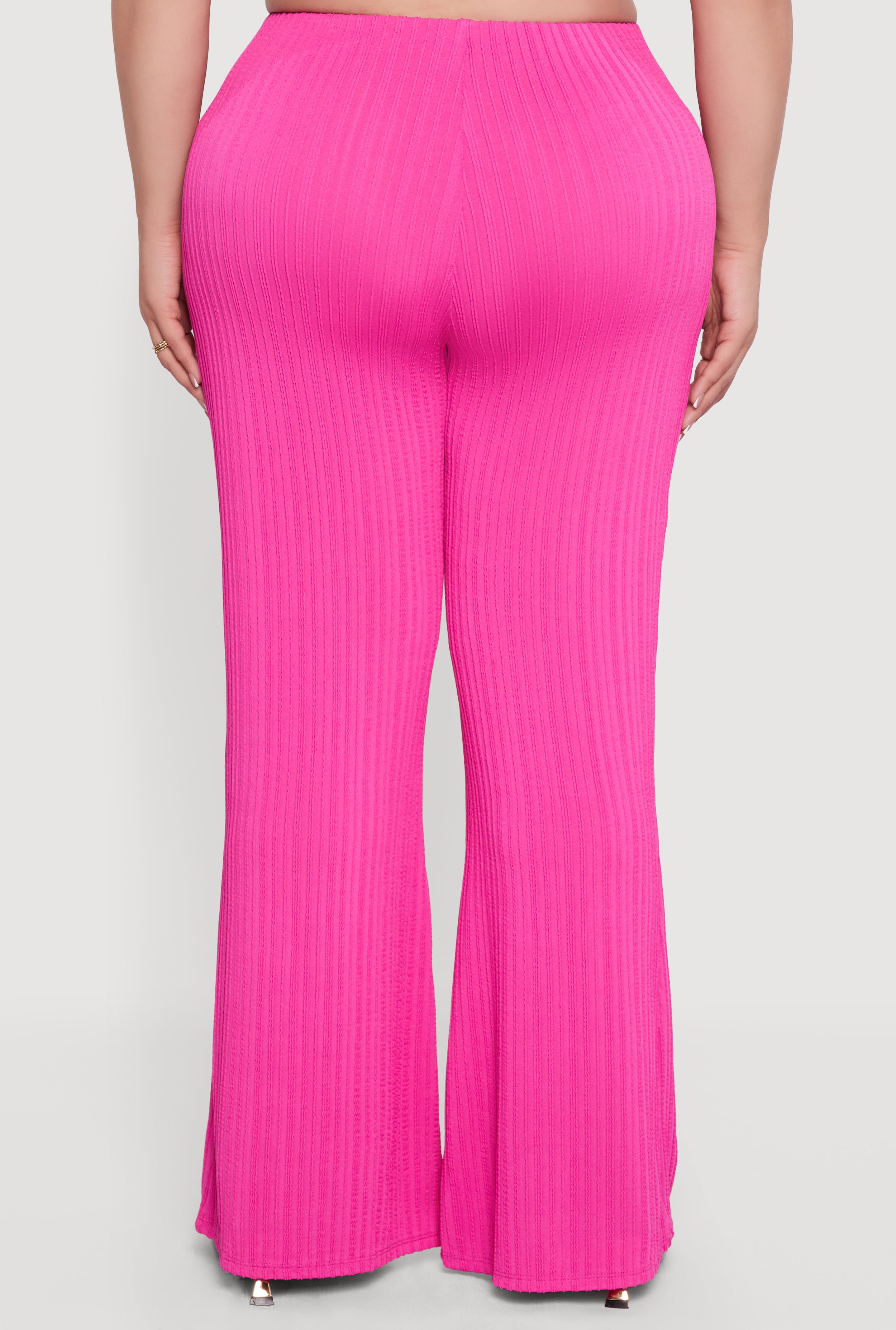 Step out in style with these Plus Size High Waisted Metallic O Ring Flare Pants that bring a fresh twist to your casual wardrobe. Featuring a flattering high waist and a bold metallic finish, these pants hug your curves with a classic compression rib fabric while adding a fun flare-leg silhouette that moves with you. Perfect for turning heads at brunch or a night out, they combine comfort and statement-making style effortlessly.