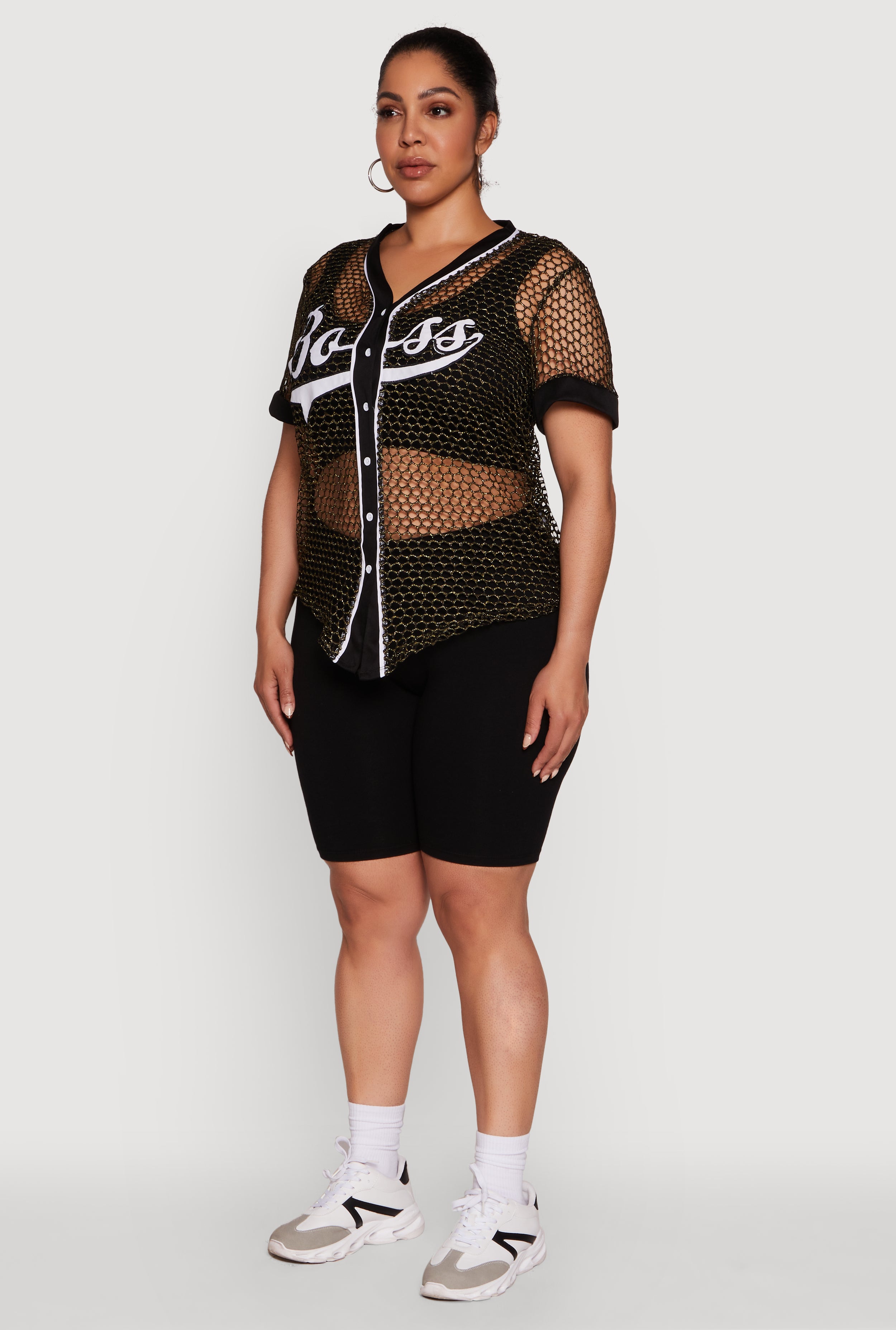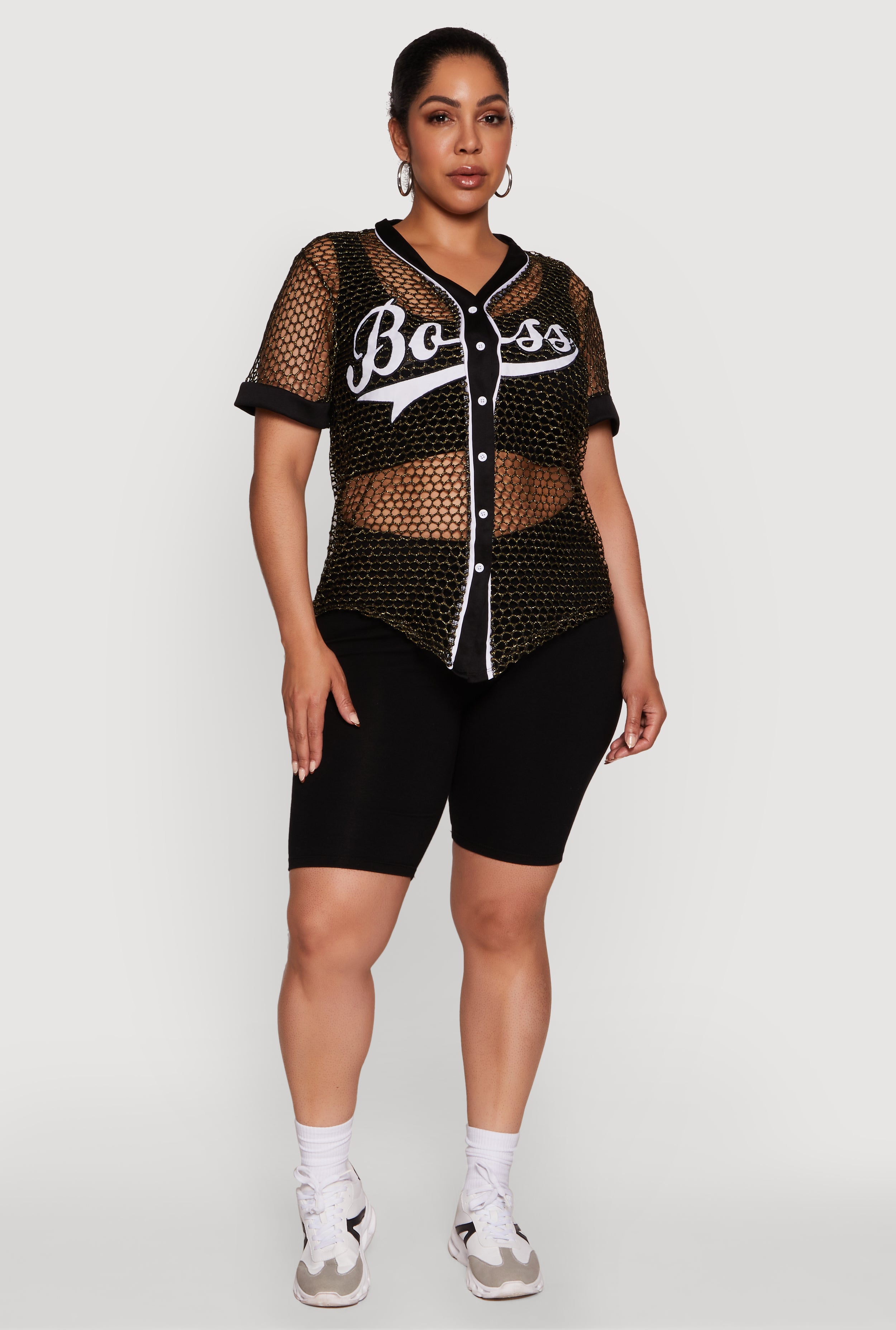 Make a bold statement with our Plus Size Lurex Fishnet Boss Graphic Baseball Tee. Featuring a striking "Boss" graphic and a shiny lurex twist, this tee is perfect for turning heads and showing off your confident style. The classic fit and timeless silhouette ensure you stay comfortable while looking effortlessly cool. Whether you’re out with friends or just vibing solo, this v-neck tee adds that perfect pop of personality to any outfit.