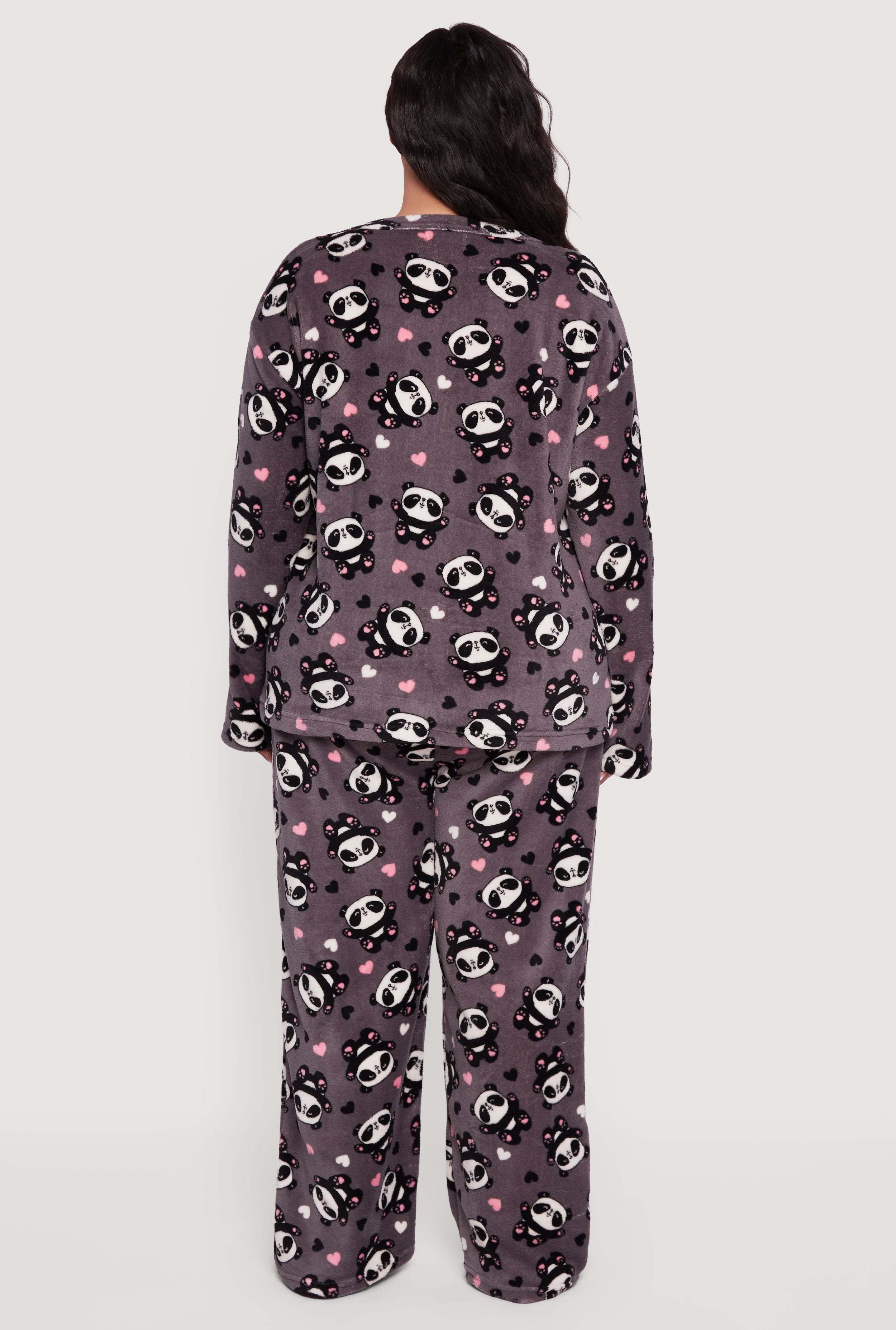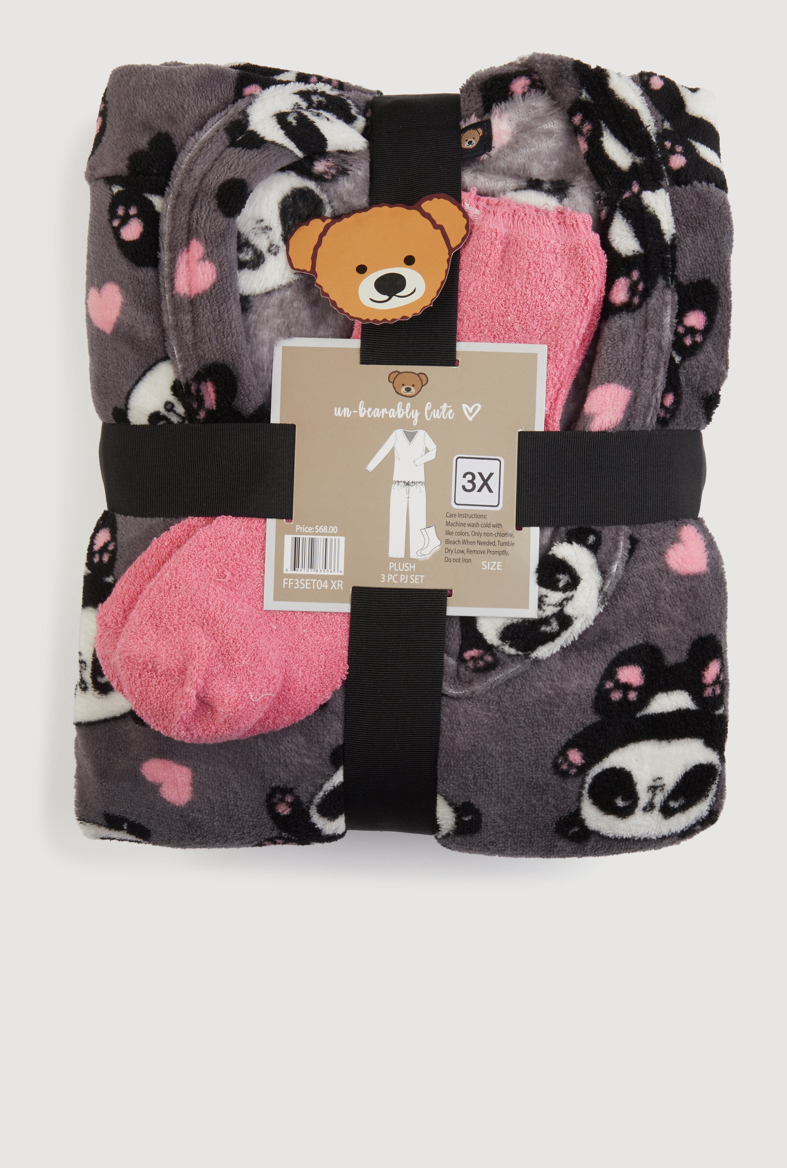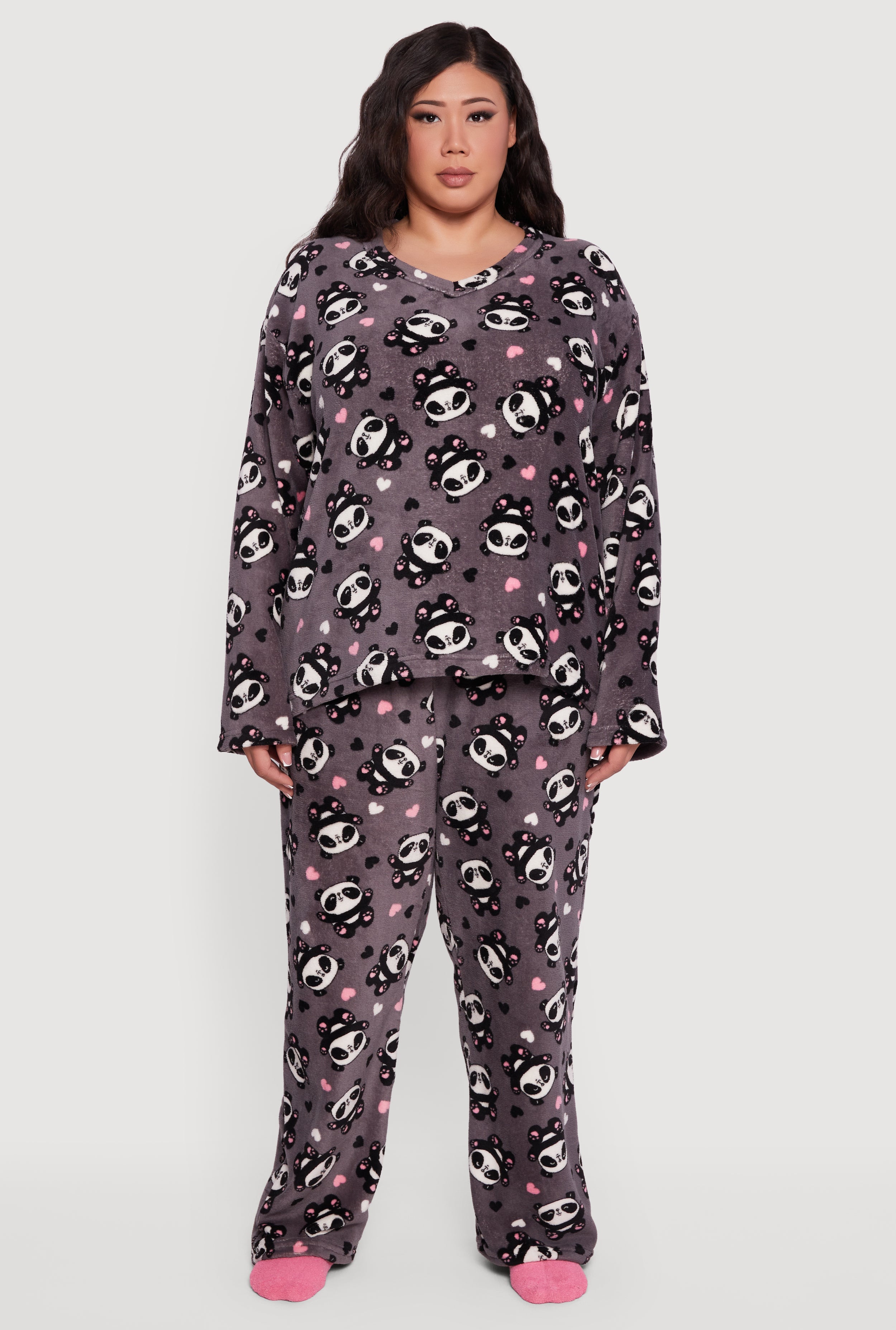 Snuggle up in style with this Plus Size Panda Pajama Top and Pants with Socks Gift Set that’s as cozy as it is cute. Featuring a plush fabric that feels like a warm hug, this 3-piece set includes a long sleeve V-neck top, wide leg lounge pants with a comfy drawstring waist, and matching socks to keep your toes toasty. Perfect for lazy days or chill nights, this classic fit loungewear set brings playful vibes and ultimate comfort together effortlessly.