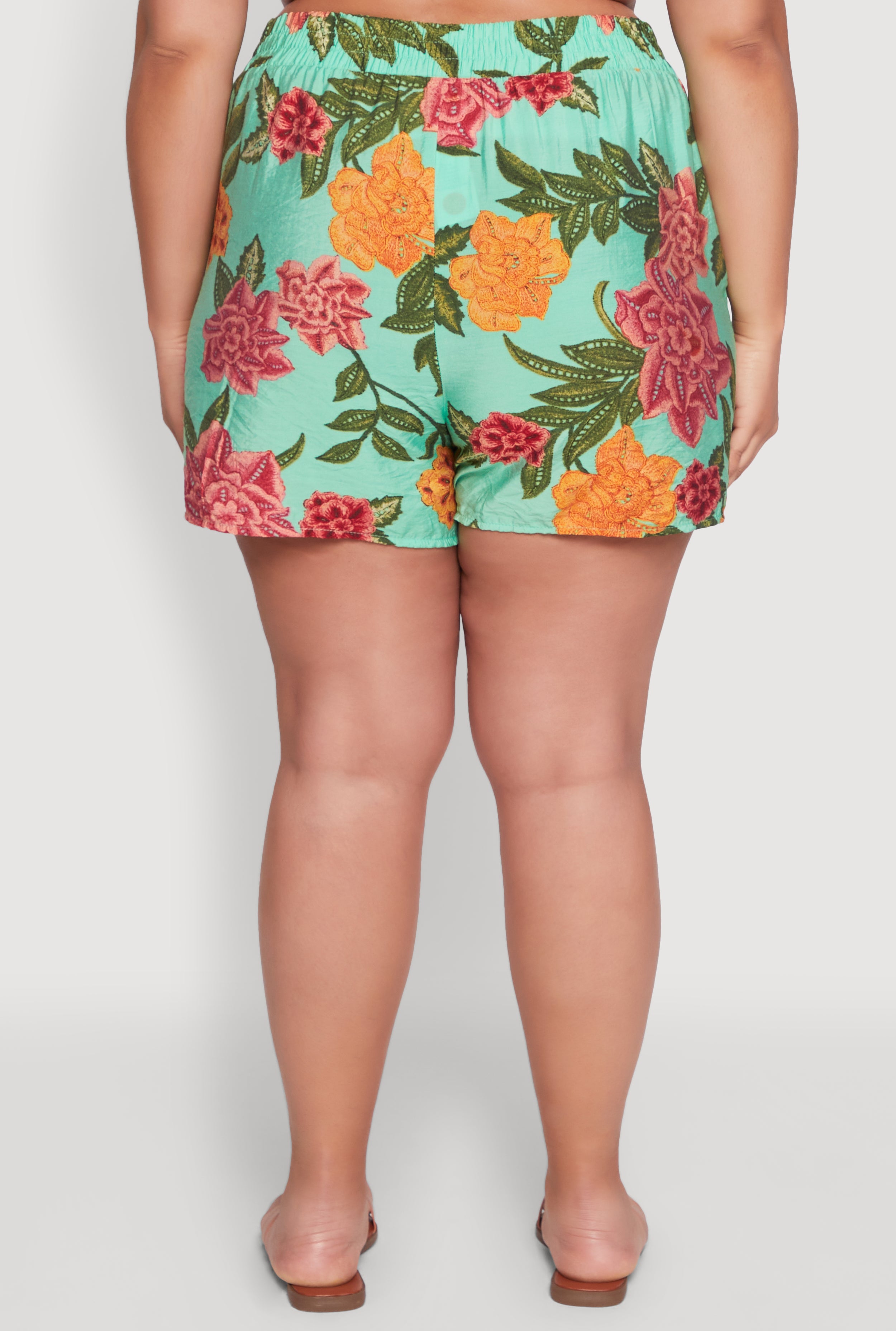 Step into summer with confidence and style in our Plus Size Floral High Waisted Pull On Shorts. Featuring a vibrant floral pattern and a comfy elastic waist, these shorts are your new go-to for effortless chic. Whether you're lounging or out and about, their high rise and soft crepe knit fabric keep you feeling cool and looking fabulous all day long.