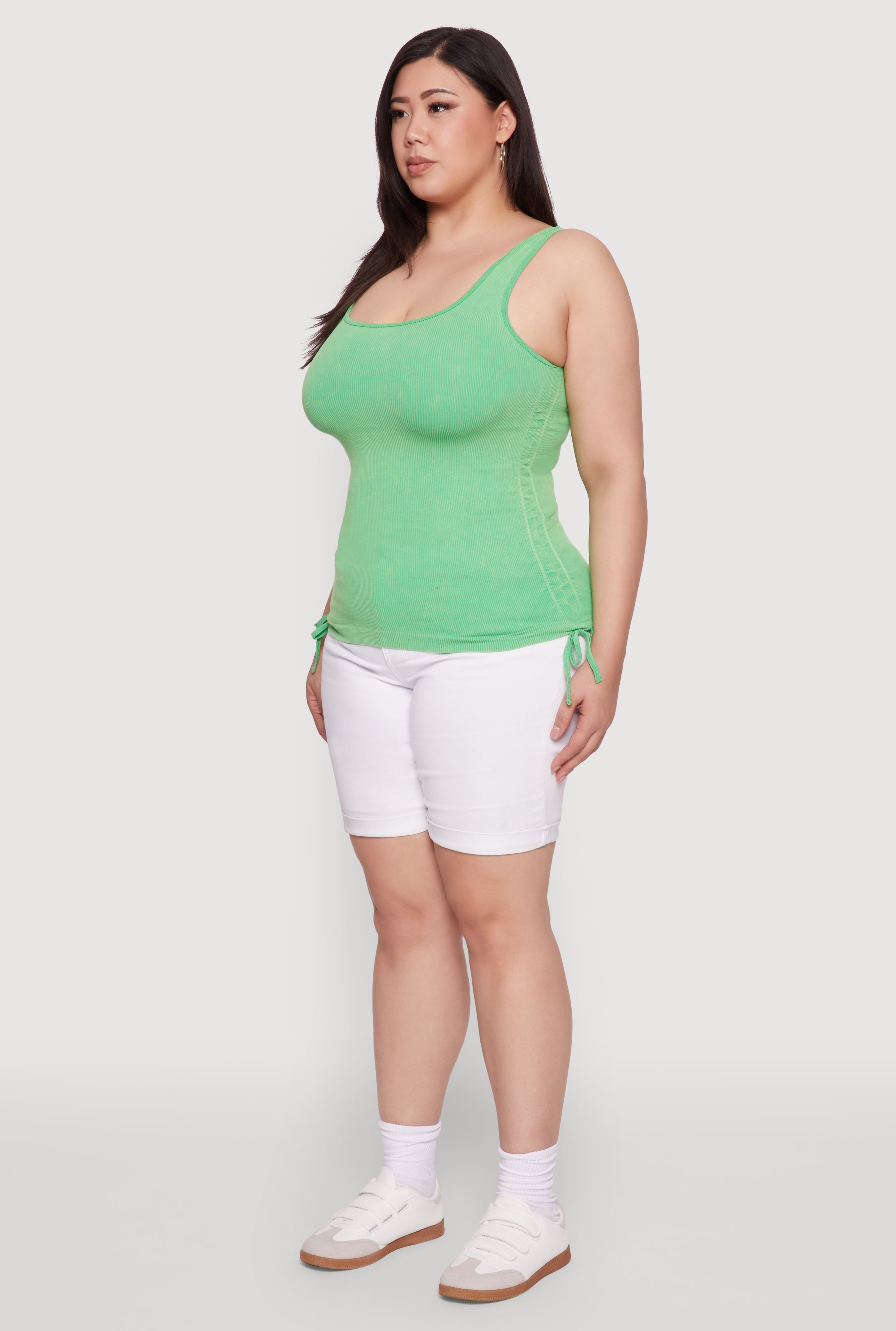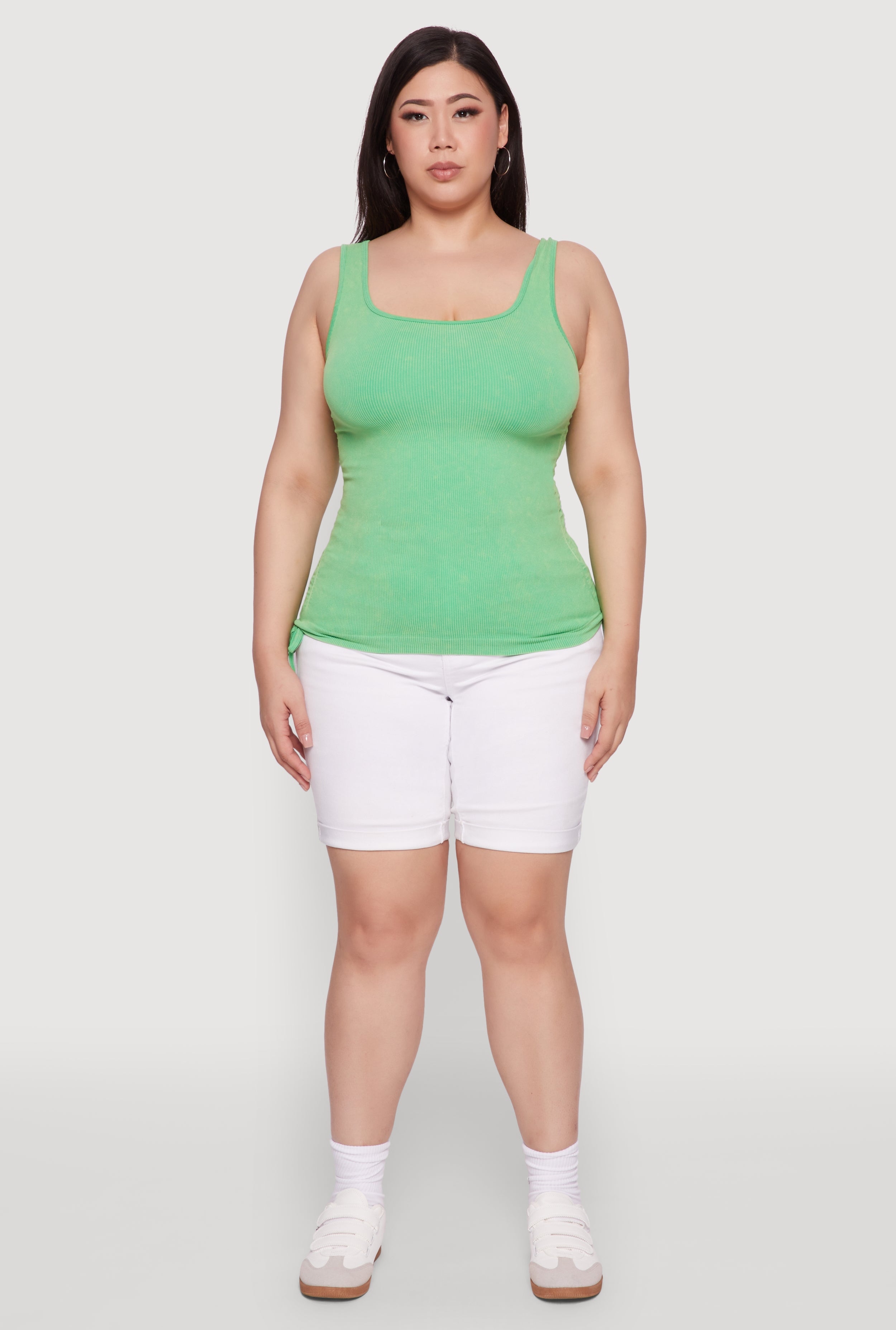 Upgrade your wardrobe with our Plus Size Trendy Mineral Wash Side Ruched Tank Top, the perfect blend of comfort and style. Featuring a cool mineral wash finish and a flattering scoop neck, this sleeveless tank is your go-to for casual days or a night out. Its classic fit and timeless silhouette ensure you'll look effortlessly chic while feeling confident in your skin. The faux drawstring and ruching details add a touch of trendy flair, making this top a must-have for any fashion-forward wardrobe. Whether you're lounging or out with friends, this seamless ribbed knit tank will keep you looking fabulous all day long.
