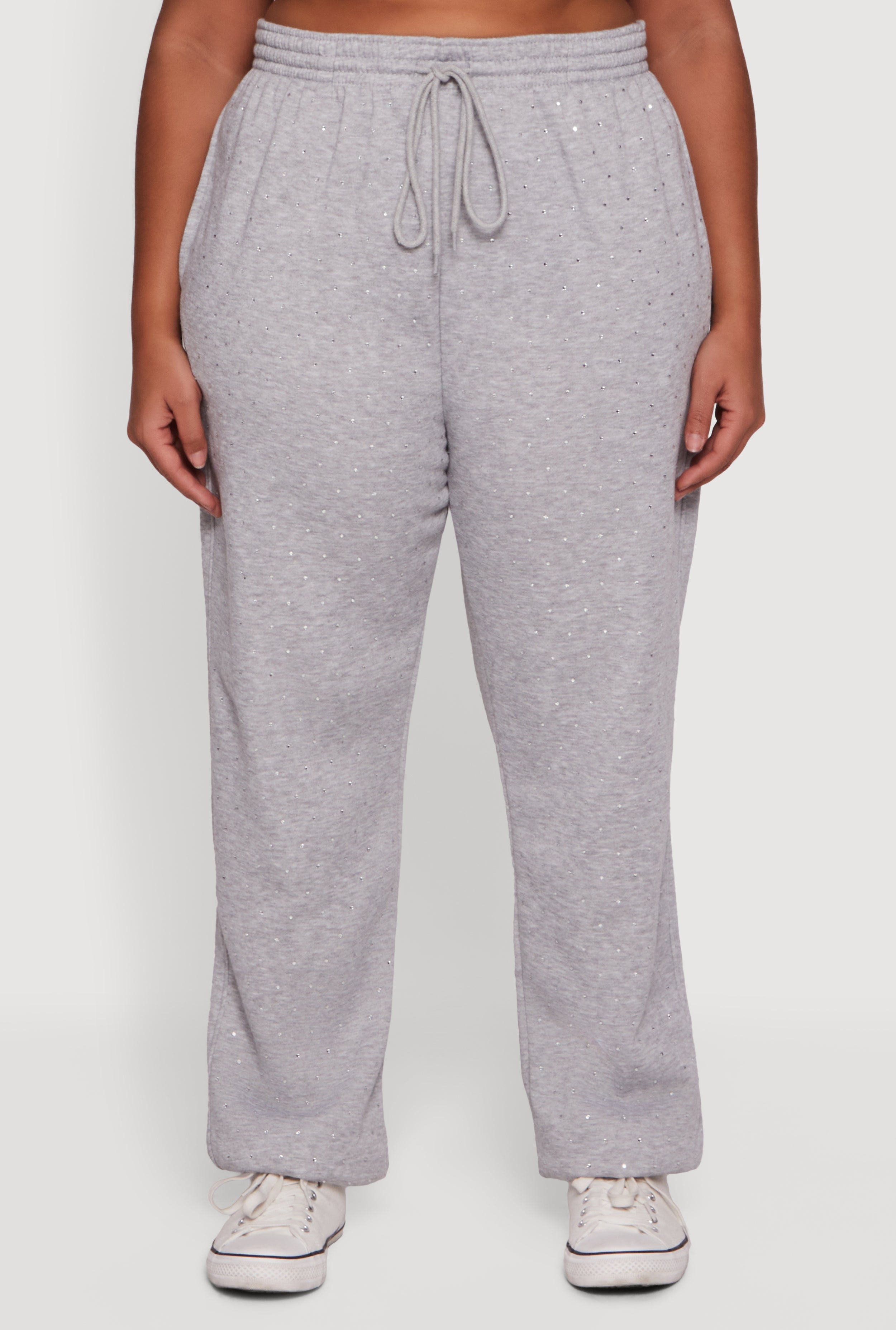 Step up your casual game with these Plus Size Rhinestone Studded Drawstring Waist Sweatpants. Designed to keep you comfy and stylish, these sweatpants feature a high-waisted fit and a taper leg silhouette that flatters your curves. The soft fleece fabric feels cozy against your skin while the sparkling rhinestone studs add just the right amount of glam to your everyday look. Perfect for lounging, running errands, or casual hangouts, these sweatpants combine comfort and chic effortlessly.