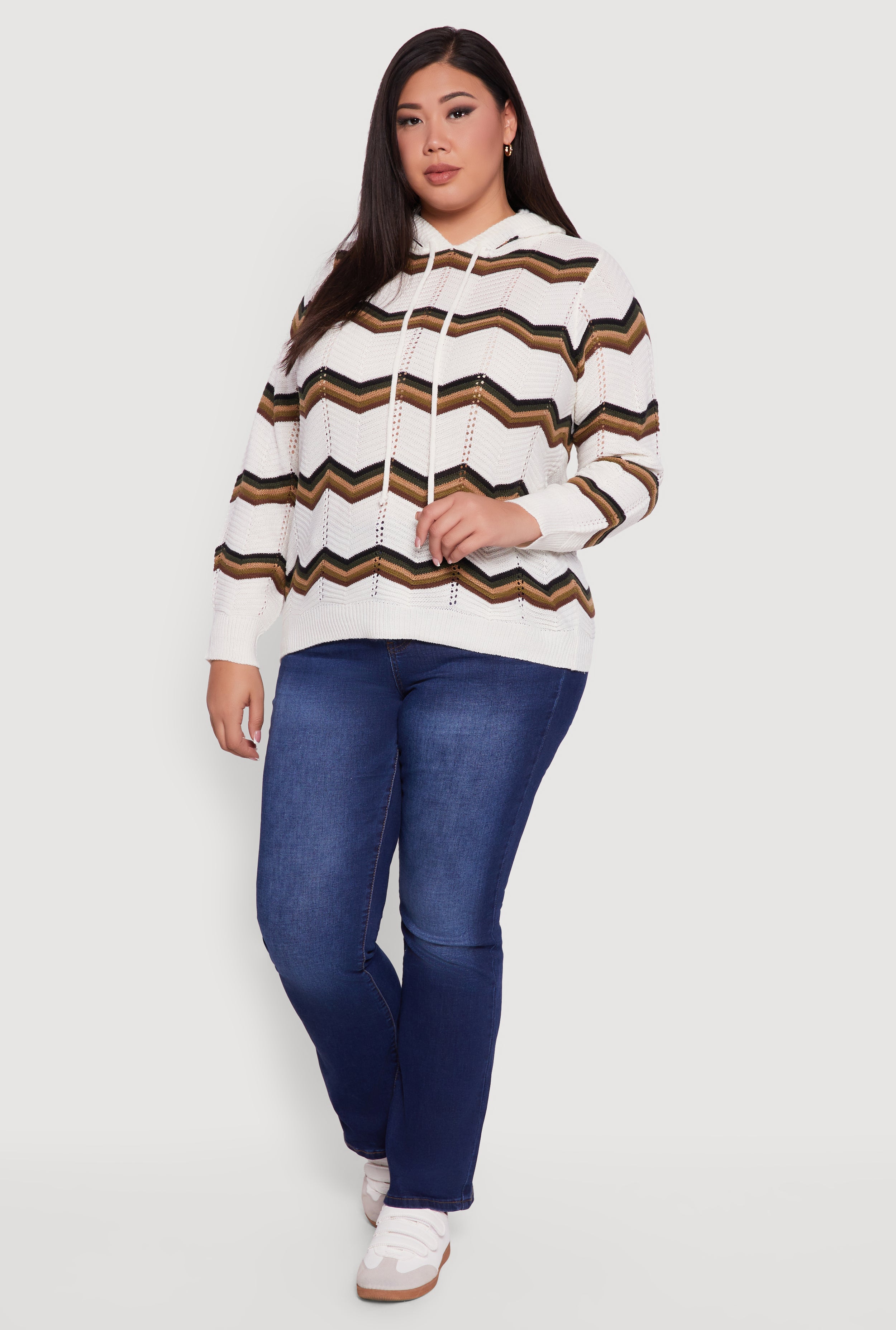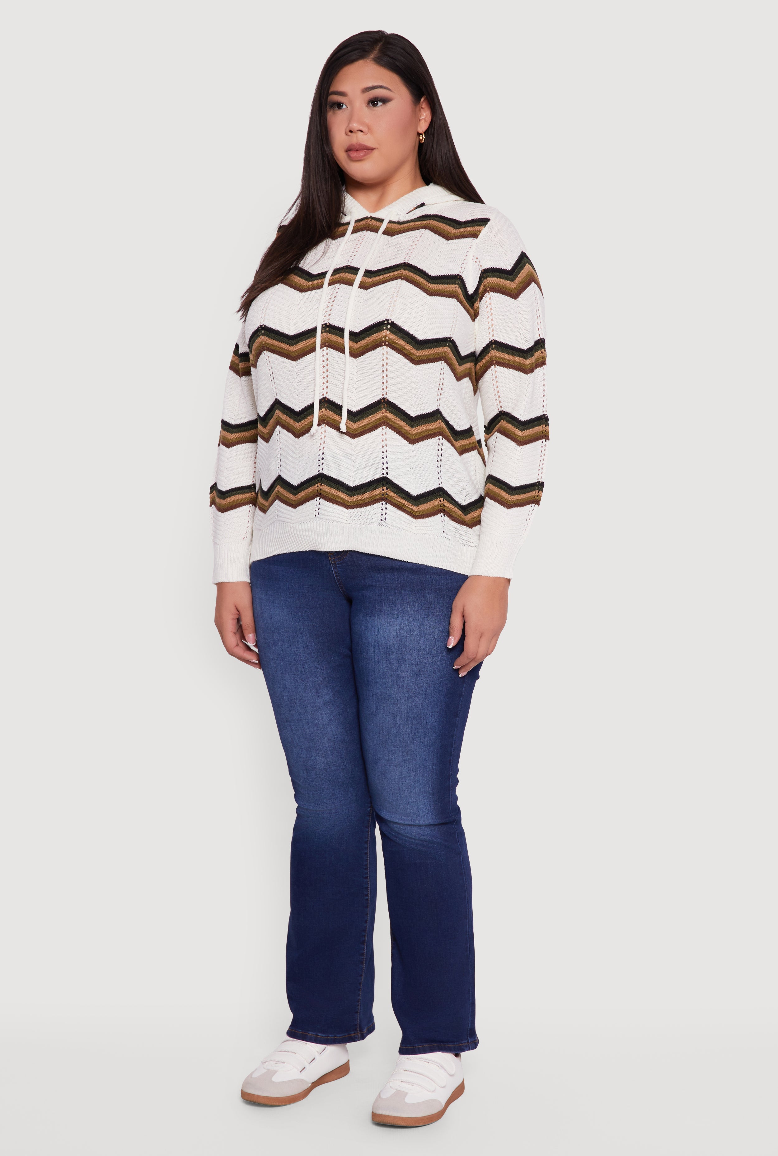 Step into cozy vibes with the Plus Size Chevron Pointelle Knit Hooded Pullover Sweater. Designed with a timeless classic fit, this sweater combines the airy charm of pointelle knit with a trendy chevron pattern for a look that’s effortlessly cool. The hood adds a laid-back edge, perfect for layering on those chill days or casual outings. Whether you’re lounging at home or out with friends, this pullover delivers comfort and style without breaking the bank.