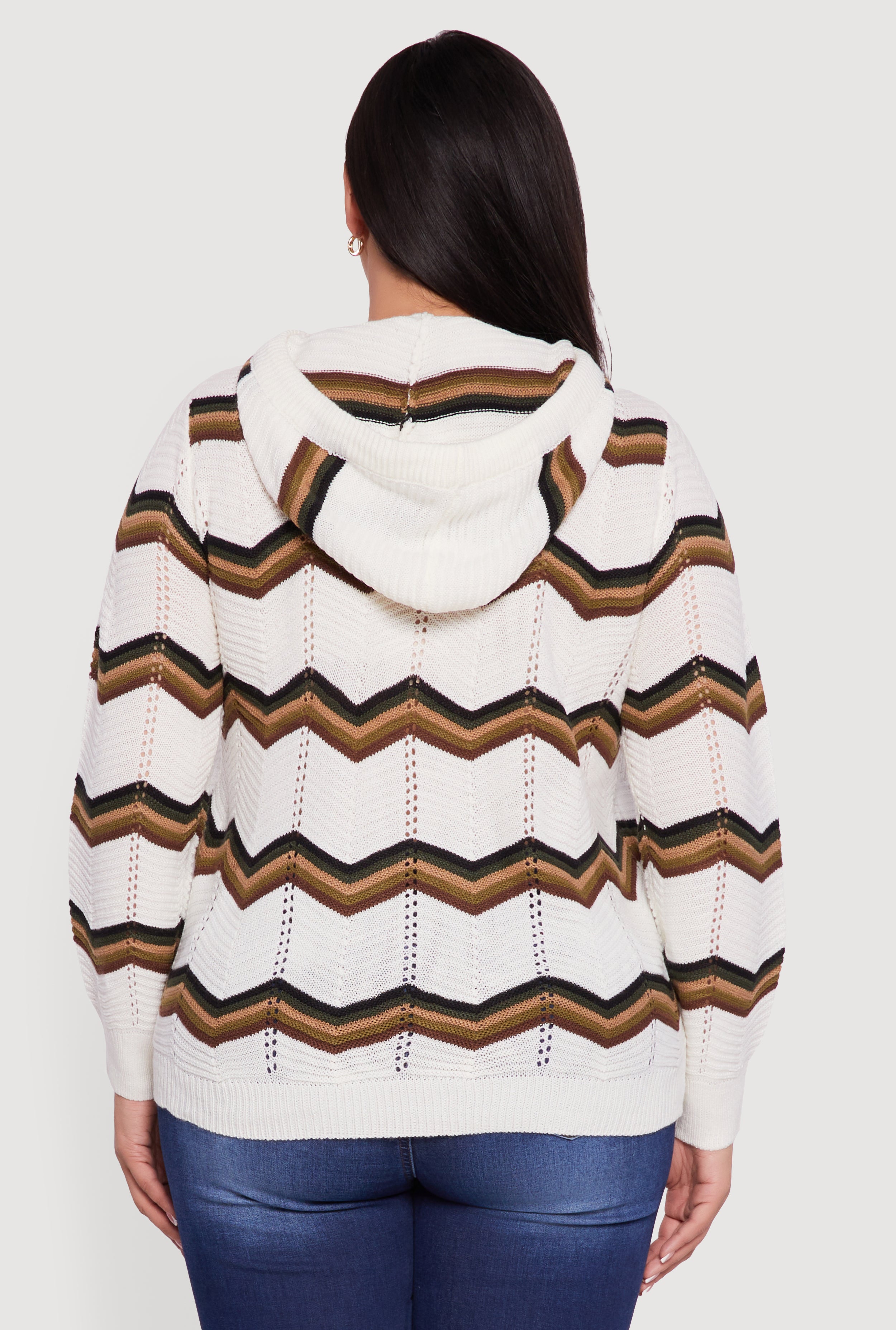 Plus Size Chevron Pointelle Knit Hooded Pullover Sweater