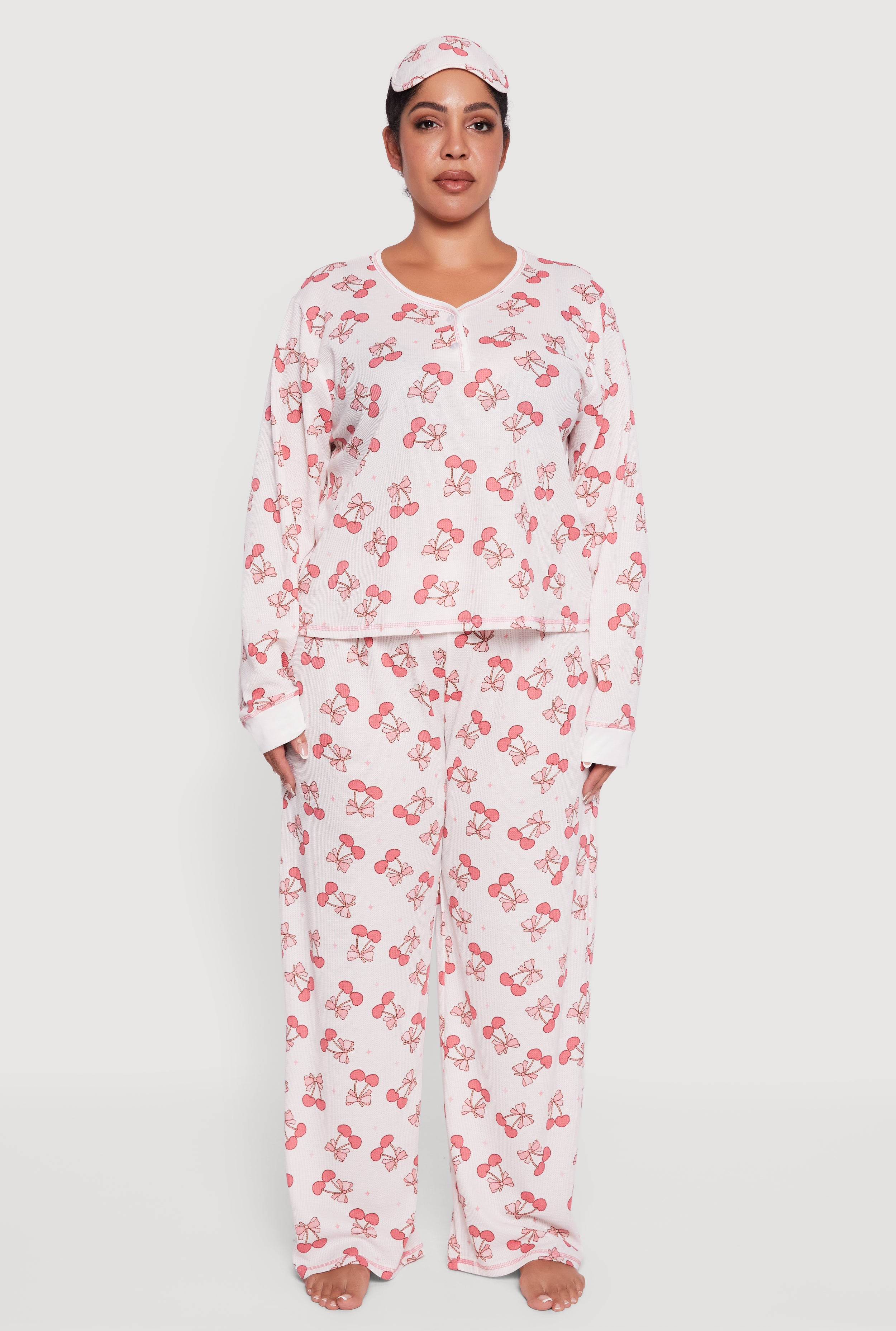 Cozy up in style with this Plus Size Cherry Bow Print Waffle Knit Thermal Pajama Gift Set. Designed for ultimate comfort and festive vibes, this relaxed fit set features a soft waffle knit fabric with charming hearts, cherries, and bow prints. The full-length wide-leg lounge pants and long-sleeve henley pajama top create an easy silhouette perfect for chilly nights or lazy mornings. Plus, the included eye mask makes it a perfect gift to treat yourself or someone special this holiday season.