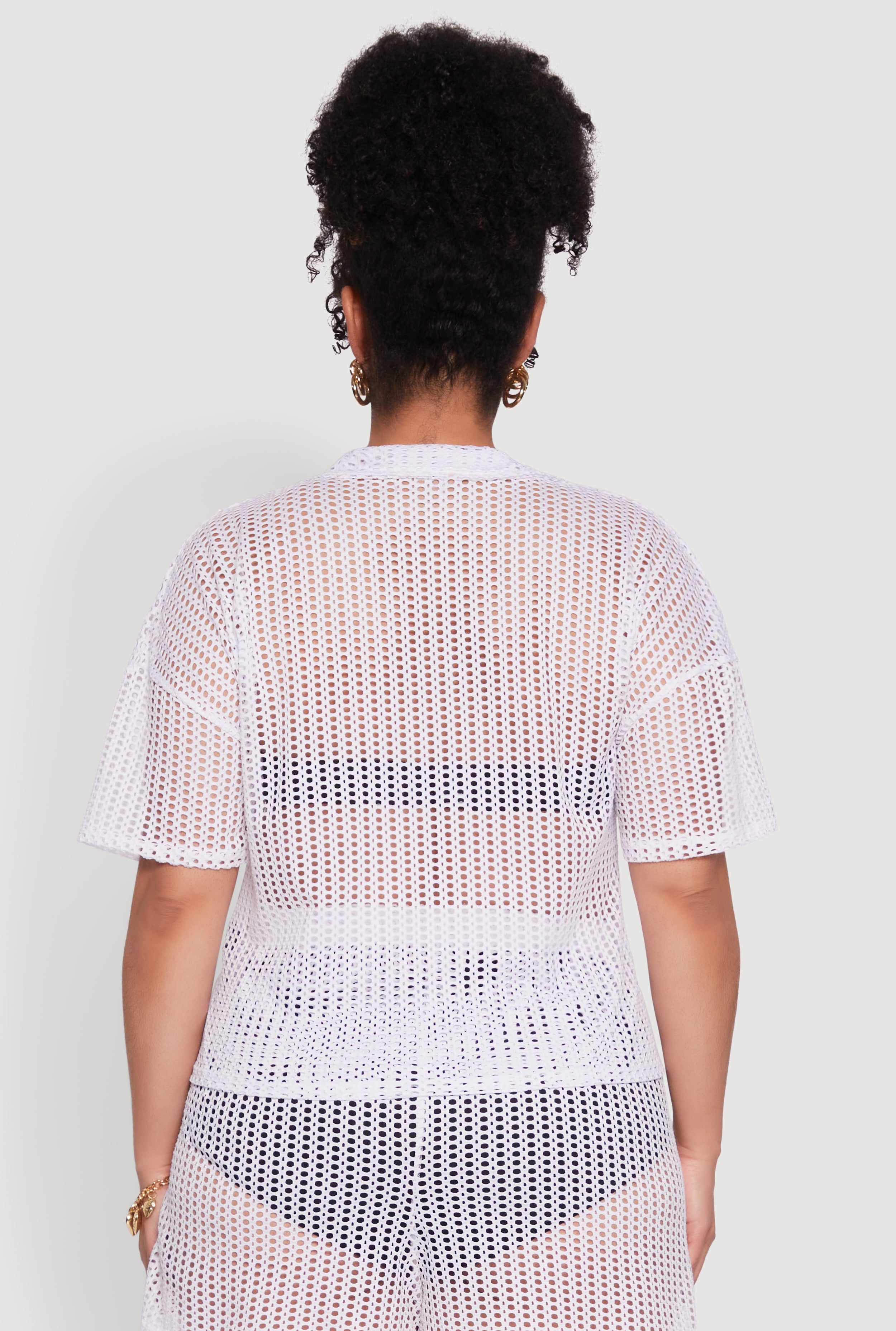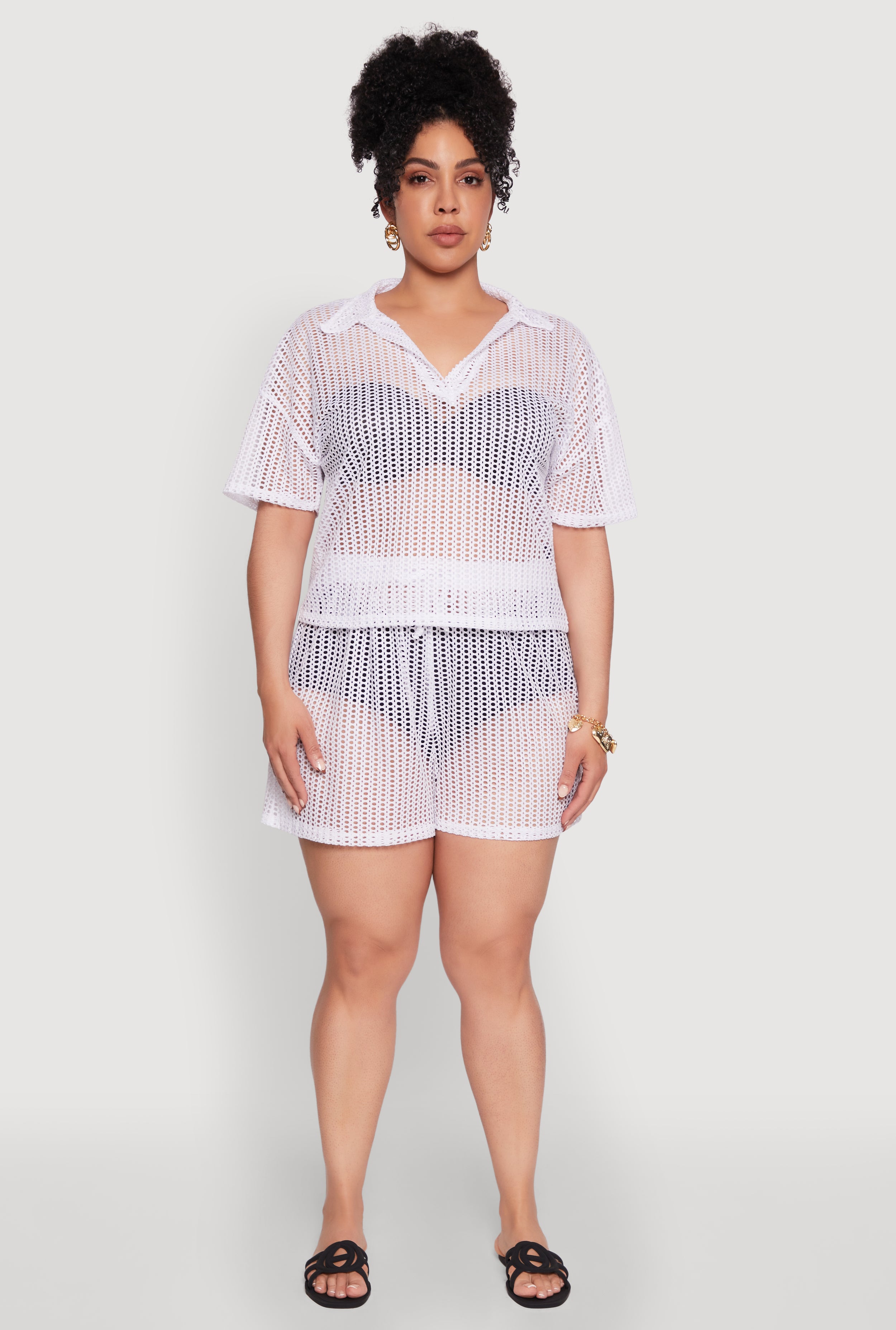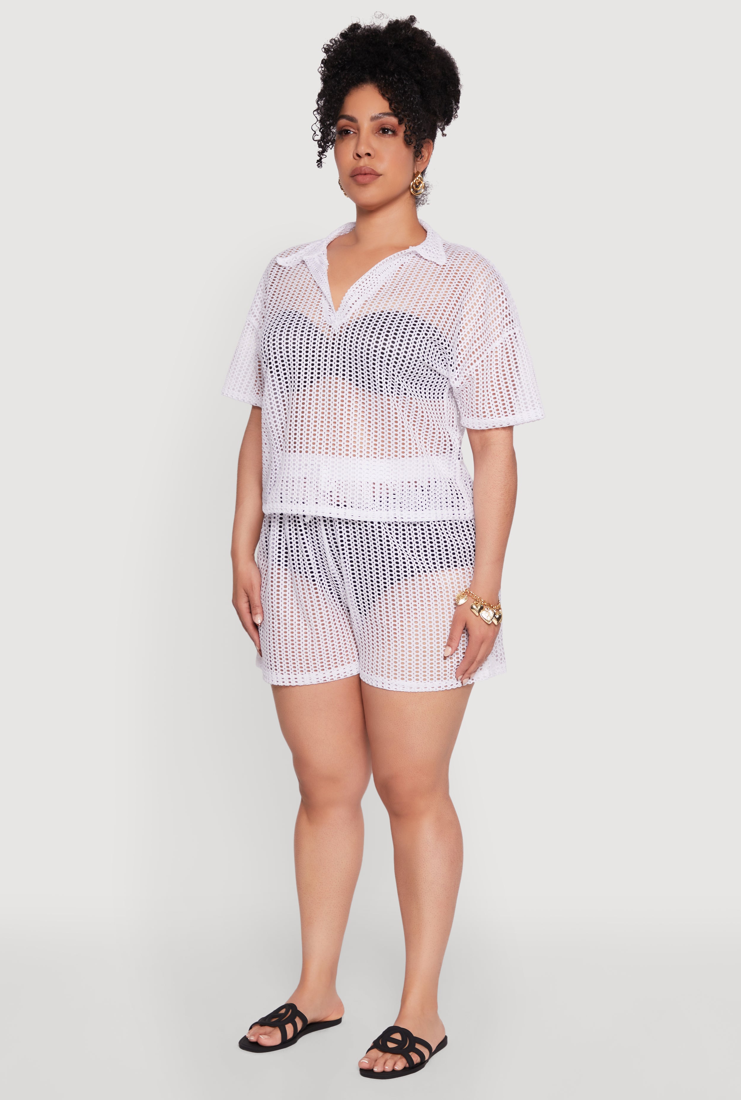 Elevate your wardrobe with our Plus Size Laser Cut Collared Short Sleeve Top. This chic and breezy top combines a classic fit with a modern twist thanks to the intricate laser cut design and sheer fabric. Perfect for dressing up or down, it’s your go-to piece for effortless style and comfort. Whether you're heading out for brunch or a casual day with friends, this blouse adds a touch of sophistication and fun to any look. Pair it with your favorite undergarments (sold separately) and let your personality shine through.