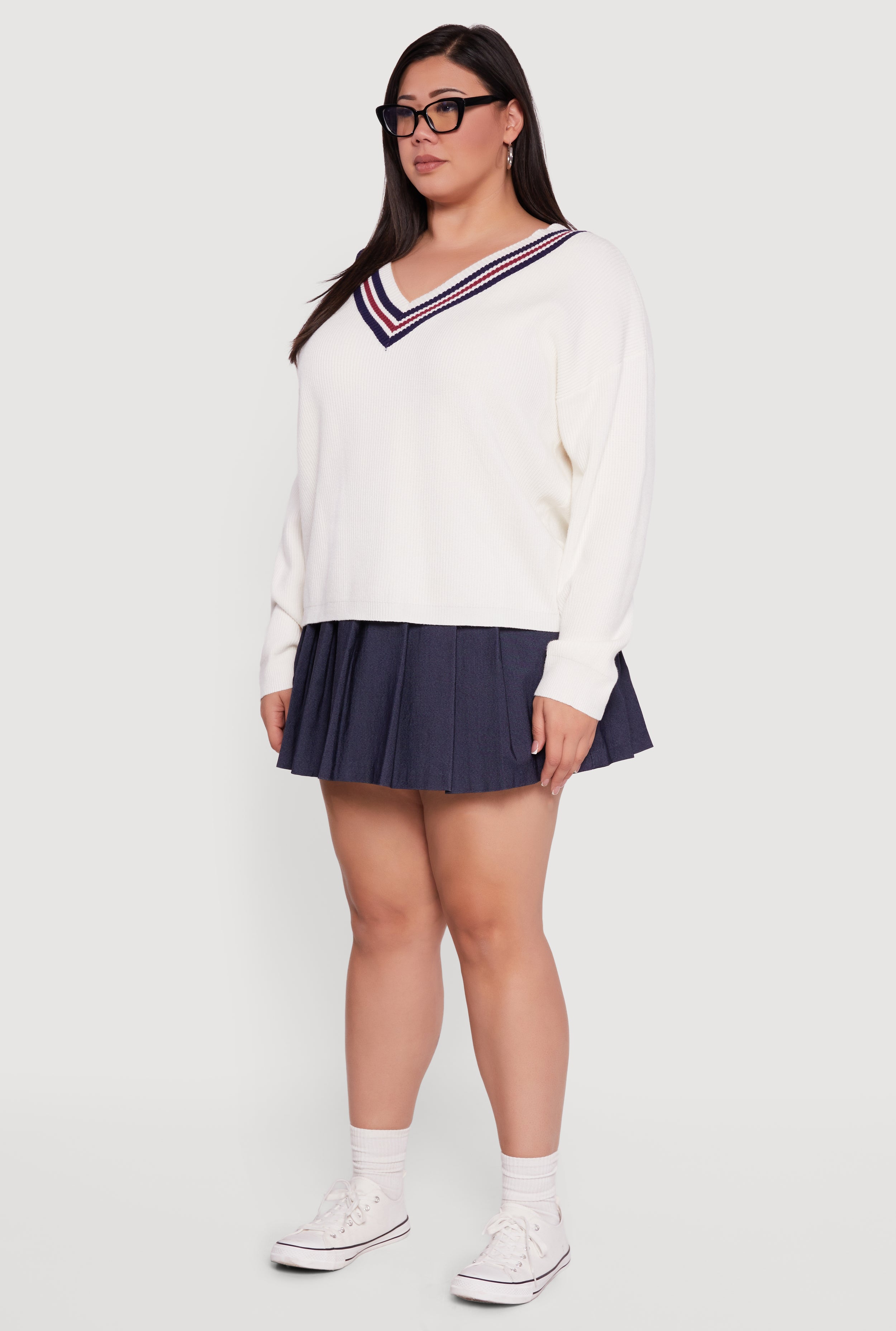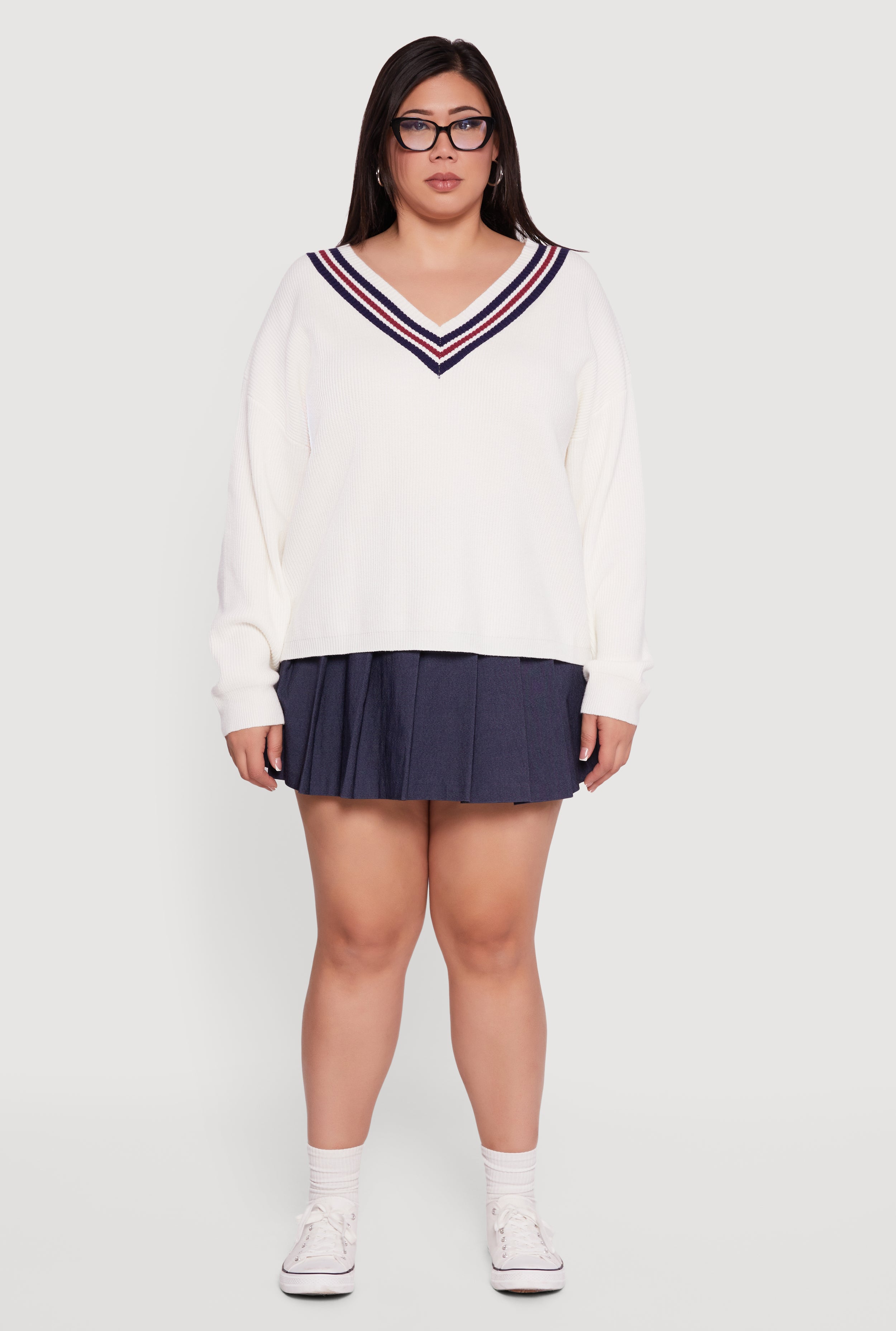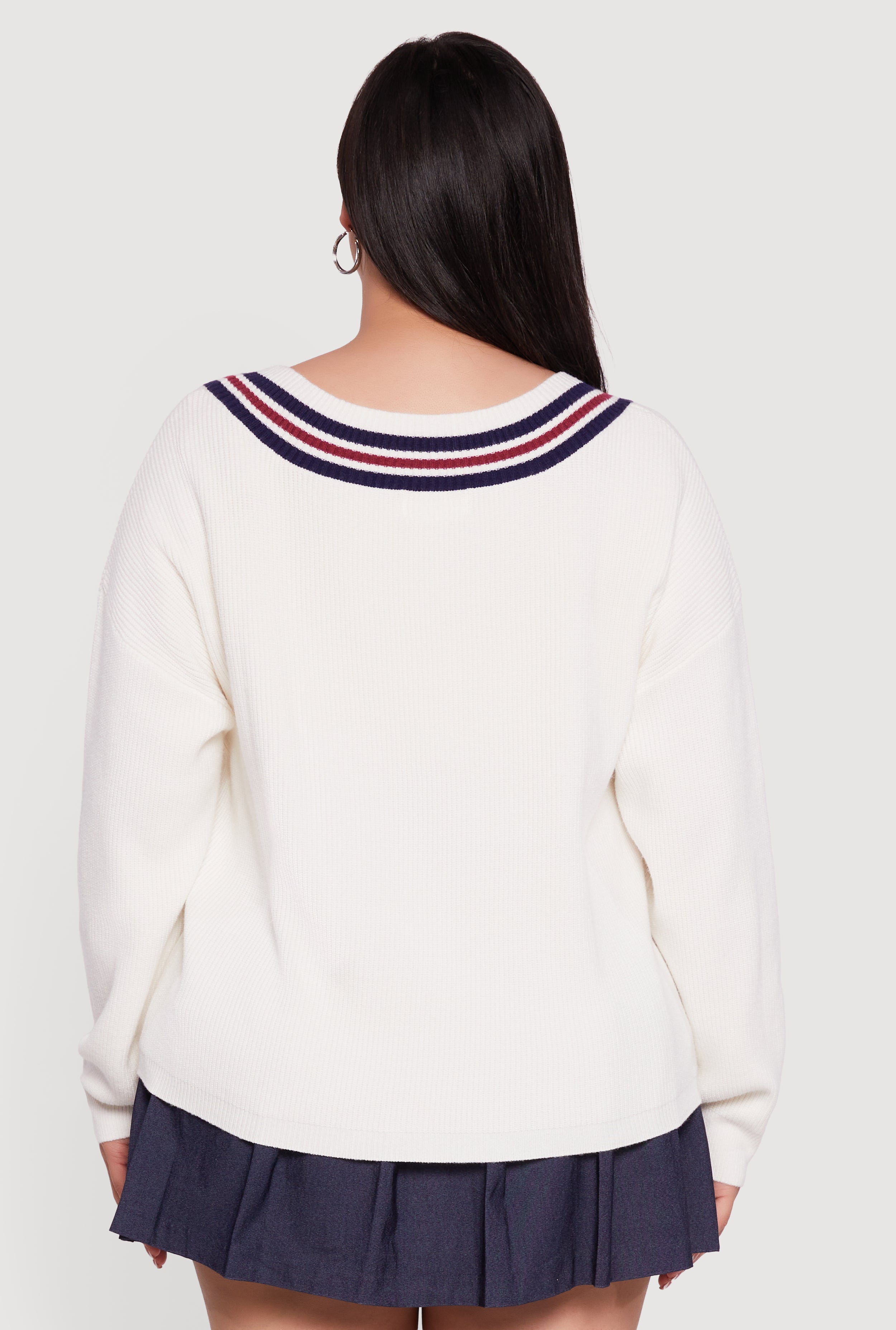 Step into cozy cool with this Plus Size Oversized Varsity Stripe V Neck Sweater. Designed for a classic fit that flatters every curve, this ribbed knit sweater brings laid-back vibes with a sporty twist. The oversized silhouette and drop shoulder sleeves create that effortlessly chic look you crave, while the varsity stripe detail adds a fun, retro edge. Perfect for casual days or athleisure style, it’s the go-to top to keep you comfy and stylish all season long.