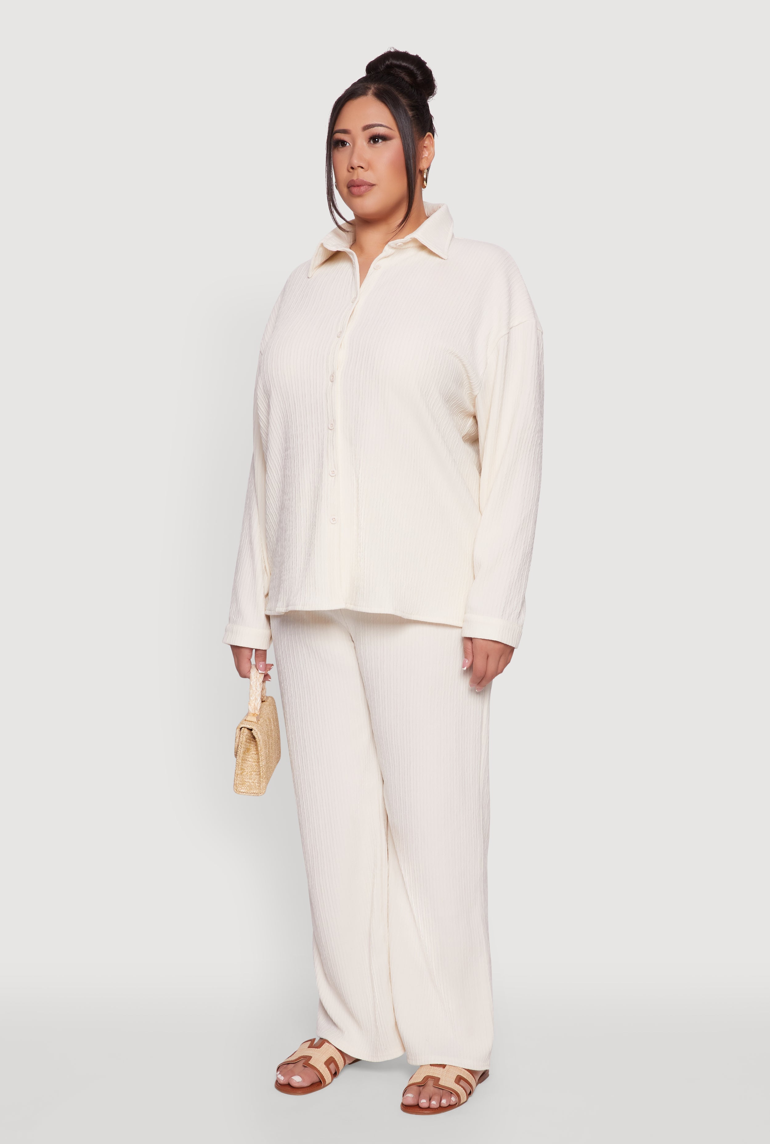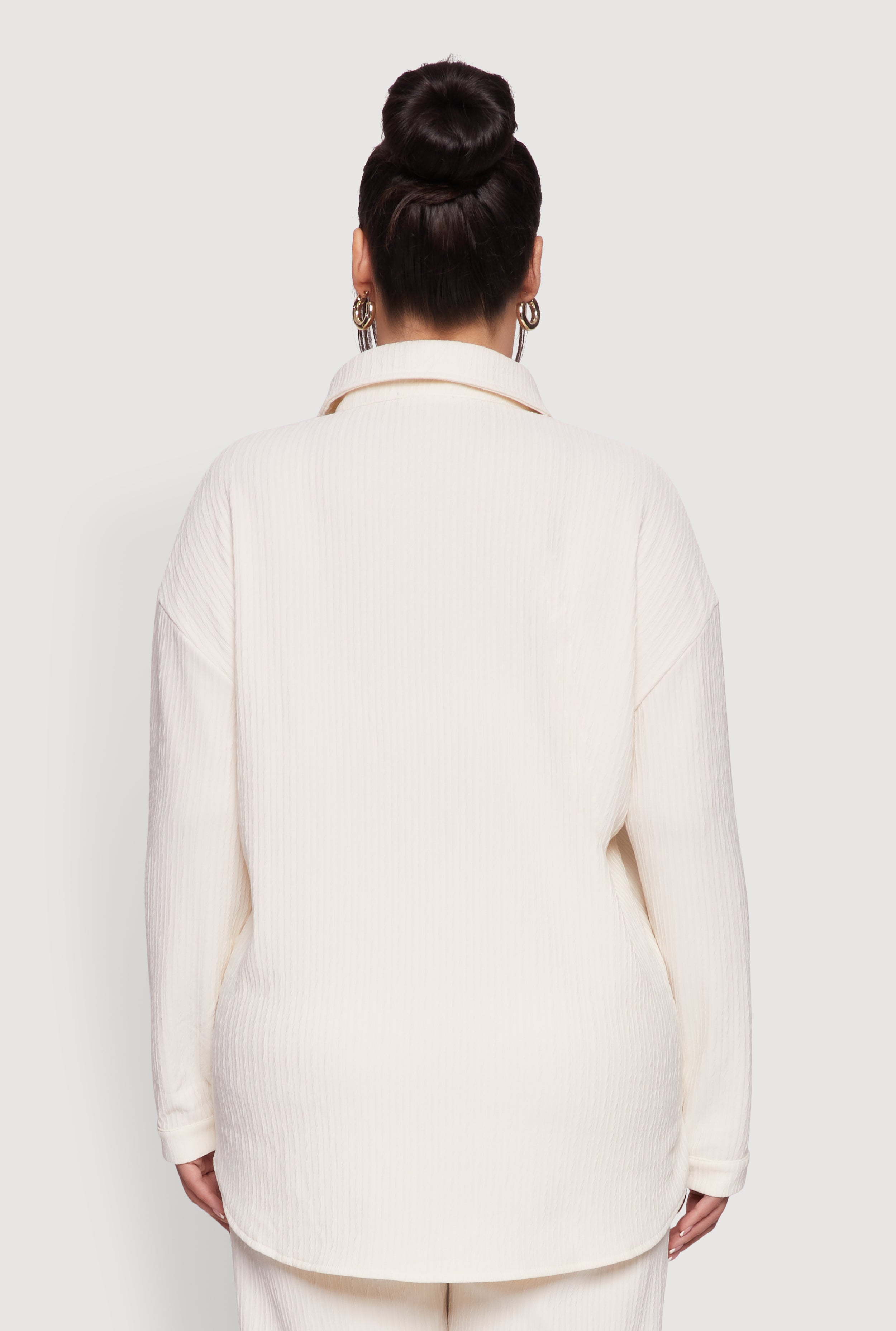 Plus Size Textured Knit Solid Button Front Long Sleeve Shirt
