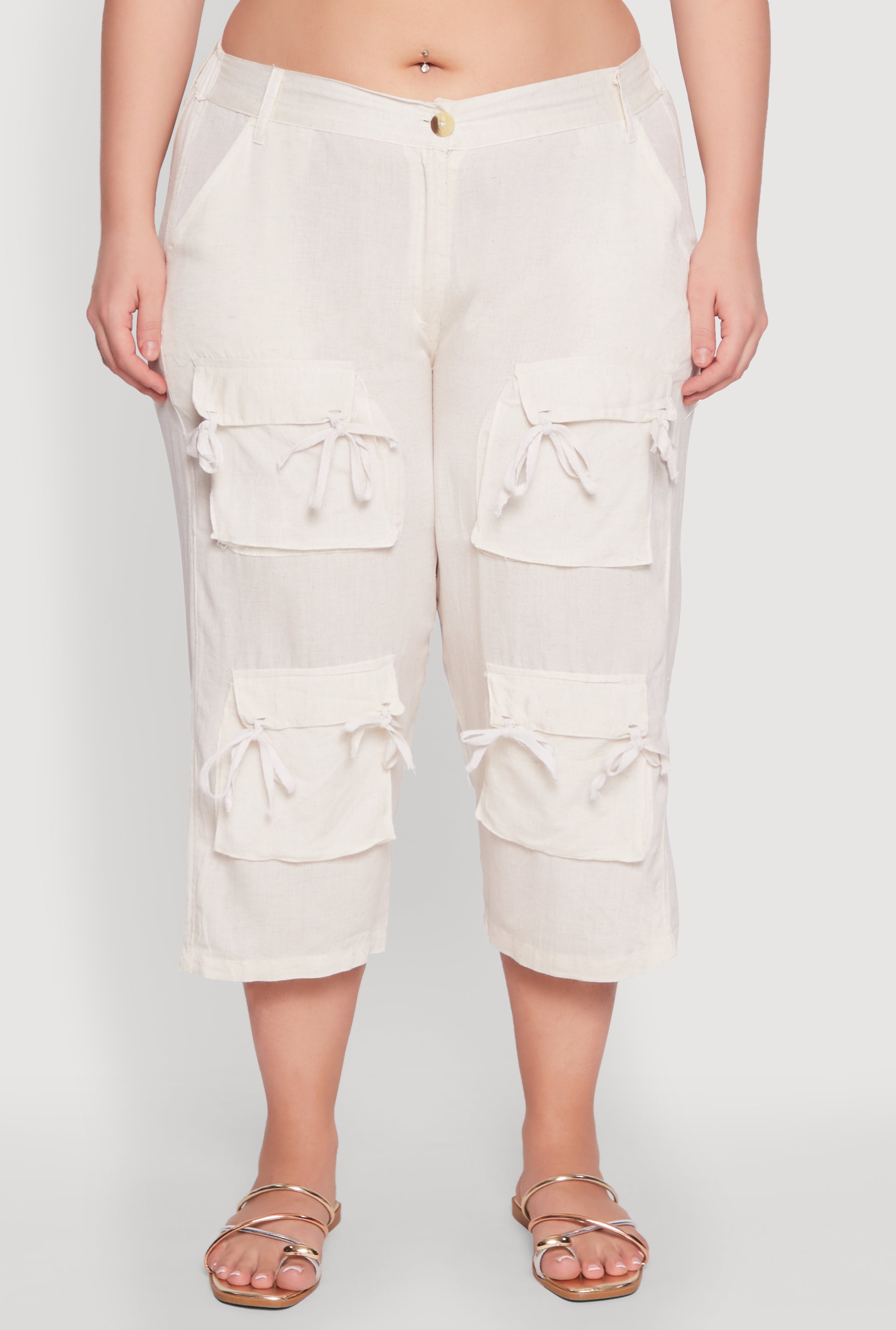 Step into effortless style with our Plus Size Tie Cargo Pocket Capri Pants. Designed for comfort and everyday chic, these high-waisted capris are perfect for adding a touch of casual cool to your wardrobe. Made from lightweight linen, they keep you feeling fresh and fabulous all day long. Whether you're running errands or hanging out with friends, these versatile pants are your new go-to for laid-back fashion with a trendy twist.