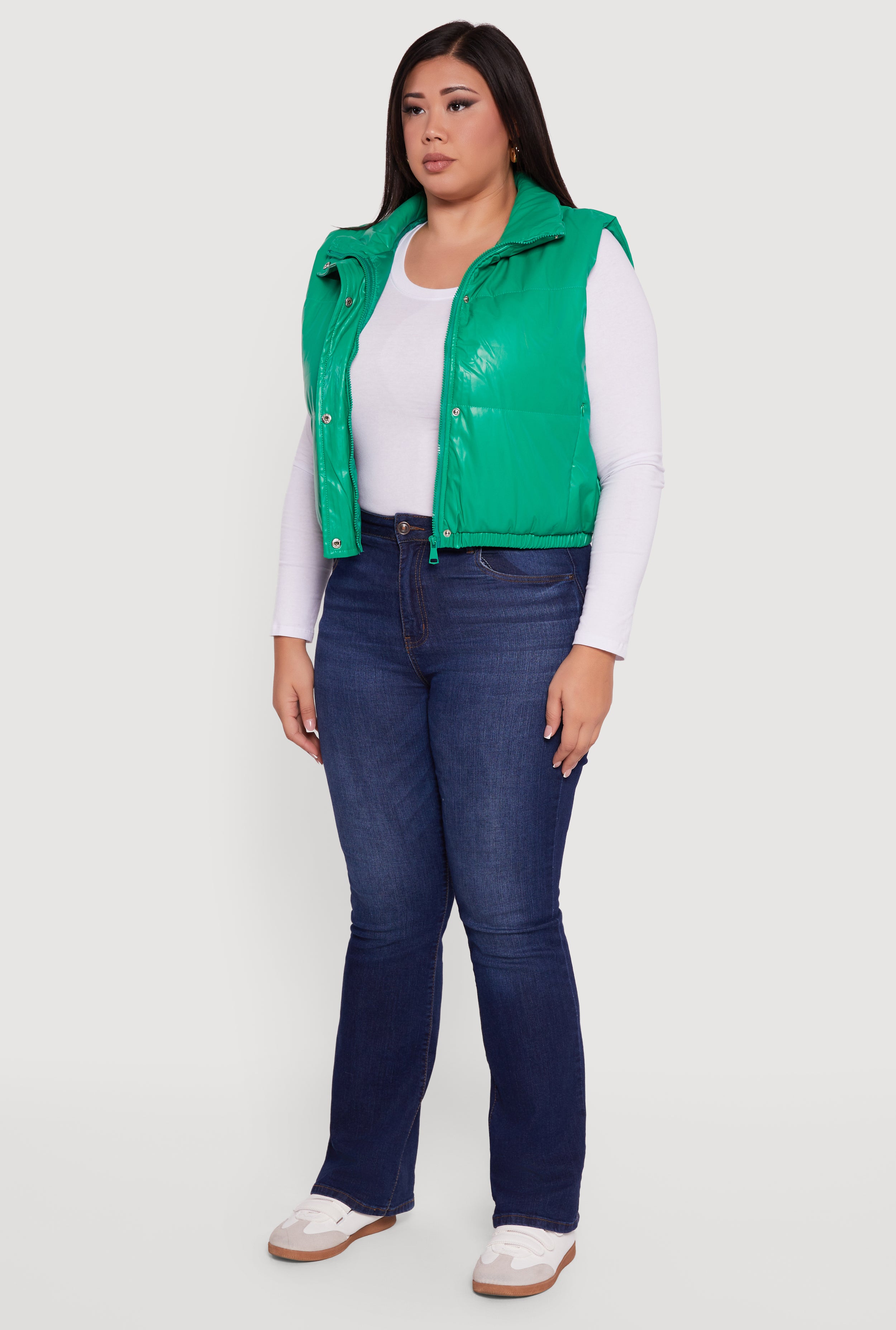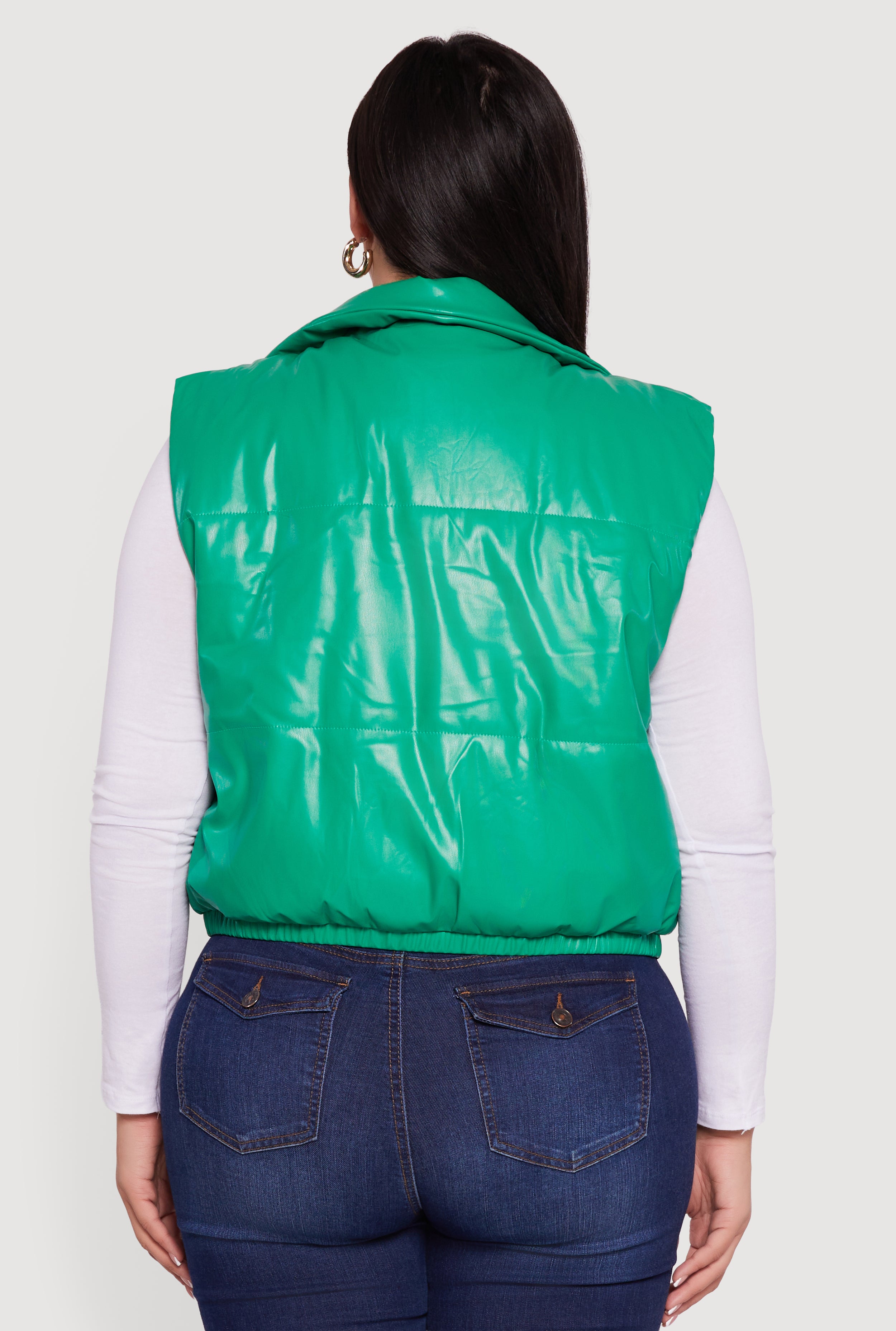 Step out in style and confidence with this Plus Size Faux Leather Snap Button Zip Front Puffer Vest. Designed to keep you cozy without sacrificing edge, this sleeveless vest features a sleek collared neckline and a trendy faux leather finish that adds instant attitude to any outfit. The snap button and zip front closure make it easy to layer over your favorite tops, while the solid pattern ensures it pairs effortlessly with everything in your wardrobe.